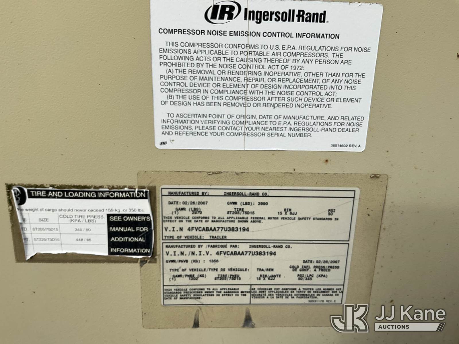 2007 DOOSAN Portable Air Compressor, John Deere diesel, (Not Running, Condition Unknown) (Reads 1,191 hours) This is a Titled Item NOTE: This unit is being sold AS IS/WHERE IS via Timed Auction and is located in Portland, OR. Inspection & preview days for this unit are the 2 business days prior to the first day of items closing for this auction, item is located at 13817 NE Sandy Blvd Portland, OR 97230 and hours of operations are 8a-4p. For pre-sale questions, please contact Tony Tully @ (503)-307-1348. Dealer License Number DL1391. (Buyer is responsible for removal. Assistance by consignor or JJ Kane Auctions is not assured.)