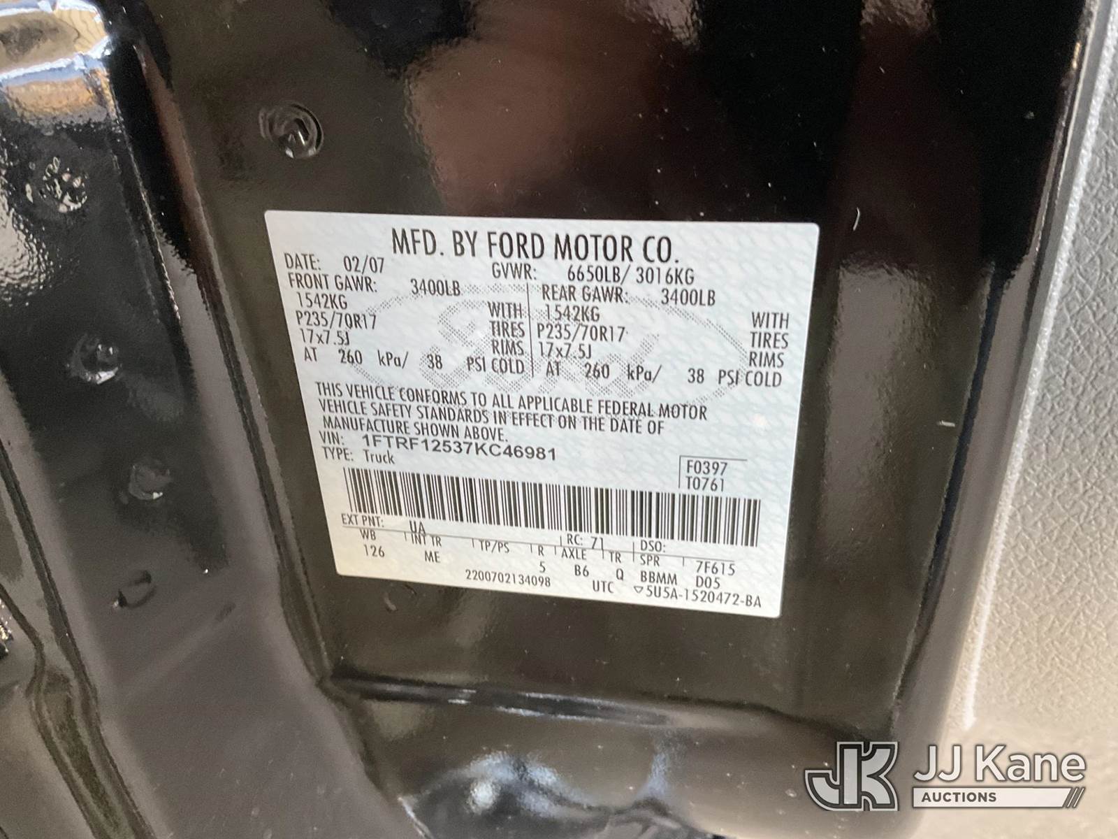 2007 Ford F-150 Pickup Truck, s/n 1FTRF12537KC46981, 5.4L V8 SOHC 16V 4-Speed Automatic, RWD, Gas, A/C, with tow package, bedcover, Aftermarket Rims, (103,301 miles) (Runs & Moves) (Needs New Battery, Missing Horn, Interior Stripped Of Parts, Airbag Lights On, Rear Axle Issue When Braking/Driving) (Bidding Restricted to Licensed Vehicle Dealers Only), This is a Titled Item NOTE: This unit is being sold AS IS/WHERE IS via Timed Auction and is located in Jurupa Valley, CA. Inspection & preview days for this unit are the 2 business days prior to the first day of items closing for this auction, item is located at 4510 Muth Way Jurupa Valley, CA 92509 and hours of operations are 8a-4p. For pre-sale questions, please contact please contact Office Staff @ (310) 353-7140. Dealer License Number 45696. (Buyer is responsible for removal. Assistance by consignor or JJ Kane Auctioneers is not assured.)
