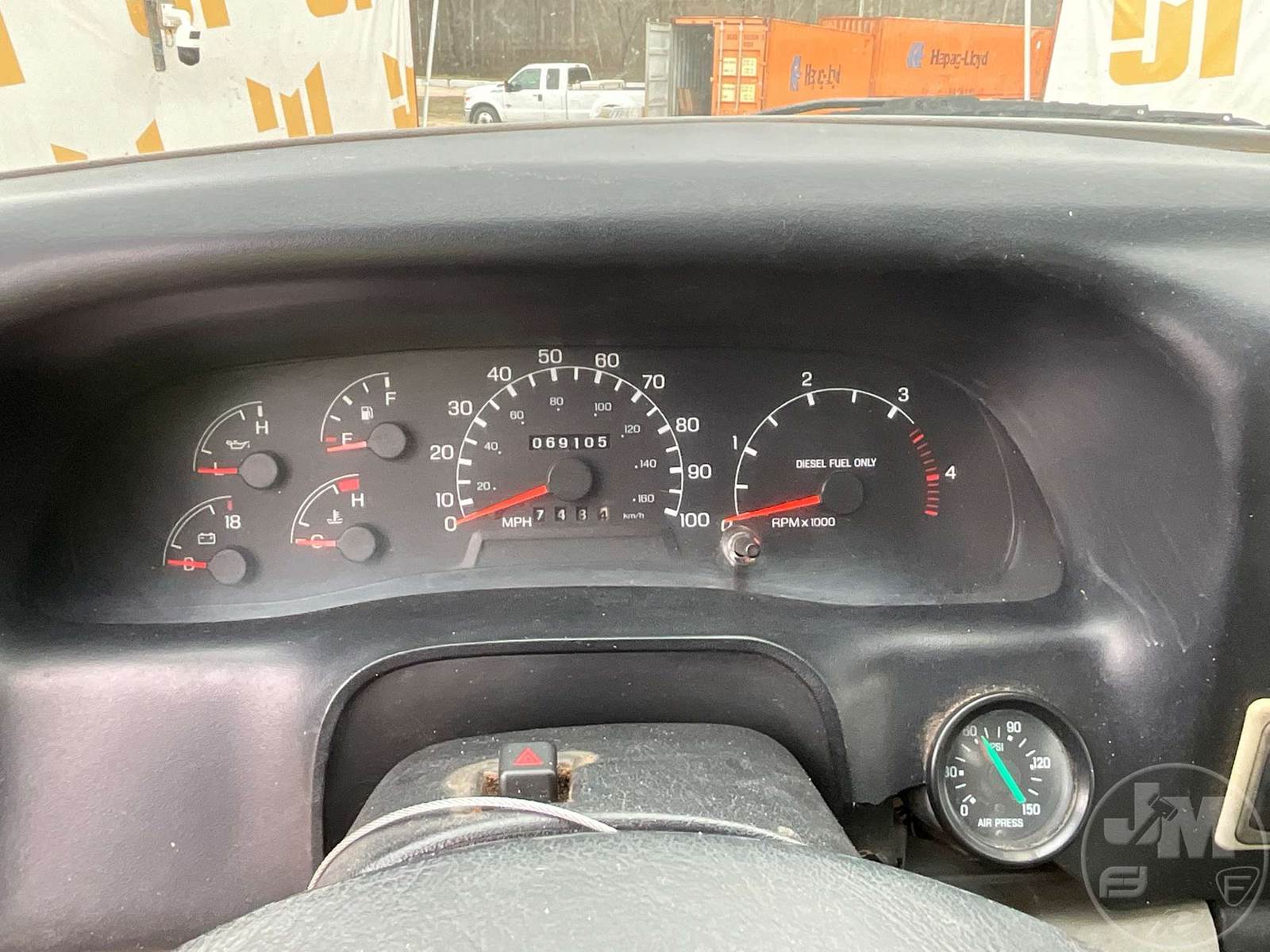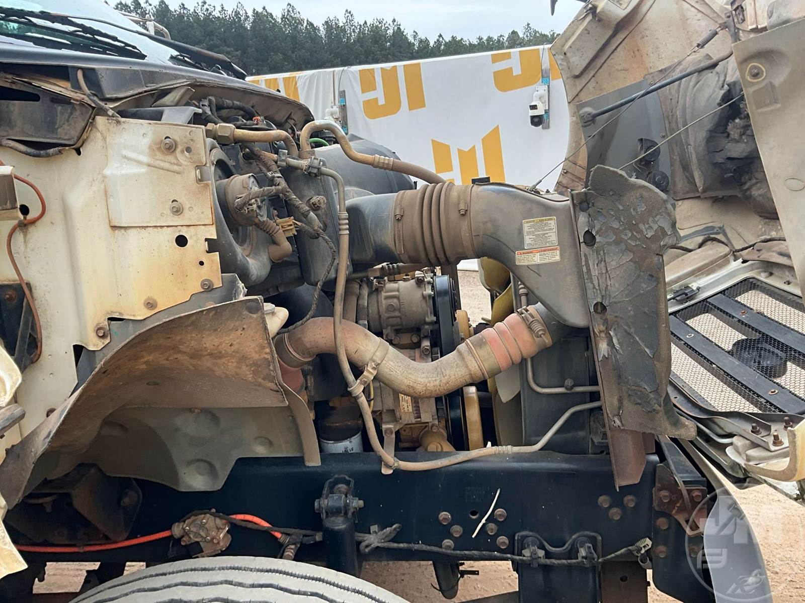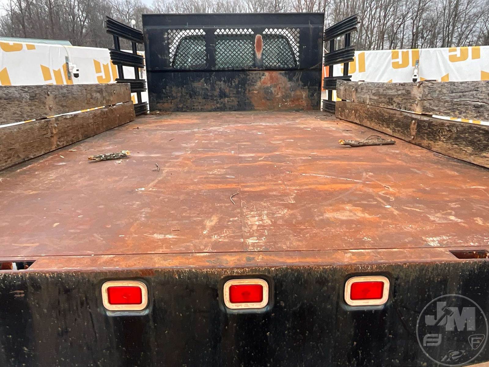 SINGLE AXLE REGULAR CAB FLATBED TRUCK, 14', STEEL BED, CATERPILLAR, C7, 7 SPEED, SPRING SUSPENSION, HEADACHE RACK, CRUISE CONTROL, REAR HITCH, 182 " WB, 12K FRONTS, 21K REARS, 33K GVWR, STEEL DISC WHEELS, 11R22.5 TIRES, REAR AIR HOOKUPS, SIDE BOXES, ODOMETER READS: 69105
