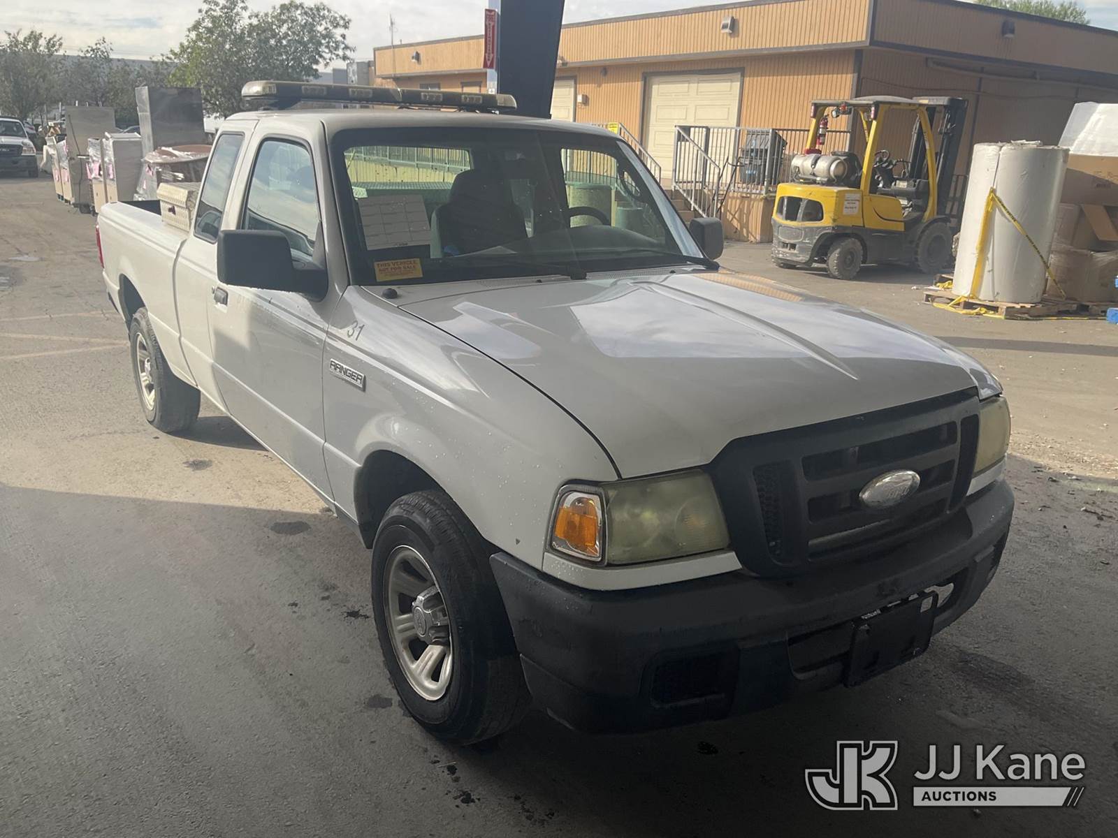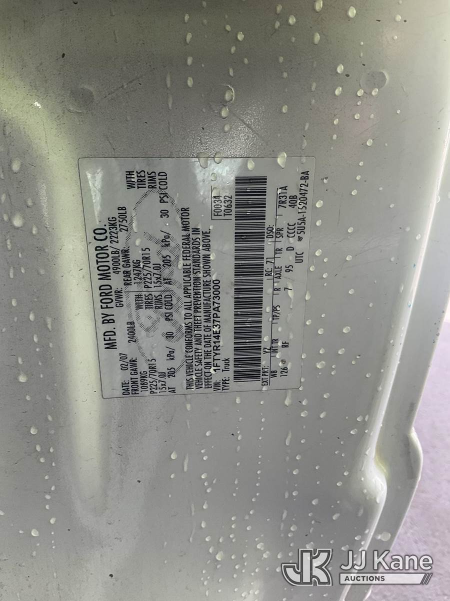 2007 Ford Ranger Pickup Truck, 6-cyl gas, 5-Speed Automatic, A/C, with Toolbox, (113,672 miles) (Runs & Moves) This is a Titled Item NOTE: This unit is being sold AS IS/WHERE IS via Timed Auction and is located in Jurupa Valley, CA. Inspection & preview days for this unit are the 2 business days prior to the first day of items closing for this auction, item is located at 4510 Muth Way Jurupa Valley, CA 92509 and hours of operations are 8a-4p. For pre-sale questions, please contact please contact Office Staff @ (310) 353-7140. Dealer License Number 45696. (Buyer is responsible for removal. Assistance by consignor or JJ Kane Auctioneers is not assured.)