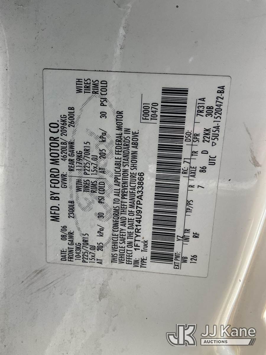 2007 Ford Ranger Pickup Truck, s/n 1FTYR14U97PA33866, 6-cyl gas, 5-Speed Automatic, A/C, with Tow package, (122,618 miles) (Runs & Moves) (Bidding Restricted to Licensed Vehicle Dealers Only), This is a Titled Item NOTE: This unit is being sold AS IS/WHERE IS via Timed Auction and is located in Jurupa Valley, CA. Inspection & preview days for this unit are the 2 business days prior to the first day of items closing for this auction, item is located at 4510 Muth Way Jurupa Valley, CA 92509 and hours of operations are 8a-4p. For pre-sale questions, please contact please contact Office Staff @ (310) 353-7140. Dealer License Number 45696. (Buyer is responsible for removal. Assistance by consignor or JJ Kane Auctioneers is not assured.)