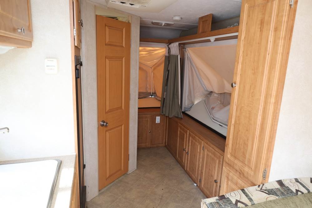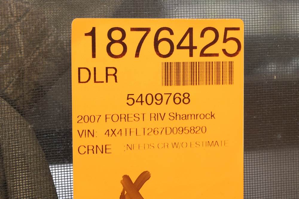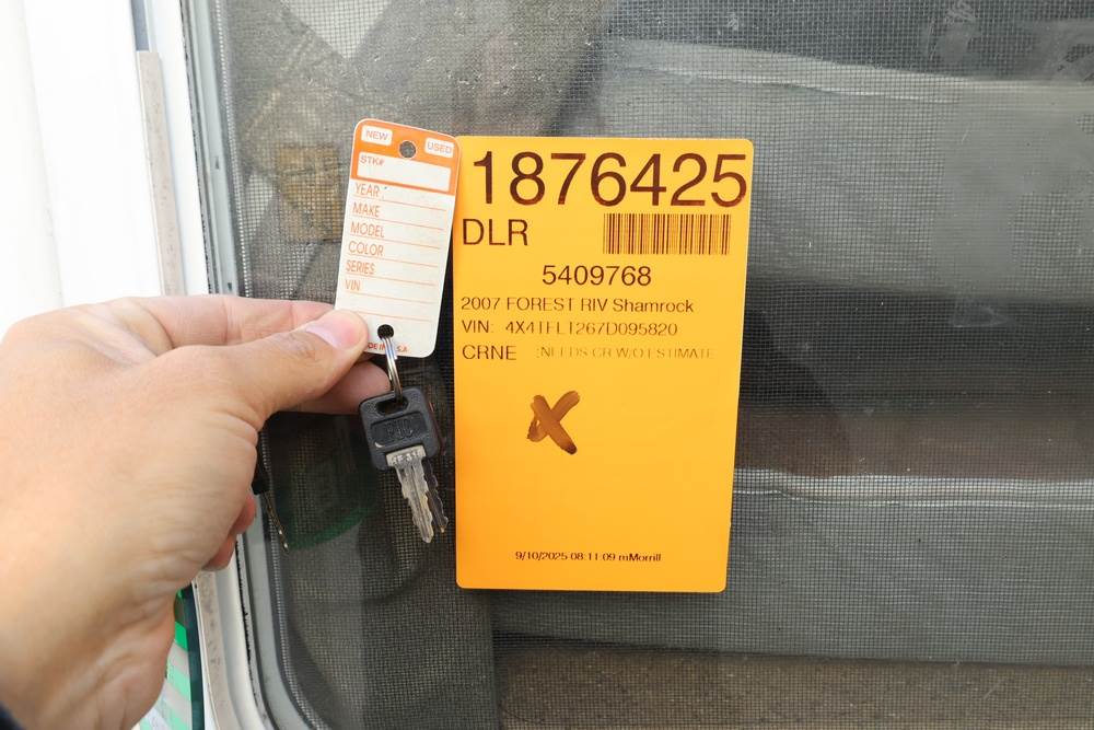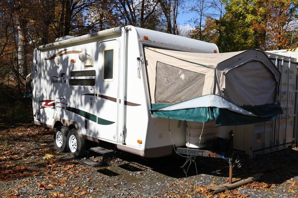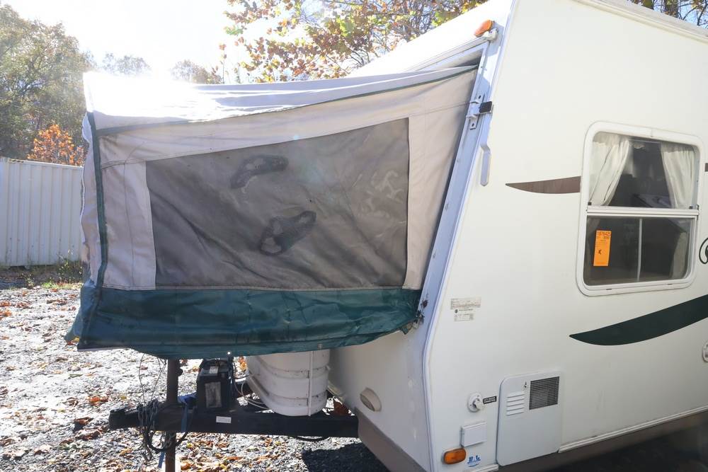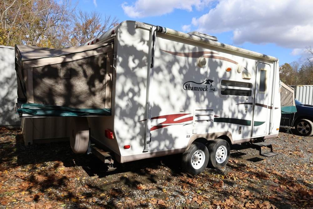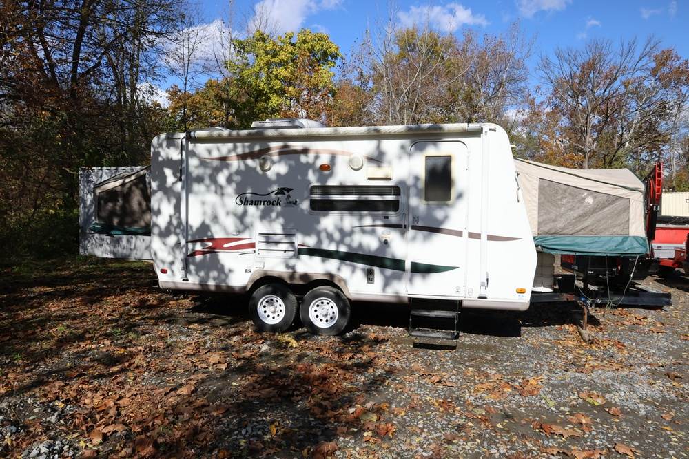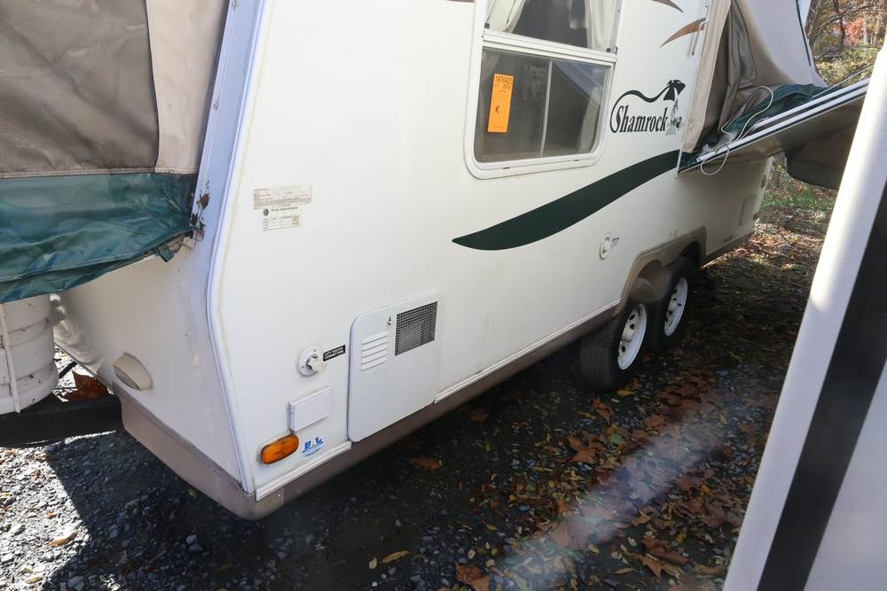 2007 Forest River Shamrock pop-out travel trailer VIN: 4X4TFLT267D095820. With a hybrid expandable design that includes canvas-covered pop-out sleeping areas on both ends and one side. The trailer features dual axles with white steel wheels, exterior graphics, a side awning, a three-burner gas stove, a dual basin kitchen sink, an overhead air conditioning unit, wood-paneled cabinetry, a dinette with upholstered seating, and a built-in Domestic refrigerator with matching wood paneling. Floor soft in areas. Title available Title will transfer via dealer paperwork in Highland NY.