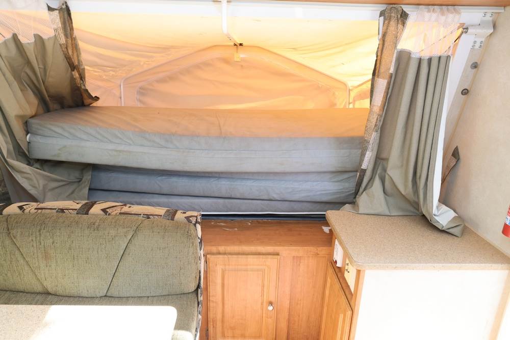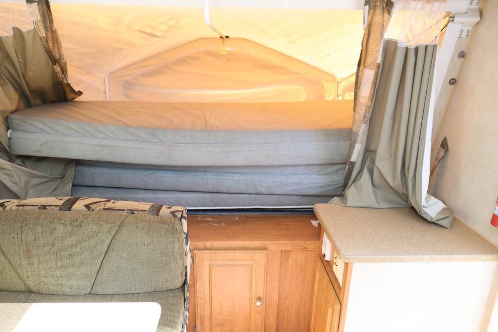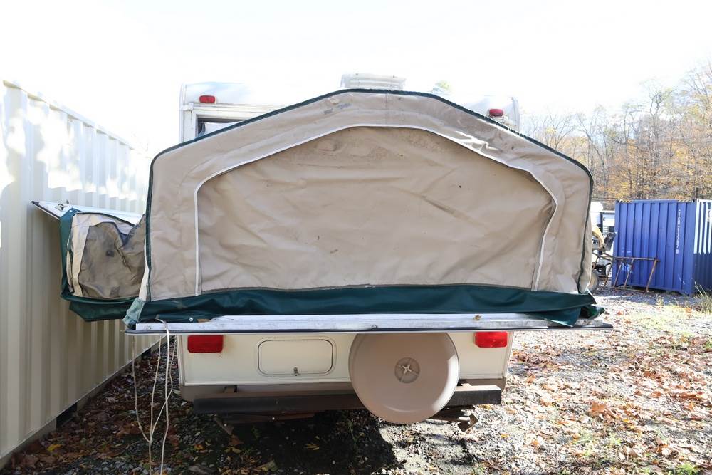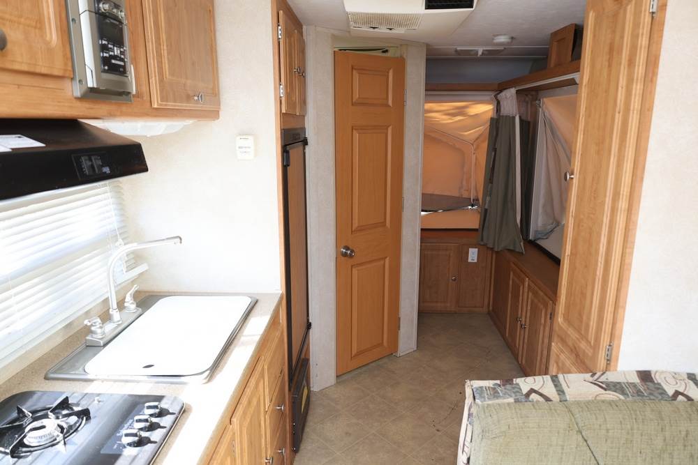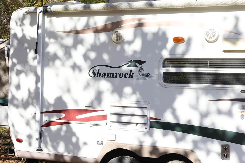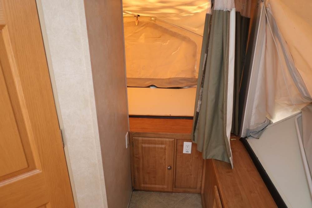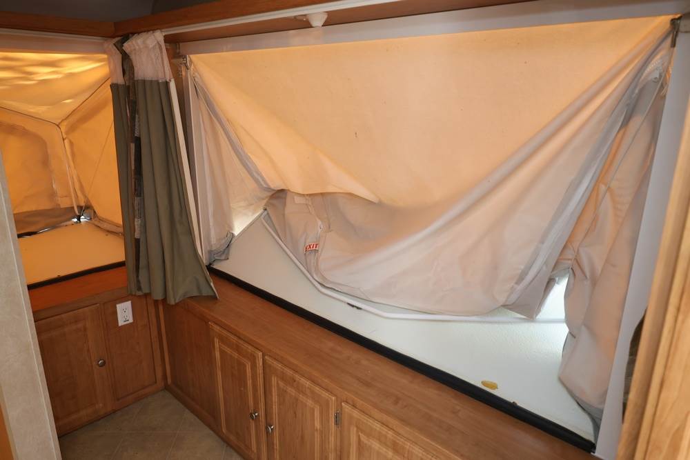 2007 Forest River Shamrock pop-out travel trailer VIN: 4X4TFLT267D095820. With a hybrid expandable design that includes canvas-covered pop-out sleeping areas on both ends and one side. The trailer features dual axles with white steel wheels, exterior graphics, a side awning, a three-burner gas stove, a dual basin kitchen sink, an overhead air conditioning unit, wood-paneled cabinetry, a dinette with upholstered seating, and a built-in Domestic refrigerator with matching wood paneling. Floor soft in areas. Title available Title will transfer via dealer paperwork in Highland NY.