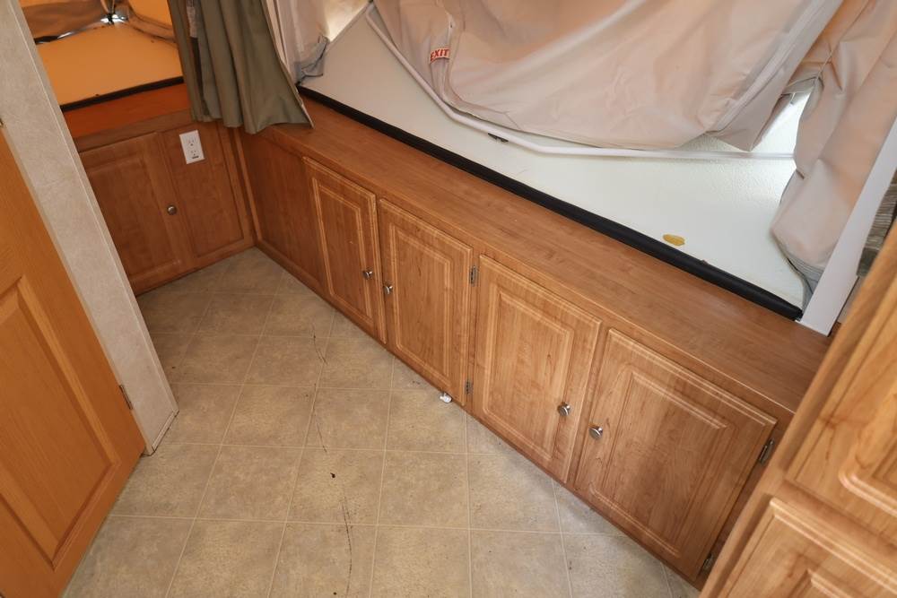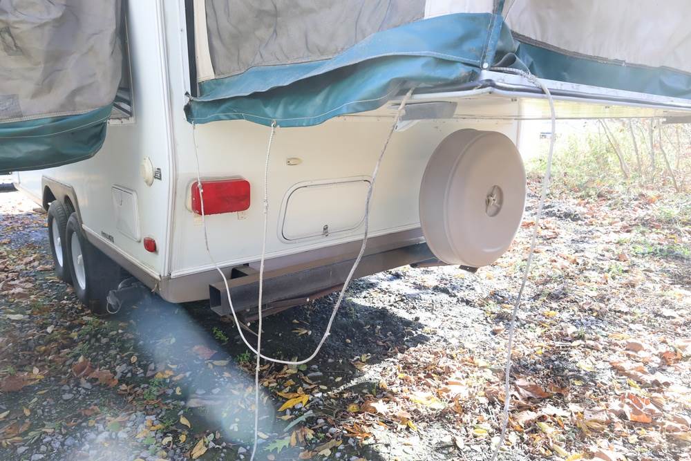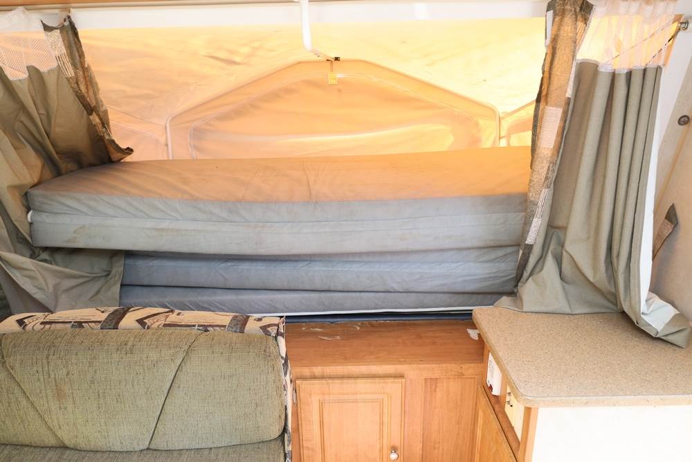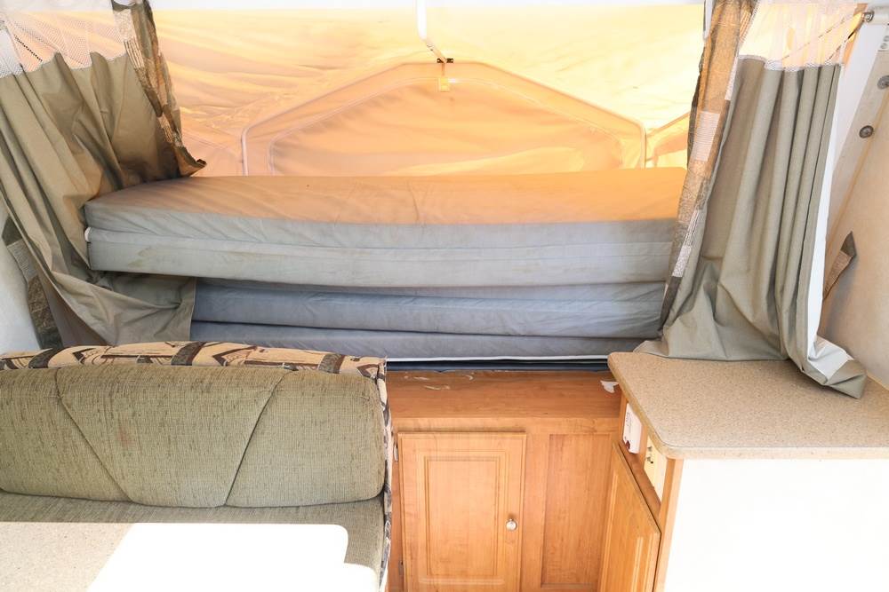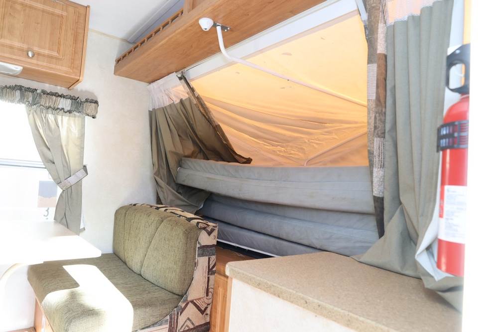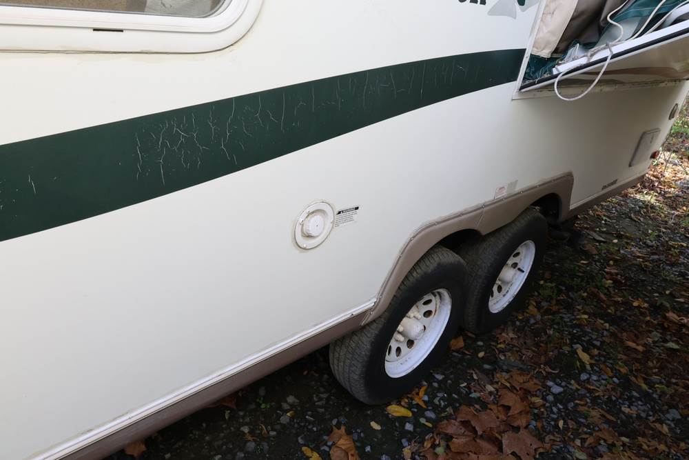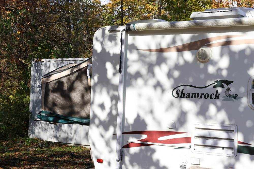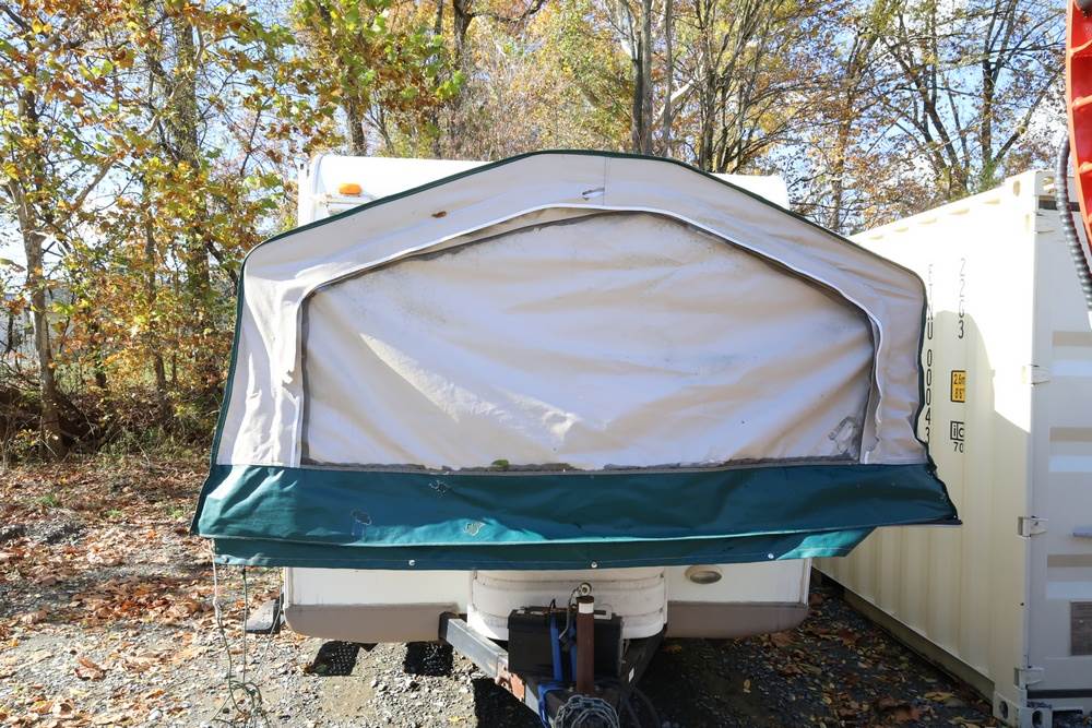 2007 Forest River Shamrock pop-out travel trailer VIN: 4X4TFLT267D095820. With a hybrid expandable design that includes canvas-covered pop-out sleeping areas on both ends and one side. The trailer features dual axles with white steel wheels, exterior graphics, a side awning, a three-burner gas stove, a dual basin kitchen sink, an overhead air conditioning unit, wood-paneled cabinetry, a dinette with upholstered seating, and a built-in Domestic refrigerator with matching wood paneling. Floor soft in areas. Title available Title will transfer via dealer paperwork in Highland NY.
