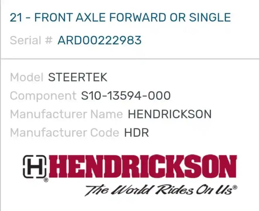 (Used) 2007 Freightliner Columbia 112, COMPLETE FRONT AXLE- Part Number: S10-13594-000, Serial Number: ARD00222983, Center Leaf to Center Leaf: 32", Make: Hendrickson, Model: STEERTEK, Capacity: 12,000 Lbs, Hub Bolts: 10, Brake Type: Drum, For more information about this item, give us a call. We ship Worldwide! (CRG HEAVY TRUCK PARTS) 929 W PULASKI HWY ELKTON, MD 21921, Capacity: 12,000 Lbs, Serial#: ARD00222983, Hub Bolts: 10, Brake Type: Drum