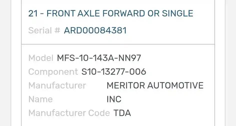 (Used) 2007 Freightliner M2 106, COMPLETE FRONT AXLE- Part Number: S10-13277-006, Serial Number: ARD00084381, Make: Meritor, Model: MFS-10-143A, Capacity: 10,000 LBS, Hub Bolts: 10, Brake Type: Drum, For more information about this item, give us a call. We ship Worldwide! (CRG HEAVY TRUCK PARTS) 929 W PULASKI HWY, ELKTON, MD 21921, Capacity: 10,000 LBS, Serial#: ARD00084381, Hub Bolts: 10, Brake Type: Drum