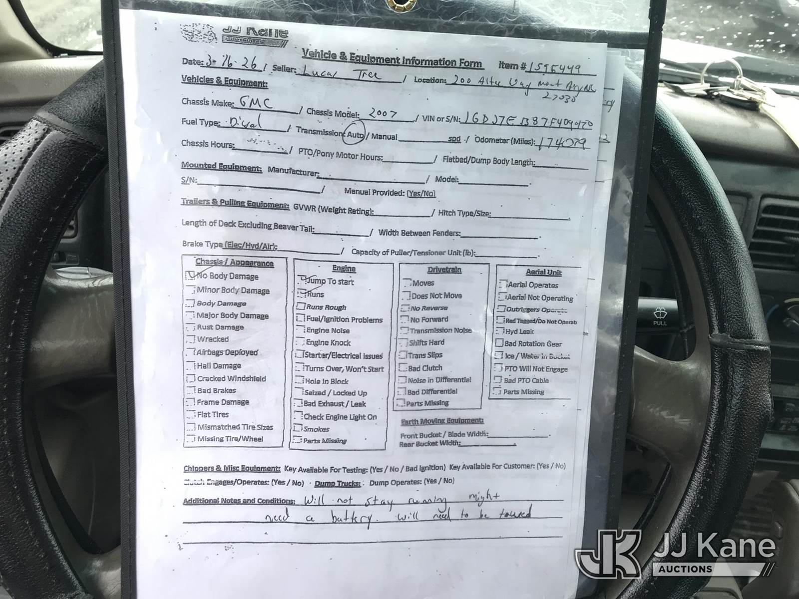 2007 GMC C7500 Chipper Dump Truck, 7.8L diesel, 4X2, Auto, A/C, (174,079 miles) (Jump to Start, Runs, Will Not Stay Running, Will Need Towed, Check Engine Light On) This is a Titled Item NOTE: This unit is being sold AS IS/WHERE IS via Timed Auction and is located in Mount Airy, NC. Inspection & preview days for this unit are by appointment only; please contact us at contact@jjkane.com or 84-Go-JJKane for more details. (Buyer is responsible for removal. Assistance by consignor or JJ Kane Auctions is not assured.)