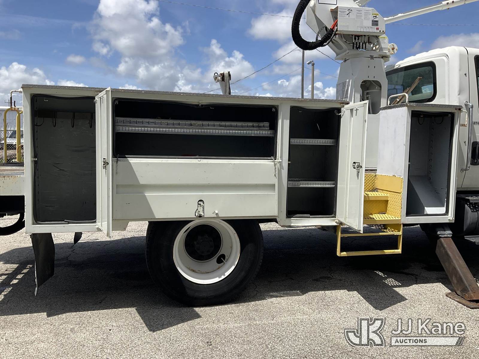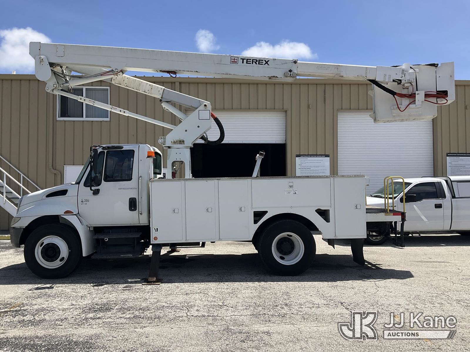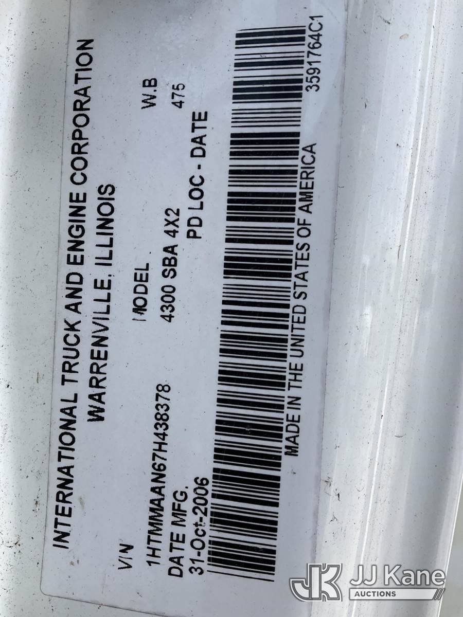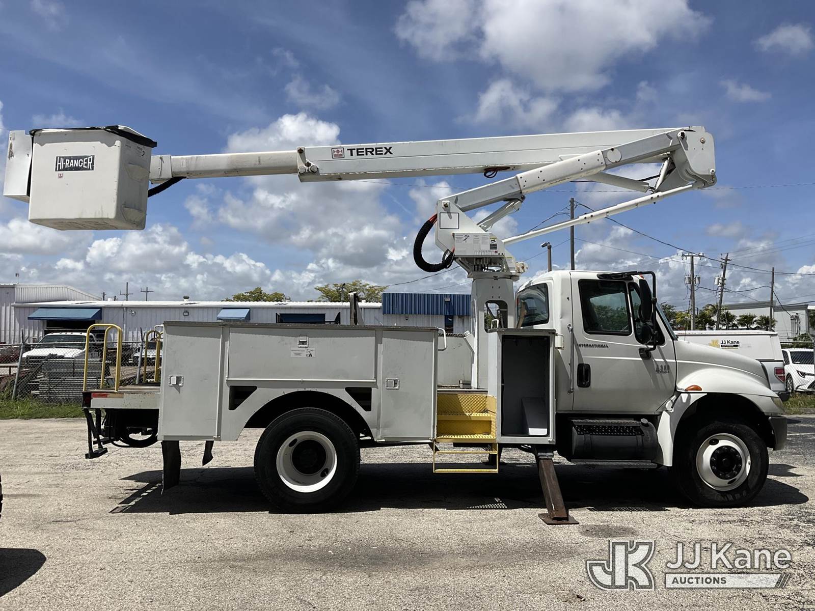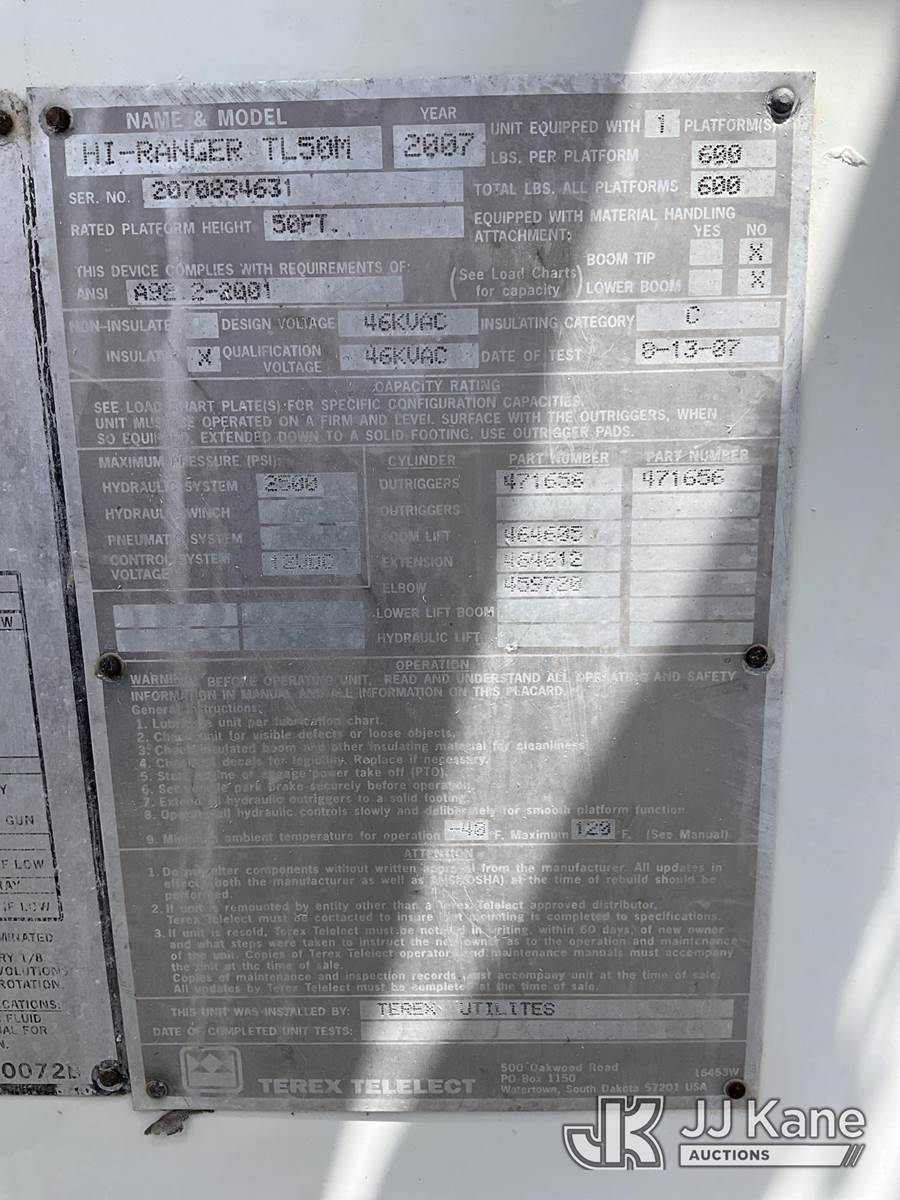 HiRanger TL50M, 55 ft, Bucket Truck s/n 2070834631, with Two-Man Bucket, mounted behind cab on 2007 International 4300 Utility Truck, 7.6L L6 DIESEL 4X2, Auto, A/C, (12,983 miles) (Runs & Moves, Upper Unit Operates) (Body Damage & Rust, Passenger Side Rear Tool Box Door Missing) (FL Residents Purchasing Titled Items – tax, title & registration fees will be collected at the maximum rate of $400.00 under 25,999 and $800.00 for Over 26,000 and $250.00 for Trailers – Proof of insurance is mandatory; Out of State Residents Purchasing Title Items – tax will be collected based upon your state rate) (Reads 4,226 hours) This is a Titled Item NOTE: This unit is being sold AS IS/WHERE IS via Timed Auction and is located in West Palm Beach, FL. Inspection & preview days for this unit are the 2 business days prior to the first day of items closing for this auction, item is located at 2570 Old Okeechobee Rd West Palm Beach, FL 33409 and hours of operations are 8a-4p. For pre-sale questions, please contact Andy Garcia @ (561) 215-0085. (Missing manuals, See Auction Company for Manufacturers Information to obtain manuals) (Buyer is responsible for removal. Assistance by consignor or JJ Kane Auctions is not assured.)