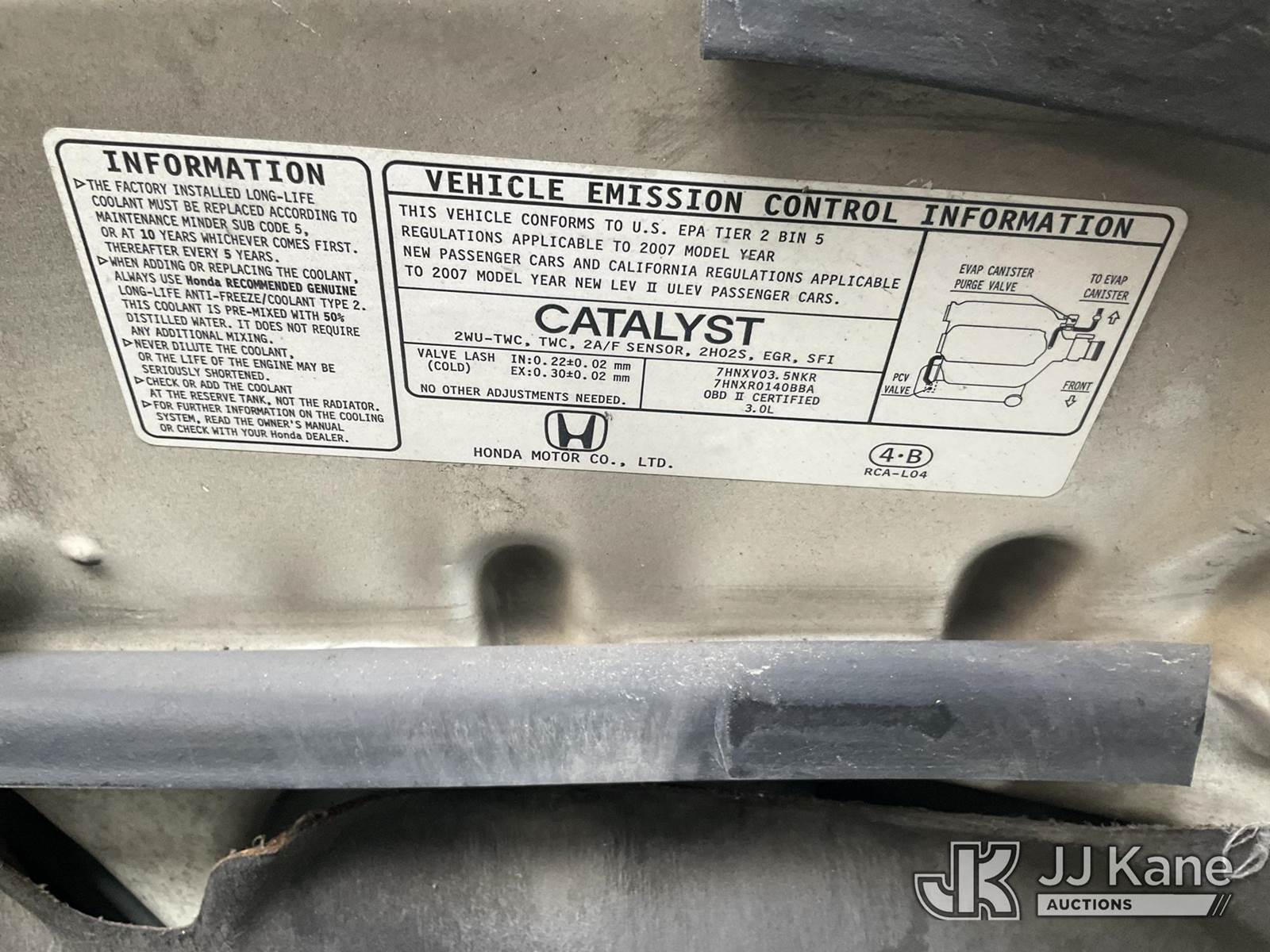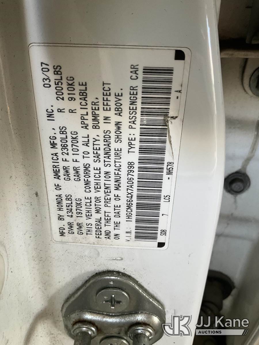 2007 Honda Accord SE V-6 Sedan AT 4-Door Sedan, s/n 1HGCM664X7A067998, 3.0L V6 SOHC 24V FWD, GAS, 5-Speed Automatic, A/C, (137,018 miles) (Runs & Moves, Missing Catalytic Converter, Low On Fuel) (Bidding Restricted to Licensed Vehicle Dealers Only), This is a Titled Item NOTE: This unit is being sold AS IS/WHERE IS via Timed Auction and is located in Jurupa Valley, CA. Inspection & preview days for this unit are the 2 business days prior to the first day of items closing for this auction, item is located at 4510 Muth Way Jurupa Valley, CA 92509 and hours of operations are 8a-4p. For pre-sale questions, please contact please contact Office Staff @ (310) 353-7140. Dealer License Number 45696. (Buyer is responsible for removal. Assistance by consignor or JJ Kane Auctions is not assured.)