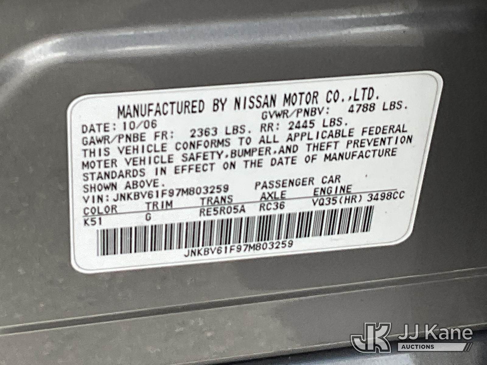 2007 Infiniti G35 AWD 4-Door Sedan, 6-cyl gas, Auto, A/C, (223,338 miles) (Runs & Moves) (Bad Paint, Modified Suspension) This is a Titled Item NOTE: This unit is being sold AS IS/WHERE IS via Timed Auction and is located in Salt Lake City, UT. Inspection & preview days for this unit are the 2 business days prior to the first day of items closing for this auction, item is located at 2353 N Redwood Rd Salt Lake City, UT 84116 and hours of operations are 8a-4p. Titles executed exactly as bidder registered. Ensure your name and/or business name and address in JJ Kane and/or ProxiBid is correct before bidding. For pre-sale questions, please contact Office Staff @ (801) 519-0123. (Buyer is responsible for removal. Assistance by consignor or JJ Kane Auctions is not assured.)