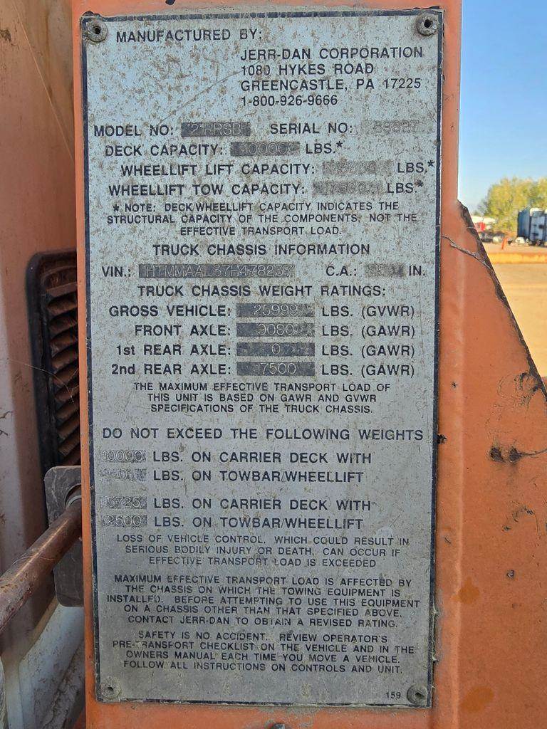 Roll-back Bed Info: Jerr-Dan Model Model 21RRSB, S/N 89627, 10,000 lb Deck Capacity.