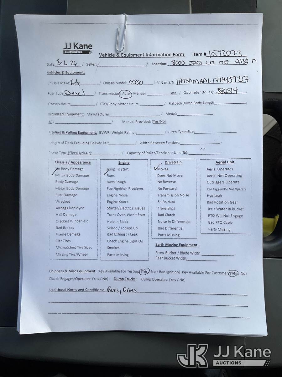 2007 International 4300 Tank Truck, 7.6L L6 DIESEL 4X2, Auto, A/C, (386,514 miles) (Runs & Moves) (Engine Light On, Minor Body Damage) This is a Titled Item NOTE: This unit is being sold AS IS/WHERE IS via Timed Auction and is located in Albuquerque, NM. (Buyer is responsible for removal. Assistance by consignor or JJ Kane Auctions is not assured.)