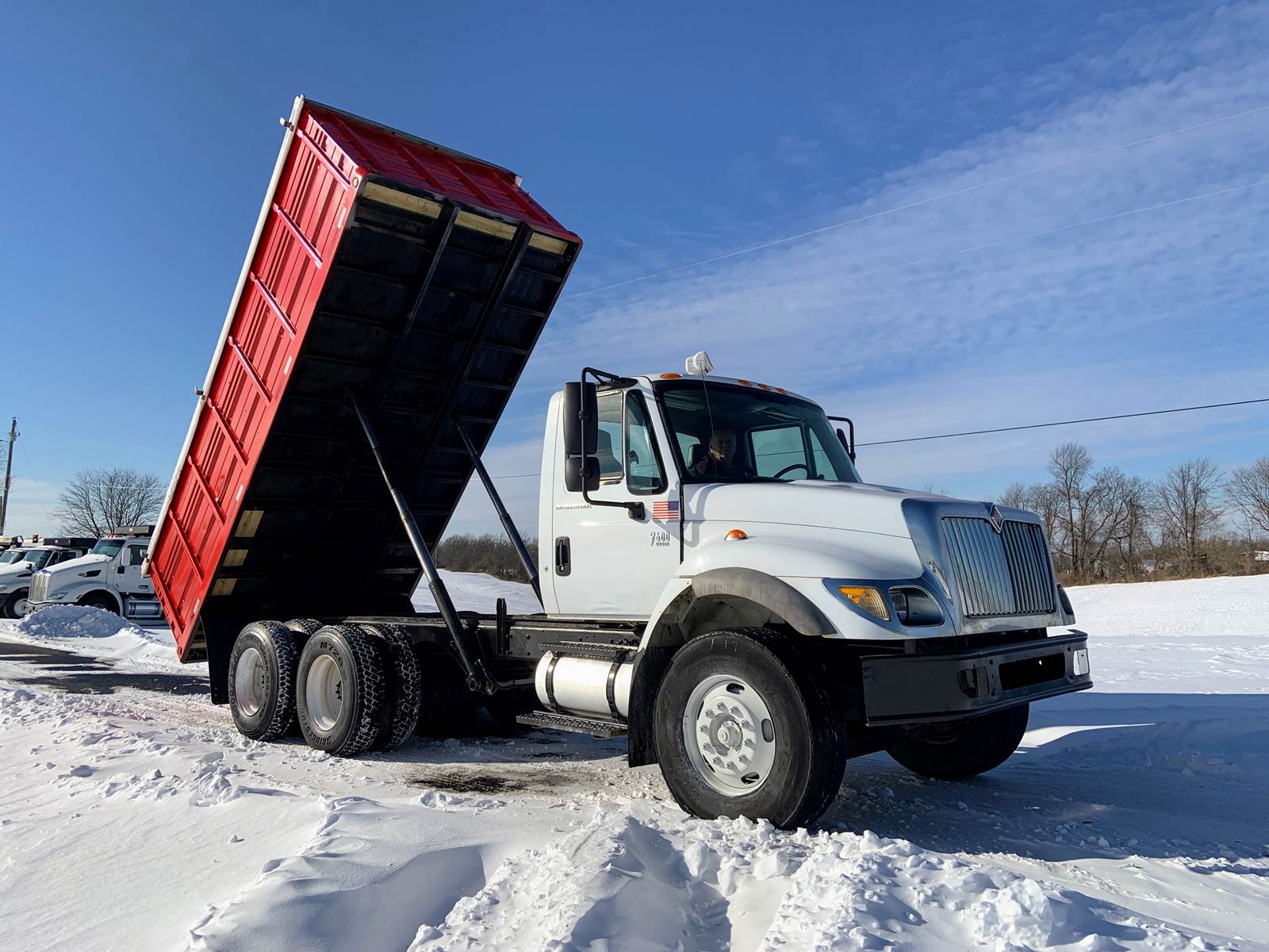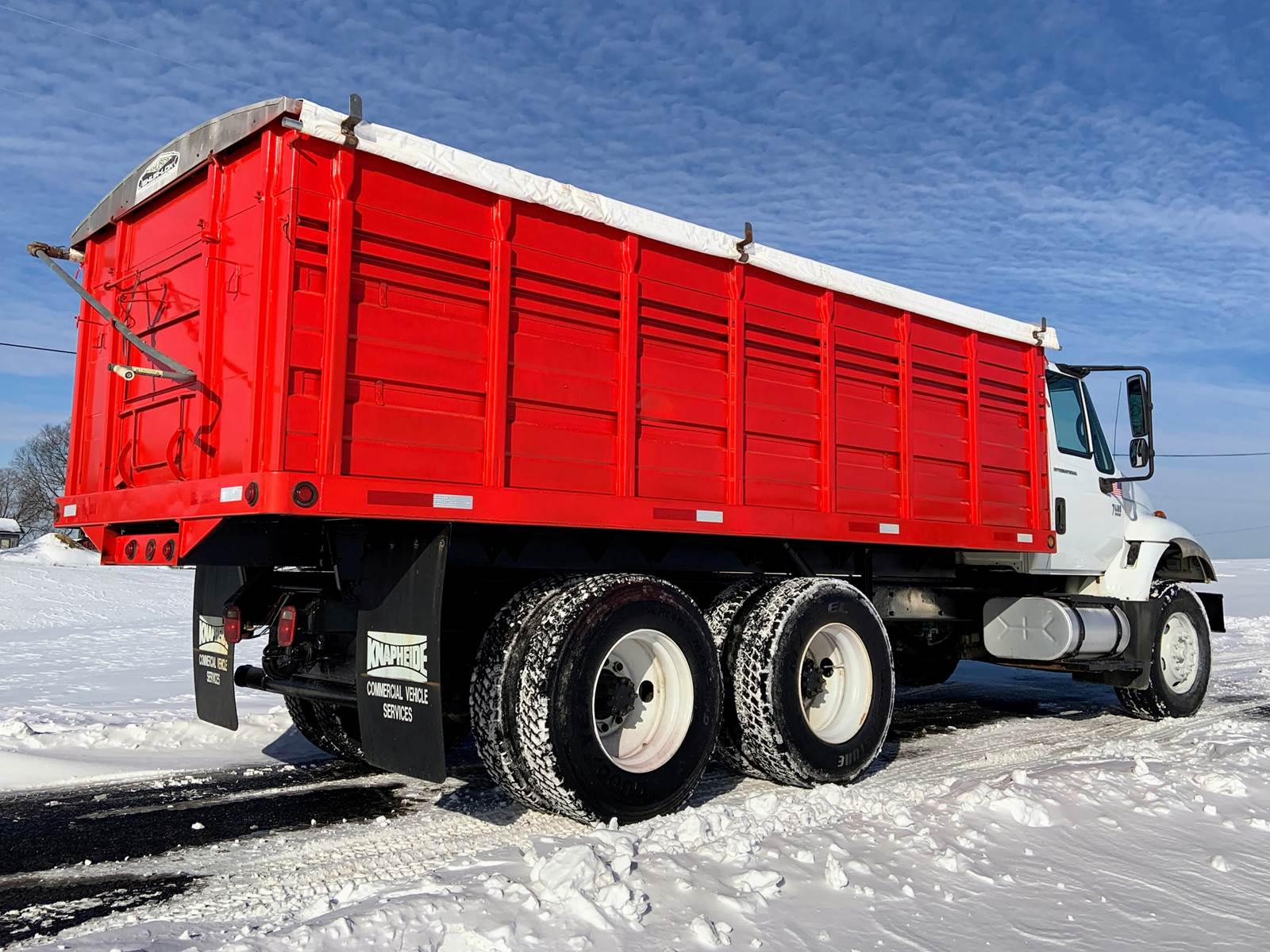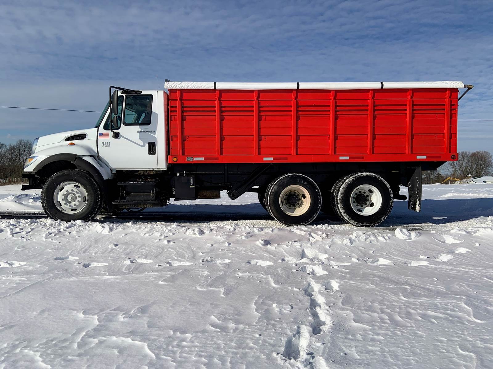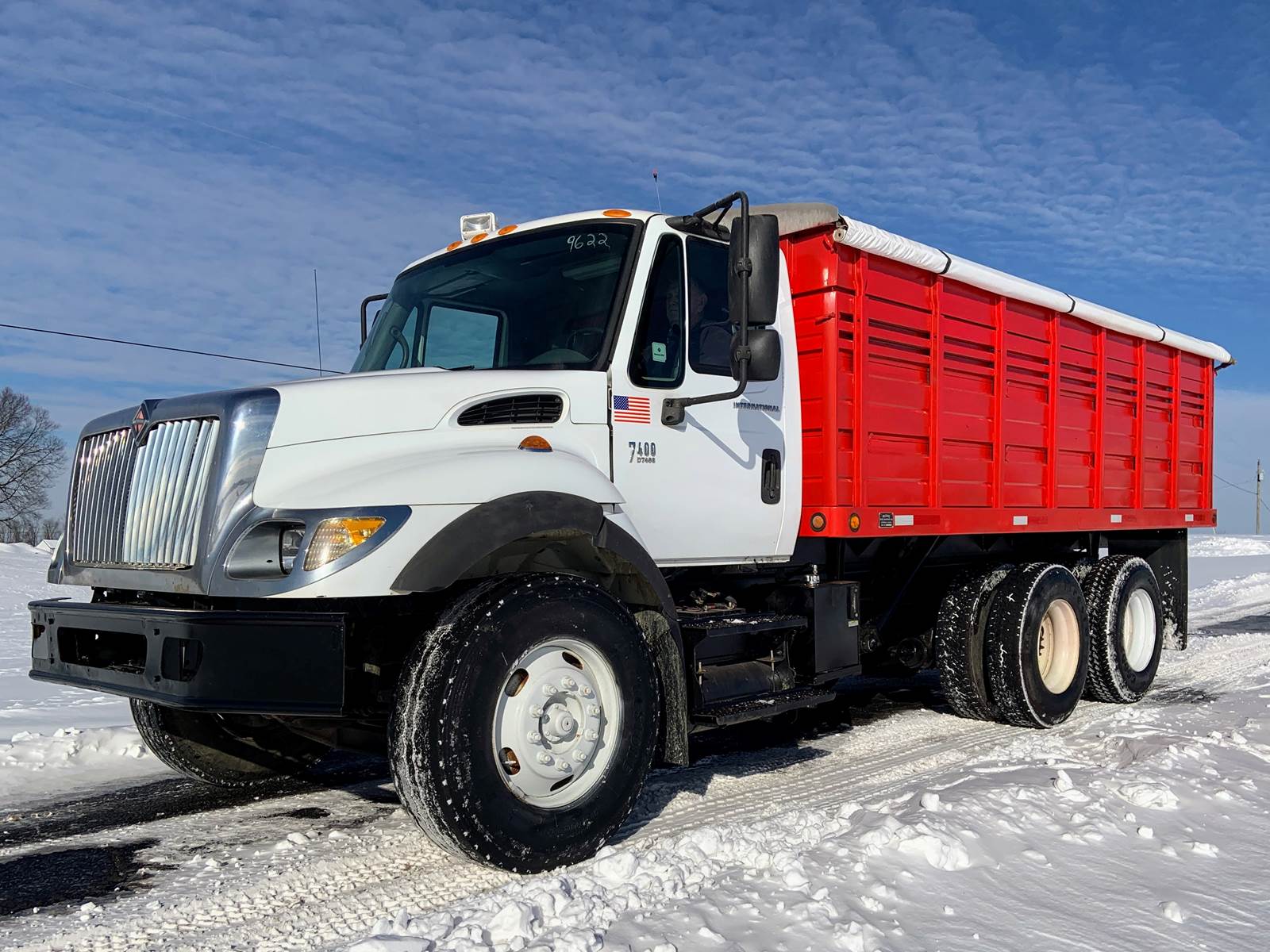 2007 International 7400 with 18 Foot Grain Bed with Roll Tarp, 18 Foot Grain Bed with 52 Inch Sides and Roll Tarp, International DT466 Diesel 7.6 Liter Engine, 260 HP, Allson 3000 RDS Automatic 6 Speed Transmission, GVWR - 46,000 Lbs, Front Axle - 12,000 Lbs, Tandem Rear - 34,000 Lbs, Air Brakes, 192 Inch Wheelbase, 124 Inches Cab To Axle, Rear Tires - 11R22.5, Front Floats - 315/80 R22.5, Tilt Steering, Cruise Control, Air To Rear, Pintle Hitch with D-Rings, Odometer - 141,459 Miles, Hr Meter - 11,772 Hours, No DEF and No DPF