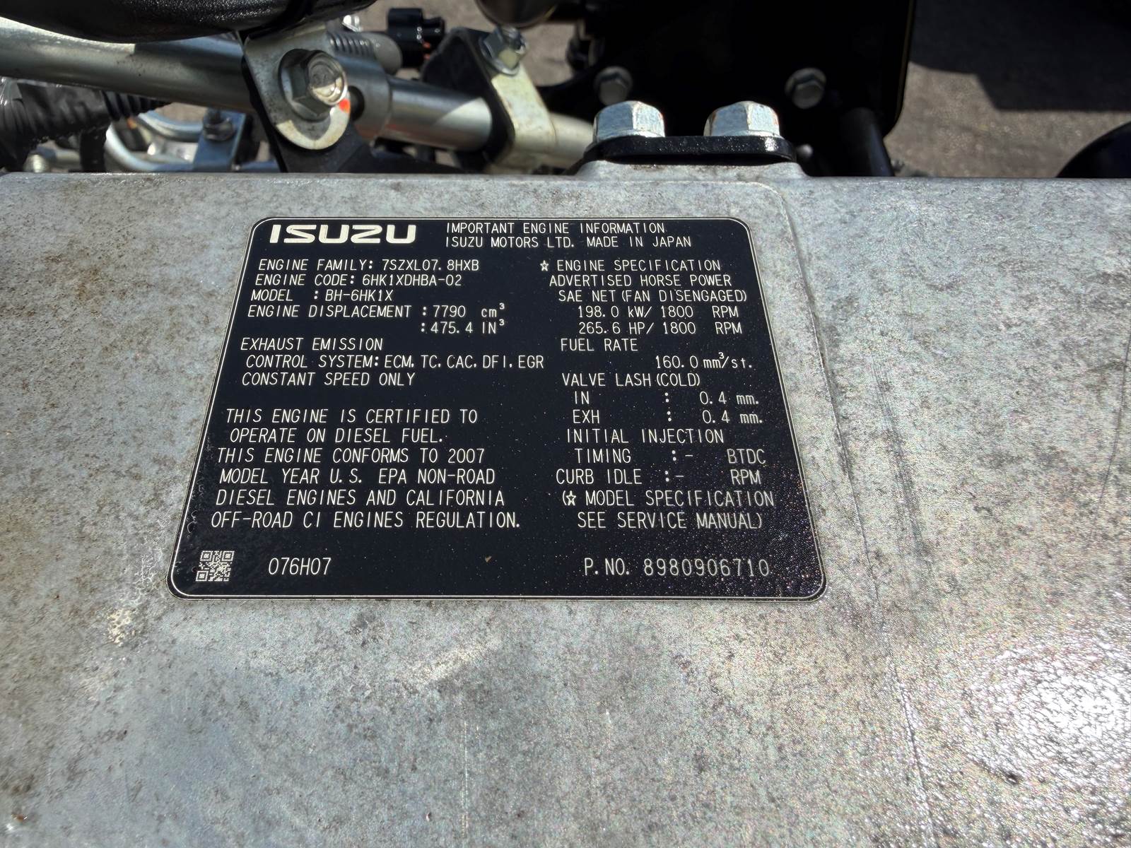 (NEW) 2007 Isuzu 6HK1 Industrial Diesel Engine (TIER3), Engine Model: BH-6HK1X, Family # 7SZXL07.8HXB, Engine Code # 6HK1XDHBA-02, Part # 8980906710, HP: 266 @ 1800RPM, Torque: 160LBS @ 1800 RPM, Engine Displacement: 7.8L, visit JJREBUILDERS for more information on this or any other diesel engine call 786-377-5210 for more information. REF INV # 006776