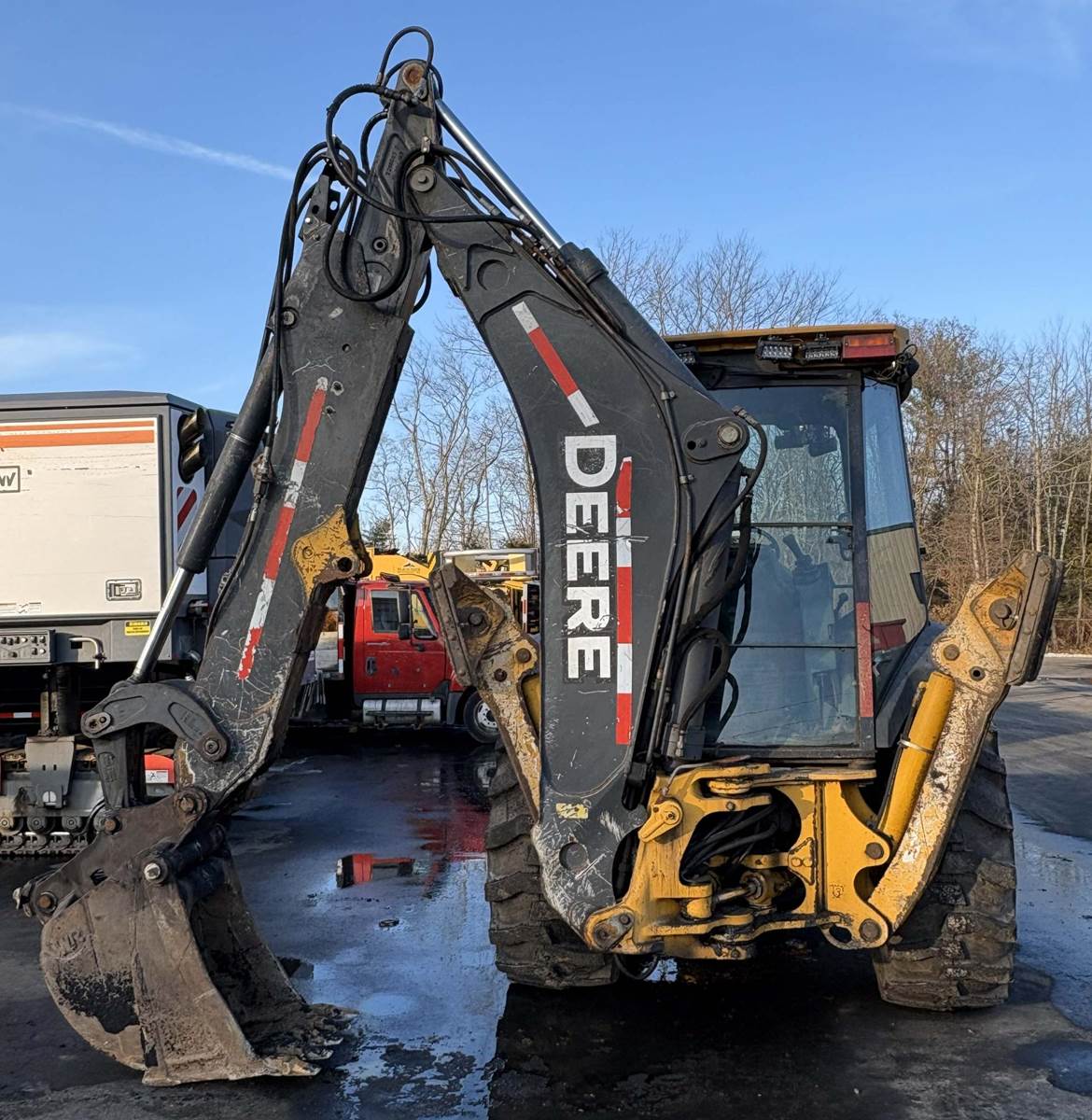 2007 DEERE 410J Backhoe Loader - 4x4, 4WD, extendahoe, 96 HP John Deere 4045T Turbo diesel engine, 19,825 hours, Powershift transmission (4F,3R), operating weight 15,000 lbs, max dig depth 15 ft 8 in, max reach 19 ft 7 in, loading height 12 ft 5 in, 104" front bucket, 21" rear bucket..... Financing available