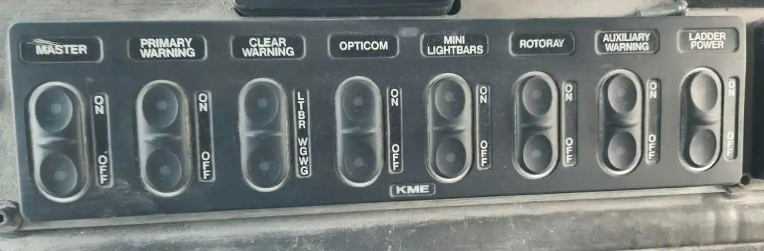 (Used) 2007 KME Kovatch Fire Truck, MISCELLANEOUS DASH SWITCHES- Controls: Master, Primary Warning, Clear Warning, Opticom, Mini LightBars, RotoRay, Auxiliary Warning, Ladder Power, For more information about this item, give us a call. We ship Worldwide! (CRG HEAVY TRUCK PARTS) 929 W PULASKI HWY ELKTON, MD 21921, Material: Plastic