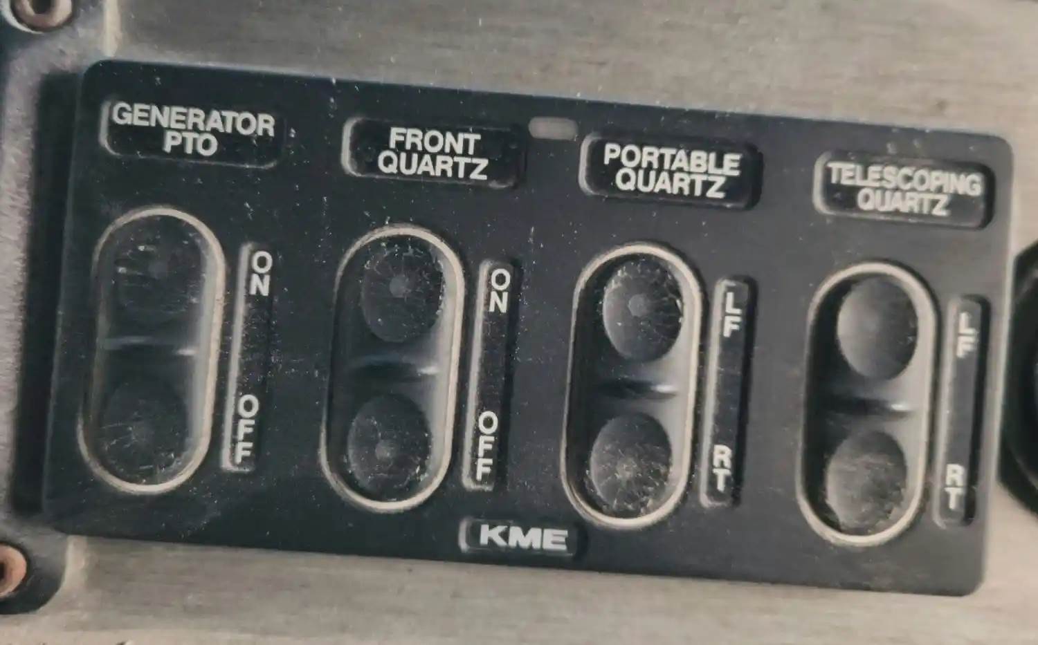 (Used) 2007 KME Kovatch Fire Truck, MISCELLANEOUS DASH SWITCHES- Controls: Generator PTO, Front Quartz, Portable Quartz, Telescoping Quartz, For more information about this item, give us a call. We ship Worldwide! (CRG HEAVY TRUCK PARTS) 929 W PULASKI HWY ELKTON, MD 21921, Material: Plastic