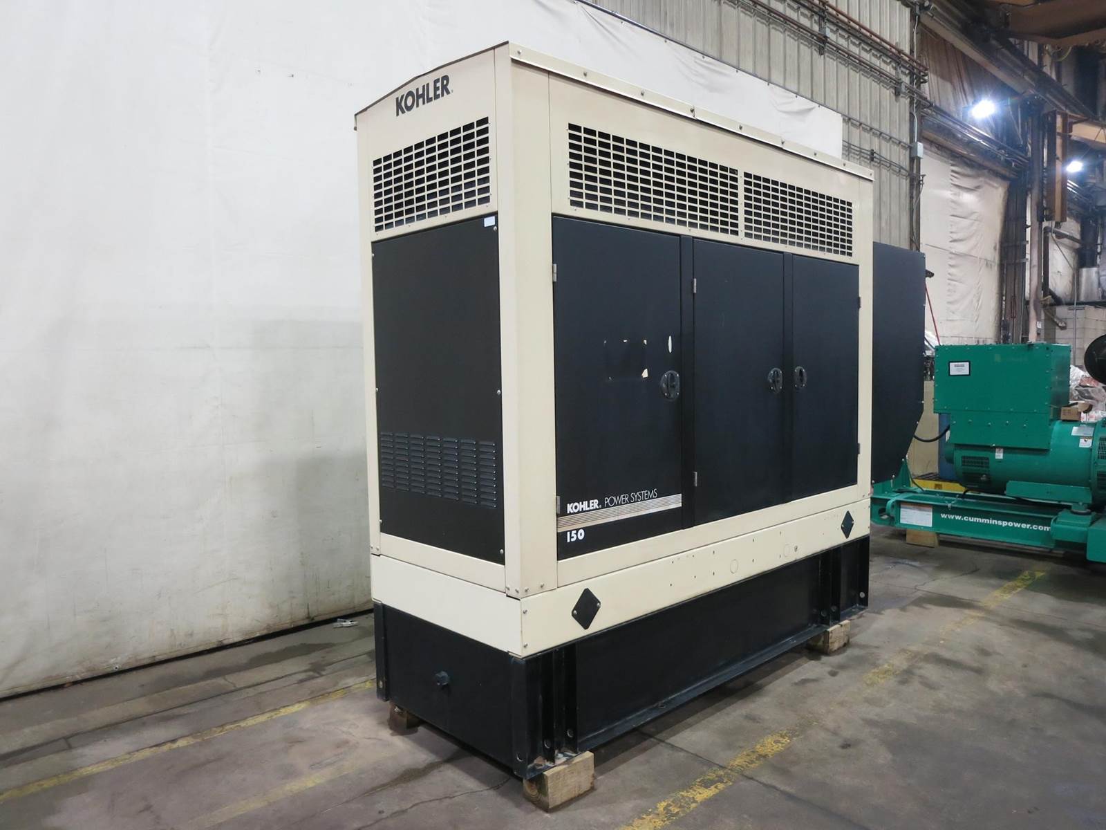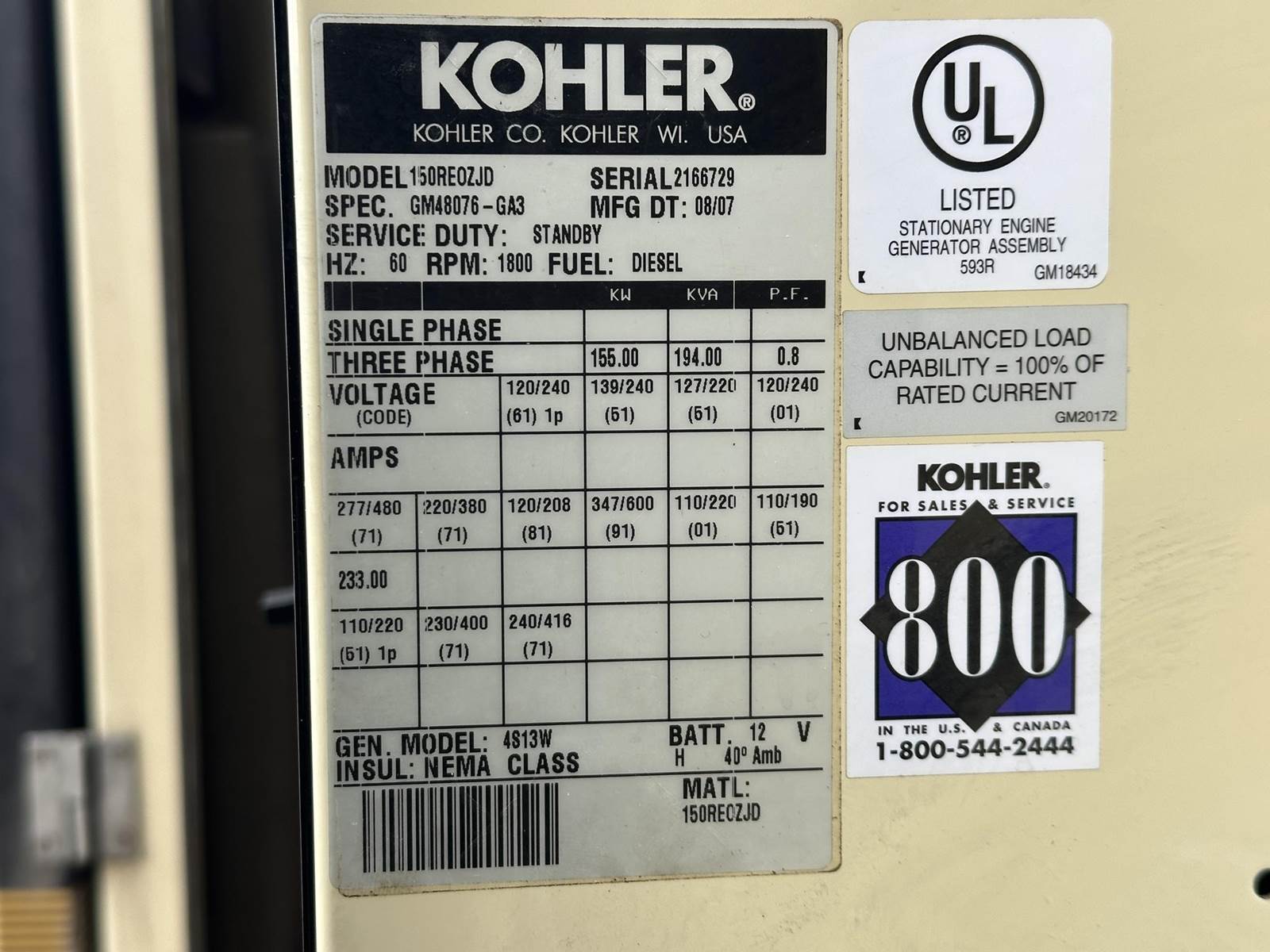 Kohler 155 kW standby (140 kW prime) diesel generator set, model 150REOZJD, SN-2166729. John Deere 6068HF285 engine rated 237 HP at 1800 RPM, SN-, EPA Tier 3 emissions. 3/60/277/480V, 12 lead reconnectable to other voltages. 200 Amp main-line circuit breaker. UL listed stationary engine generator assembly. Decision-maker 3+ 16 light control panel. Battery charger. Coolant heater. Weather enclosure. 196 gallon UL listed sub--base fuel tank. 739 Hrs. Year 2007. Load test pending. Overall dimensions 42W x 142L x 116H on 6H blocks, 5,800 lbs. FOB Waukesha, WI