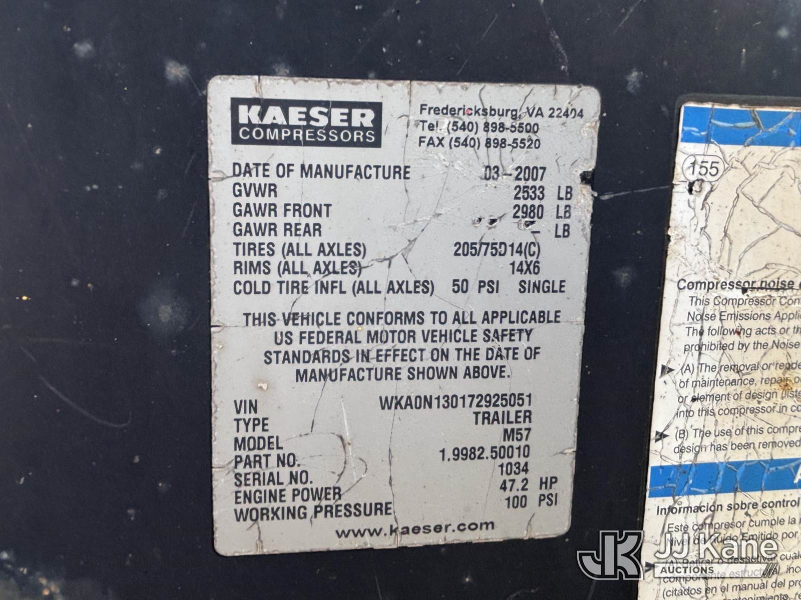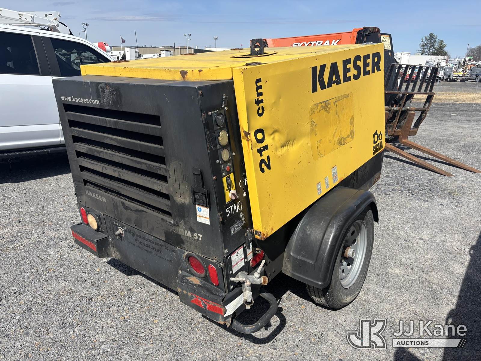 2007 Kubota M57 Air Compressor, 4-cyl, Diesel, with Battery Disconnect Switch, (Runs & Builds Air, Dings & Dents, Wear & Tear) (Reads 1,065 hours) This is a Titled Item NOTE: This unit is being sold AS IS/WHERE IS via Timed Auction and is located in Plains, PA. Inspection & preview days for this unit are the 2 business days prior to the first day of items closing for this auction, item is located at 250 Laird St Plains, PA 18705 and hours of operations are 8a-4p.For pre-sale questions, please contact Mary Darlington @ (570) 899-4930 or Mary.Darlington@JJKane.com. (Buyer is responsible for removal. Assistance by consignor or JJ Kane Auctions is not assured.)