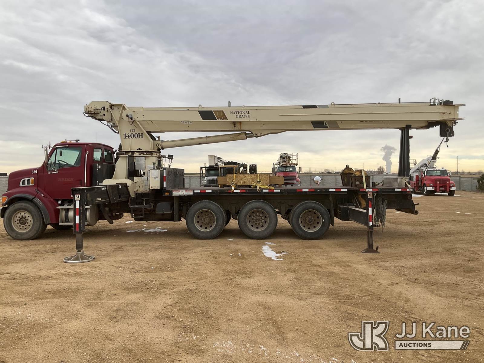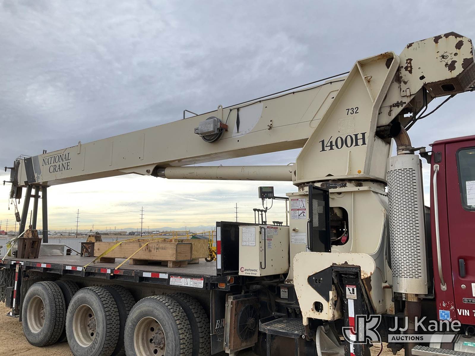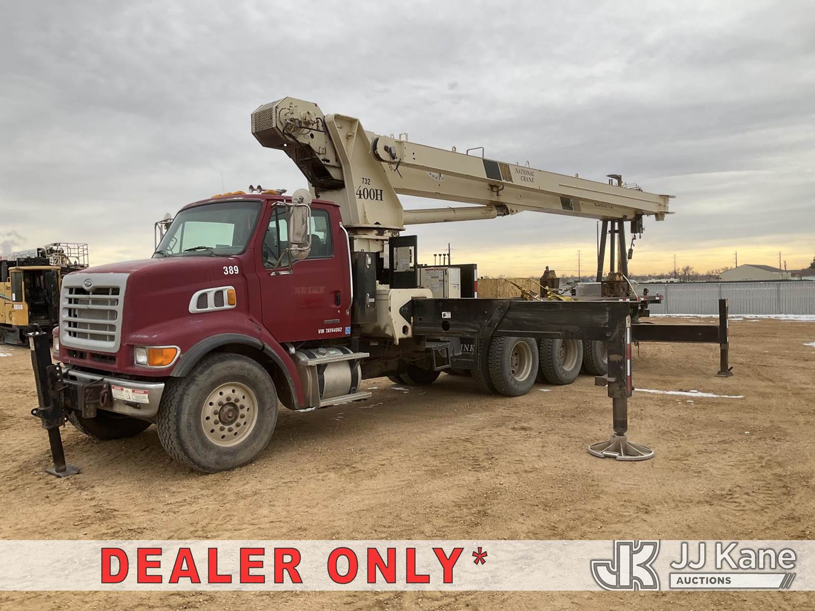 National 1400H, 33-Ton Hydraulic Crane s/n 293537, with 127 Ft 5-Section Hyd Boom W/30 Ft Swing Away Jib, Heel Winch, 35 Ton & 15 Ton Hook Blocks, Two Replacement Outriggers On Flatbed, mounted behind cab on 2007 Sterling L7500 Tri-Axle Flatbed Truck, 8.8L L6 DIESEL 8X6, 10-spd, A/C, (55,759 miles) (Runs Rough, Moves & Operates Rough) (**Dealer Only** Seller states this unit has been removed from service: Issues With Anti Two Block System, Only Operable in Override Mode, Injector Rattle Noise Increases With RPM, Engine Rattle, Bad Injectors, Clutch Issues, Dash Issues, Hydraulic Cooler Line Leak – Requires ANSI Inspection and Chassis diagnostic testing for repair/replacement requirements) (No Emissions Provided, See Bidder Agreement) (Non Drive Away Removal Only: Engine Safety Concern) (Reads 9,938 hours) (Bidding Restricted to Licensed Vehicle Dealers Only), This is a Titled Item NOTE: This unit is being sold AS IS/WHERE IS via Timed Auction and is located in Fort Lupton, CO. Inspection & preview days for this unit are the 2 business days prior to the first day of items closing for this auction, item is located at 2105 Northland Dr Fort Lupton, CO 80621 and hours of operations are 8a-4p. For pre-sale questions, please contact Dakota Hoffman @ (720) 621-0786. Dealer License Number 47109. (Manuals provided in cab) (Buyer is responsible for removal. Assistance by consignor or JJ Kane Auctions is not assured.)