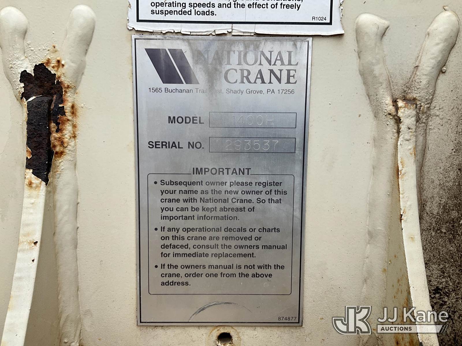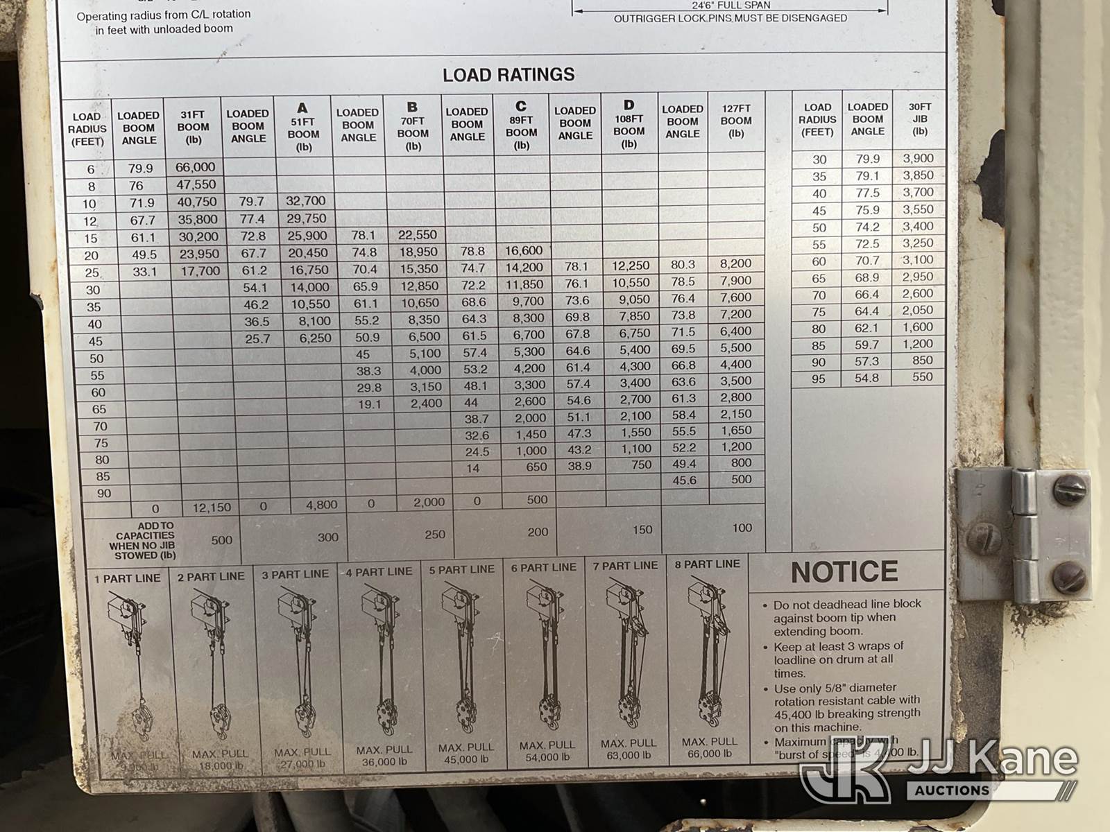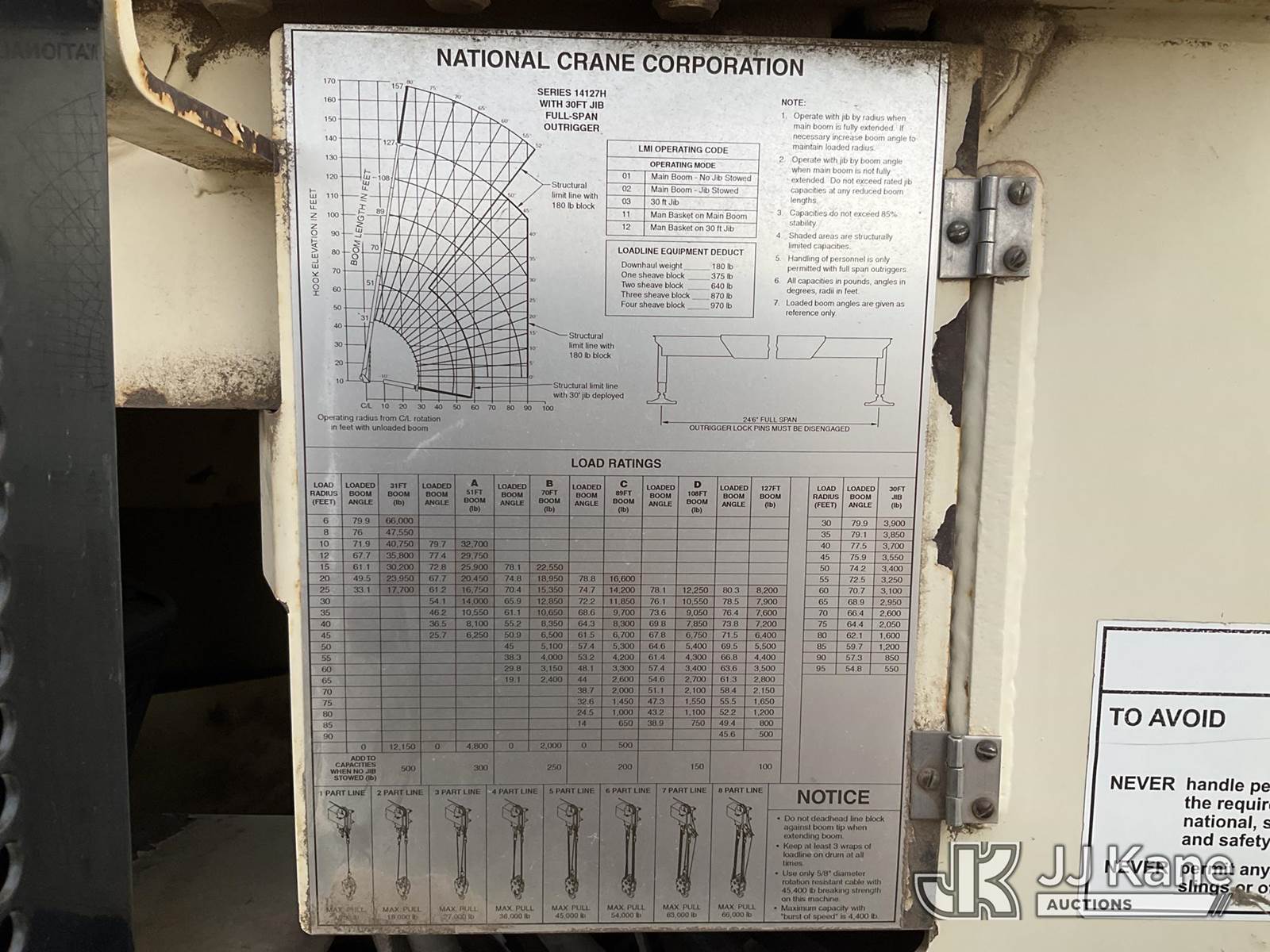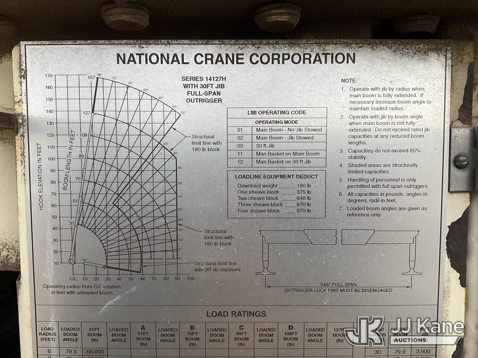 National 1400H, 33-Ton Hydraulic Crane s/n 293537, with 127 Ft 5-Section Hyd Boom W/30 Ft Swing Away Jib, Heel Winch, 35 Ton & 15 Ton Hook Blocks, Two Replacement Outriggers On Flatbed, mounted behind cab on 2007 Sterling L7500 Tri-Axle Flatbed Truck, 8.8L L6 DIESEL 8X6, 10-spd, A/C, (55,759 miles) (Runs Rough, Moves & Operates Rough) (**Dealer Only** Seller states this unit has been removed from service: Issues With Anti Two Block System, Only Operable in Override Mode, Injector Rattle Noise Increases With RPM, Engine Rattle, Bad Injectors, Clutch Issues, Dash Issues, Hydraulic Cooler Line Leak – Requires ANSI Inspection and Chassis diagnostic testing for repair/replacement requirements) (No Emissions Provided, See Bidder Agreement) (Non Drive Away Removal Only: Engine Safety Concern) (Reads 9,938 hours) (Bidding Restricted to Licensed Vehicle Dealers Only), This is a Titled Item NOTE: This unit is being sold AS IS/WHERE IS via Timed Auction and is located in Fort Lupton, CO. Inspection & preview days for this unit are the 2 business days prior to the first day of items closing for this auction, item is located at 2105 Northland Dr Fort Lupton, CO 80621 and hours of operations are 8a-4p. For pre-sale questions, please contact Dakota Hoffman @ (720) 621-0786. Dealer License Number 47109. (Manuals provided in cab) (Buyer is responsible for removal. Assistance by consignor or JJ Kane Auctions is not assured.)