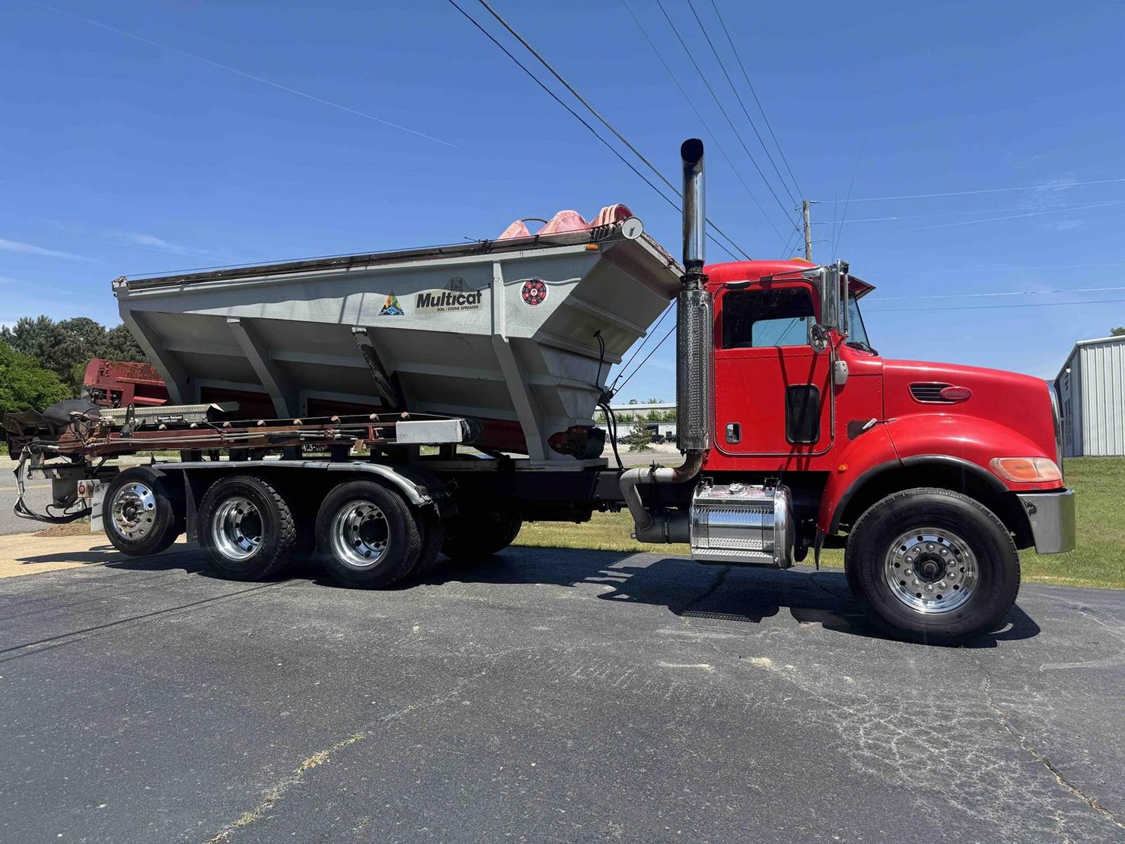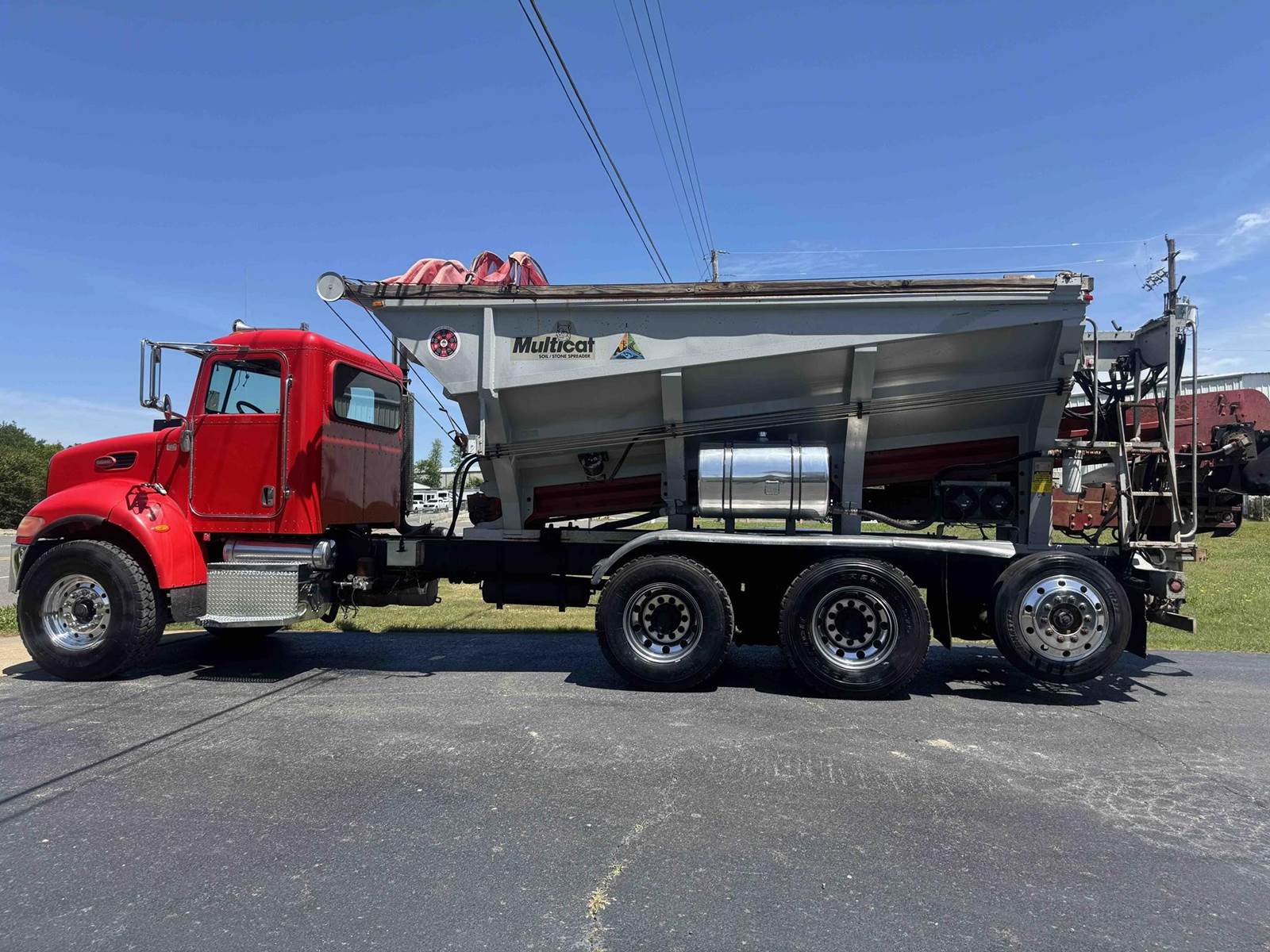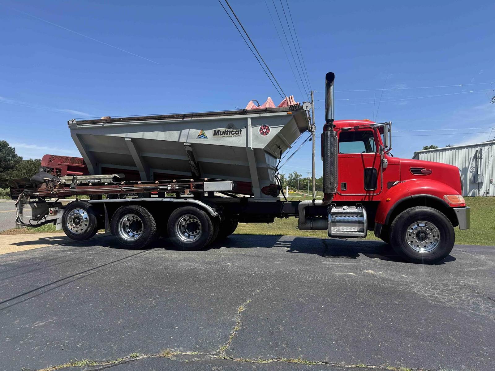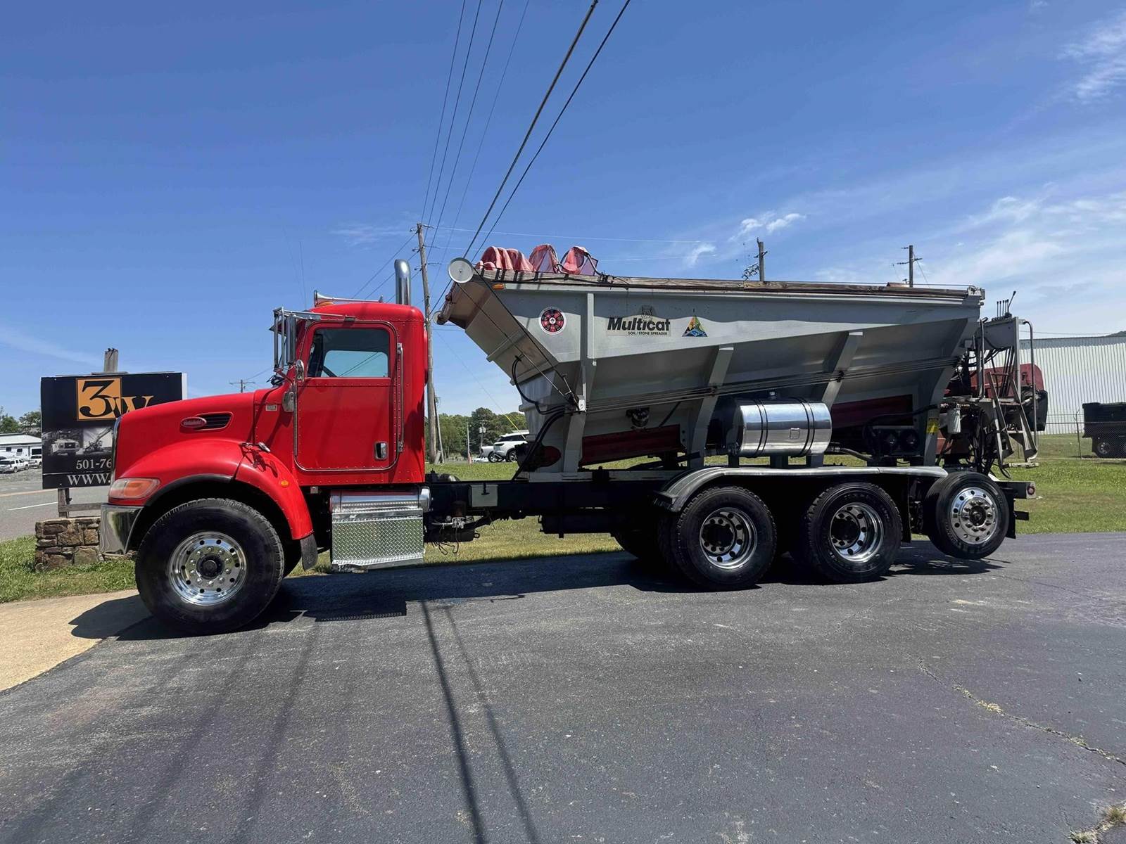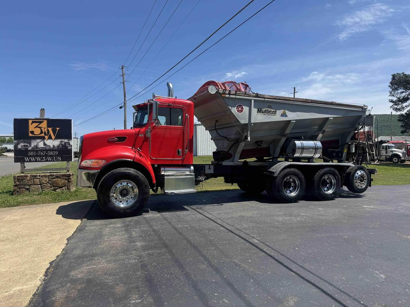 2007 PETERBILT 340, TRI-AXLE SOIL/STONE SPREADER TRUCK, CUMMINS ISC 8.3 LITER 315HP, EATON FULLER 8LL TRANSMISSION,CHALMERS SUSPENSION, STEERABLE LIFT THIRD AXLE, 16K LB FRONT AXLE, 40K LB REAR AXLES, FULL LOCKING DIFFERENTIALS, MULTI-CAT SPREADER BODY, SLIDING TARP, ALUMINUM WHEELS, 425/65/R22.5 FRONT TIRES, 11R22.5 REAR TIRES, ODOMETER READS 196,510.