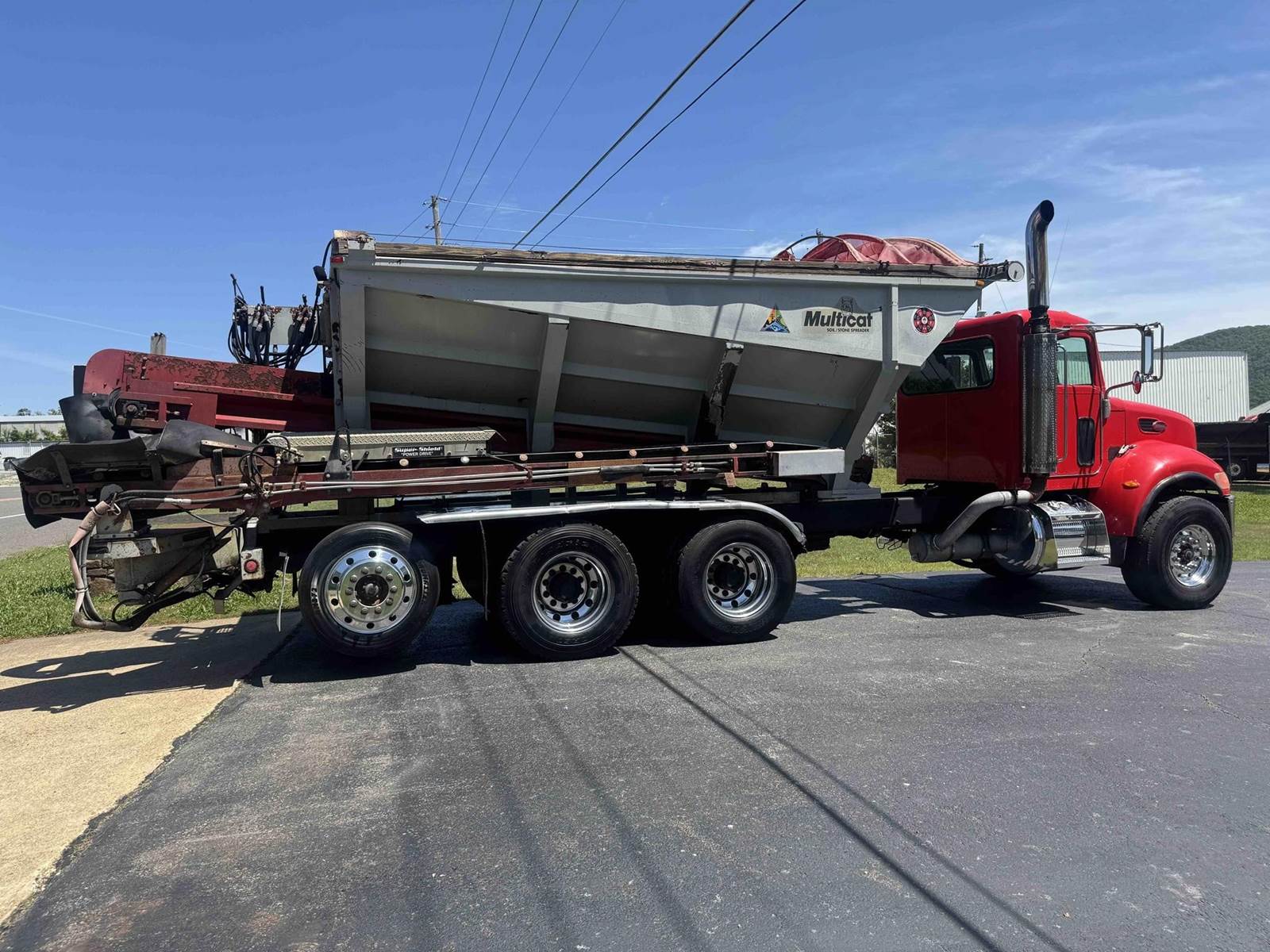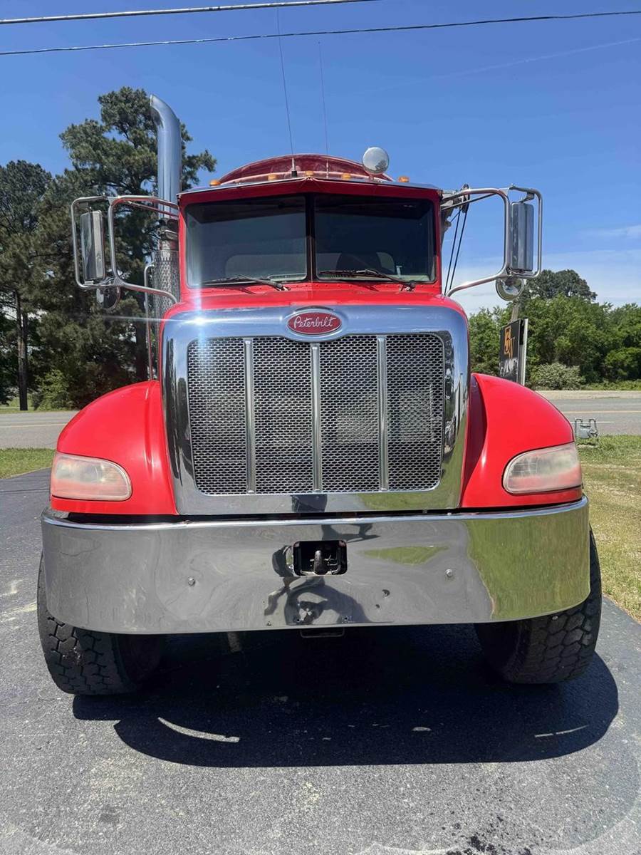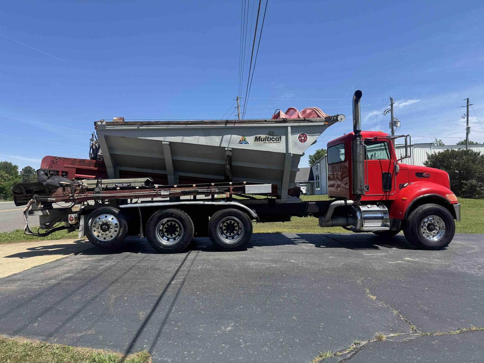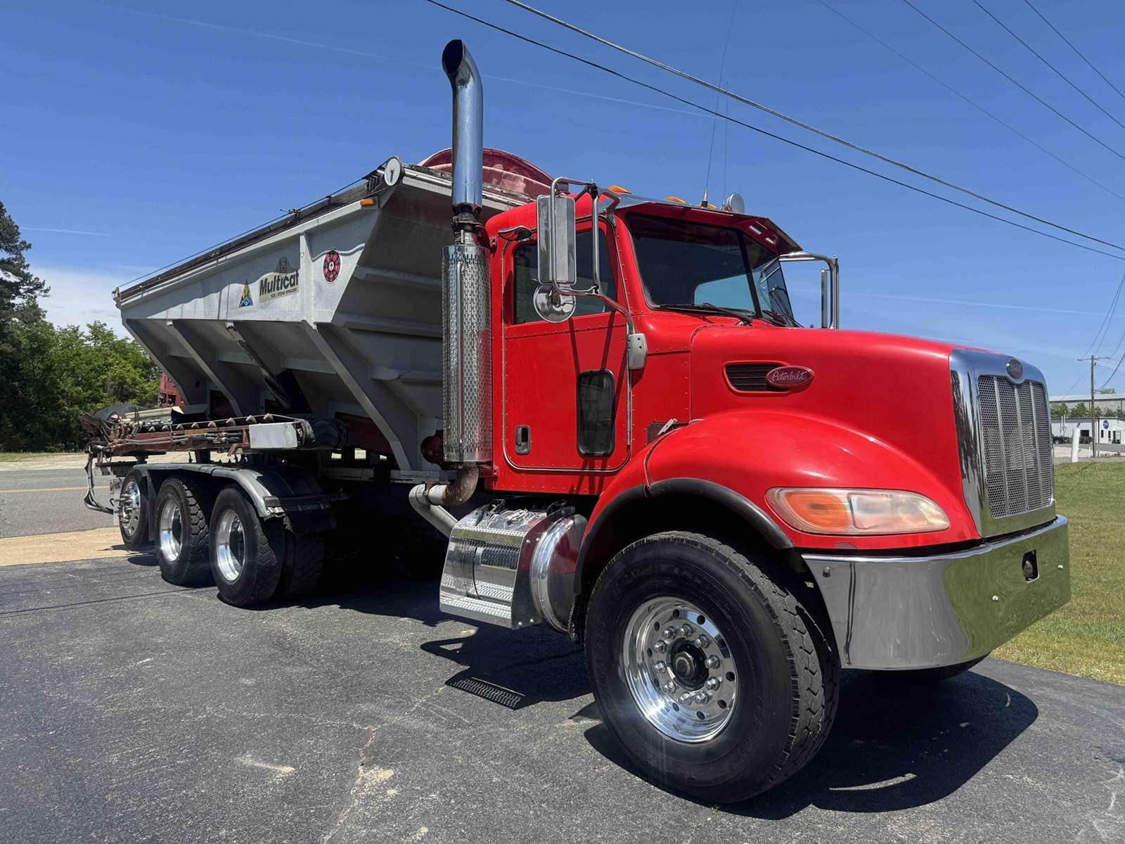2007 PETERBILT 340, TRI-AXLE SOIL/STONE SPREADER TRUCK, CUMMINS ISC 8.3 LITER 315HP, EATON FULLER 8LL TRANSMISSION,CHALMERS SUSPENSION, STEERABLE LIFT THIRD AXLE, 16K LB FRONT AXLE, 40K LB REAR AXLES, FULL LOCKING DIFFERENTIALS, MULTI-CAT SPREADER BODY, SLIDING TARP, ALUMINUM WHEELS, 425/65/R22.5 FRONT TIRES, 11R22.5 REAR TIRES, ODOMETER READS 196,510.