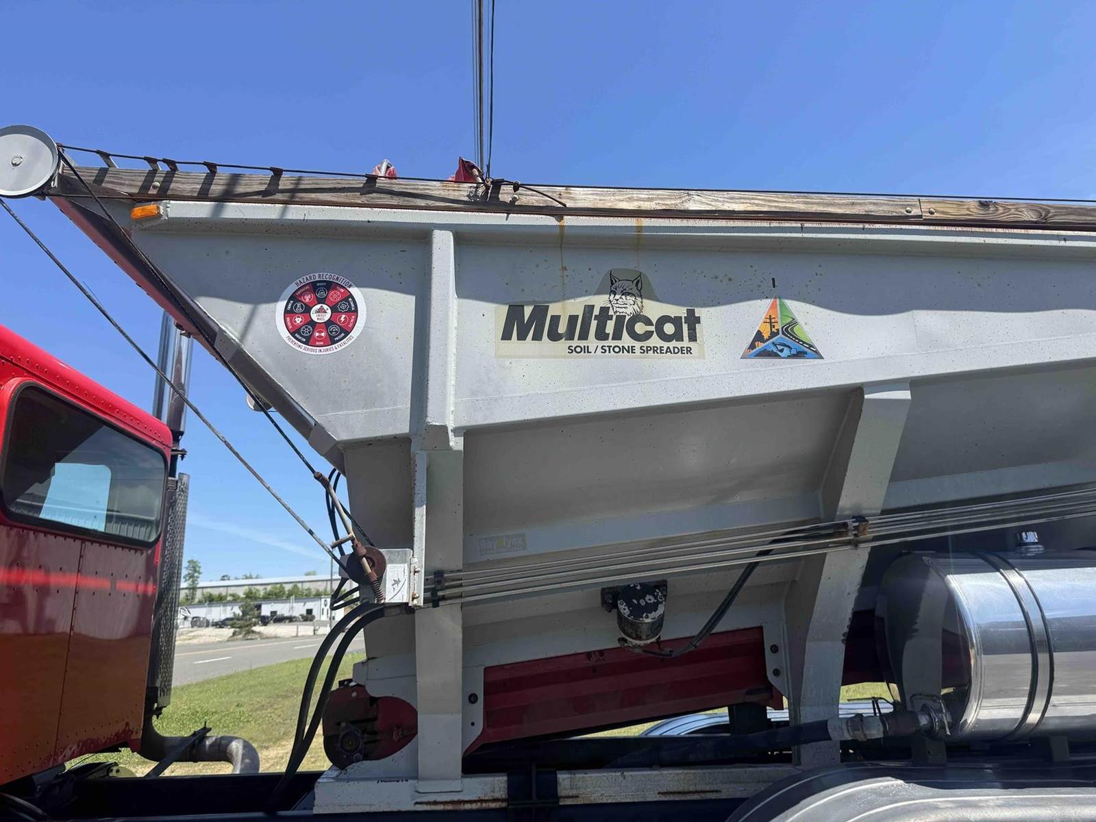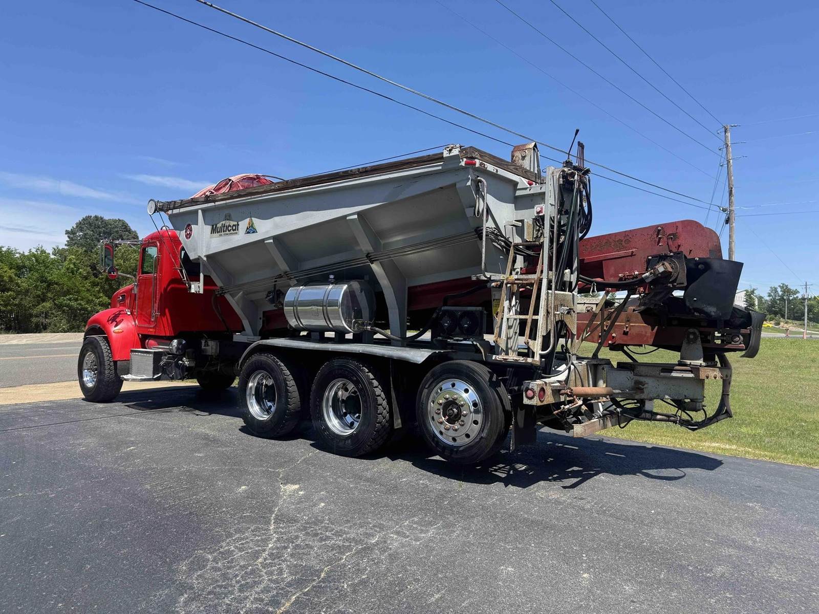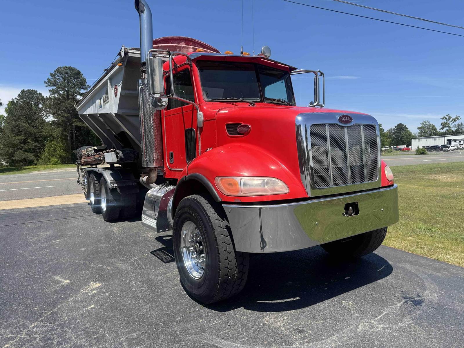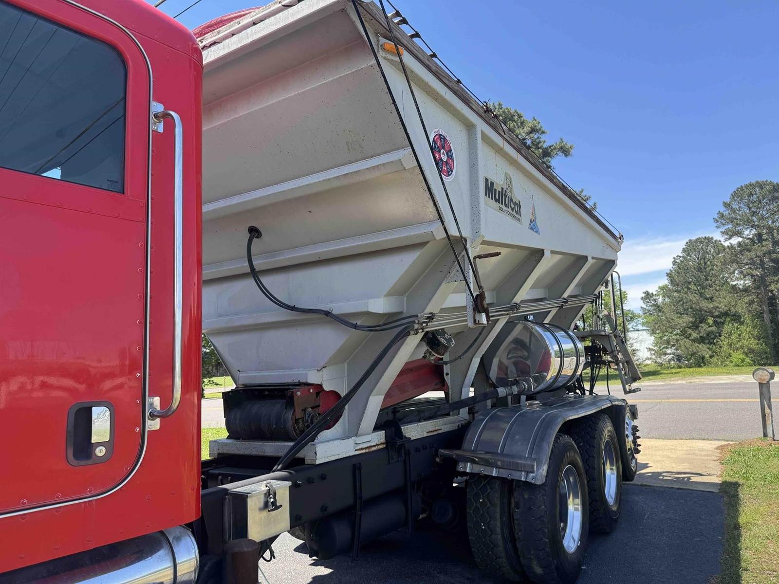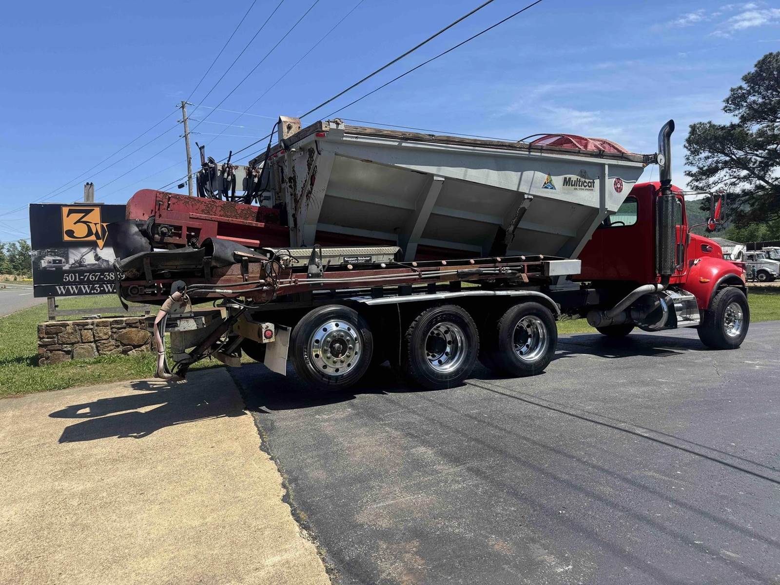 2007 PETERBILT 340, TRI-AXLE SOIL/STONE SPREADER TRUCK, CUMMINS ISC 8.3 LITER 315HP, EATON FULLER 8LL TRANSMISSION,CHALMERS SUSPENSION, STEERABLE LIFT THIRD AXLE, 16K LB FRONT AXLE, 40K LB REAR AXLES, FULL LOCKING DIFFERENTIALS, MULTI-CAT SPREADER BODY, SLIDING TARP, ALUMINUM WHEELS, 425/65/R22.5 FRONT TIRES, 11R22.5 REAR TIRES, ODOMETER READS 196,510.
