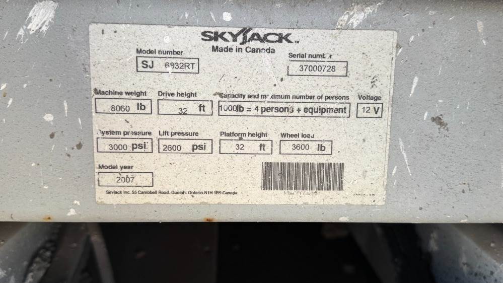 2007 SKYJACK SJ6832RT ROUGH TERRAIN SCISSORLIFT, dual fuel, 32' lift, 4x4, extendable platform, foam filled tires. s/n:37000728 --(DOES NOT RUN)-- --(LOCATED IN COLTON, CA)--