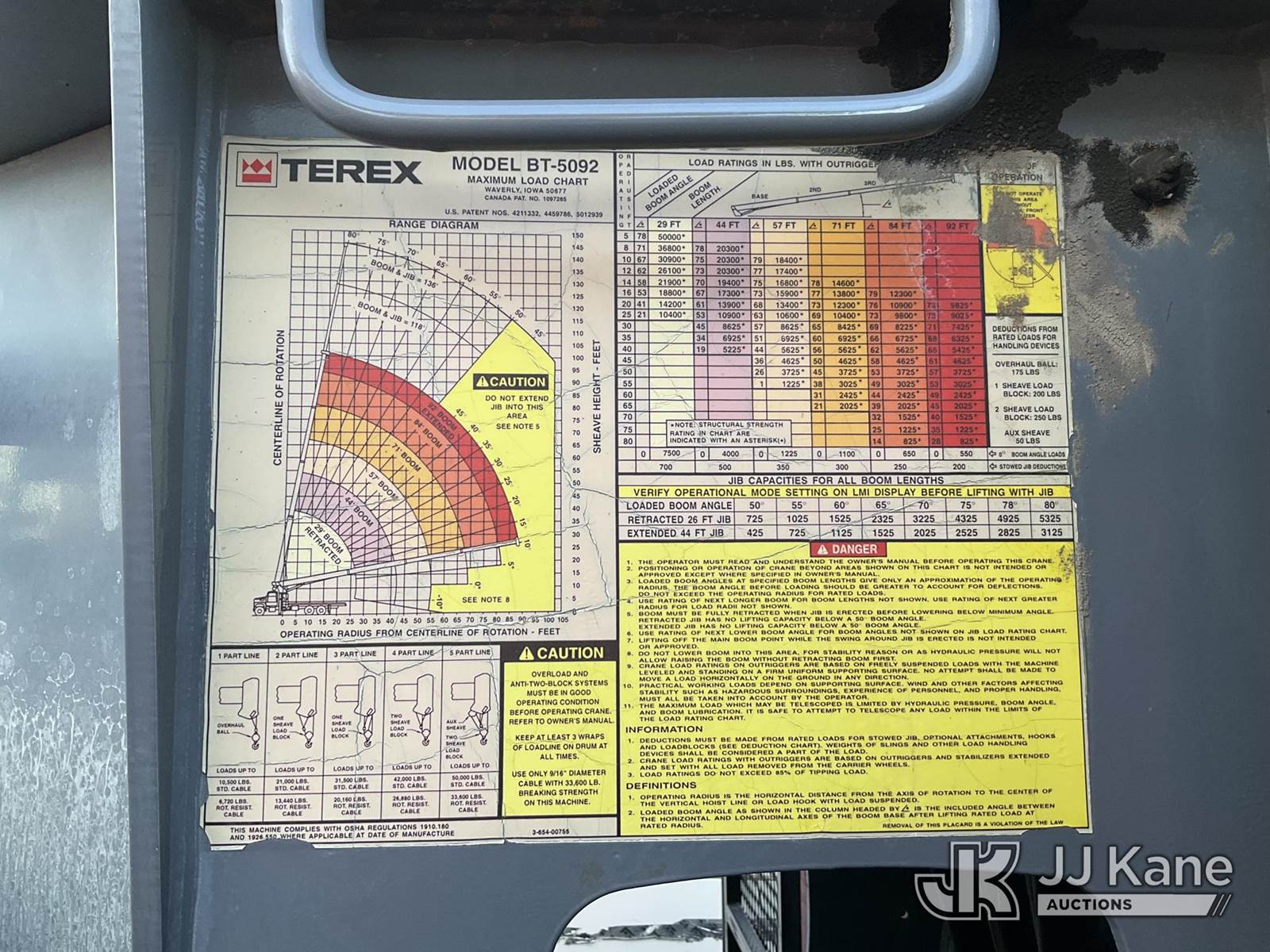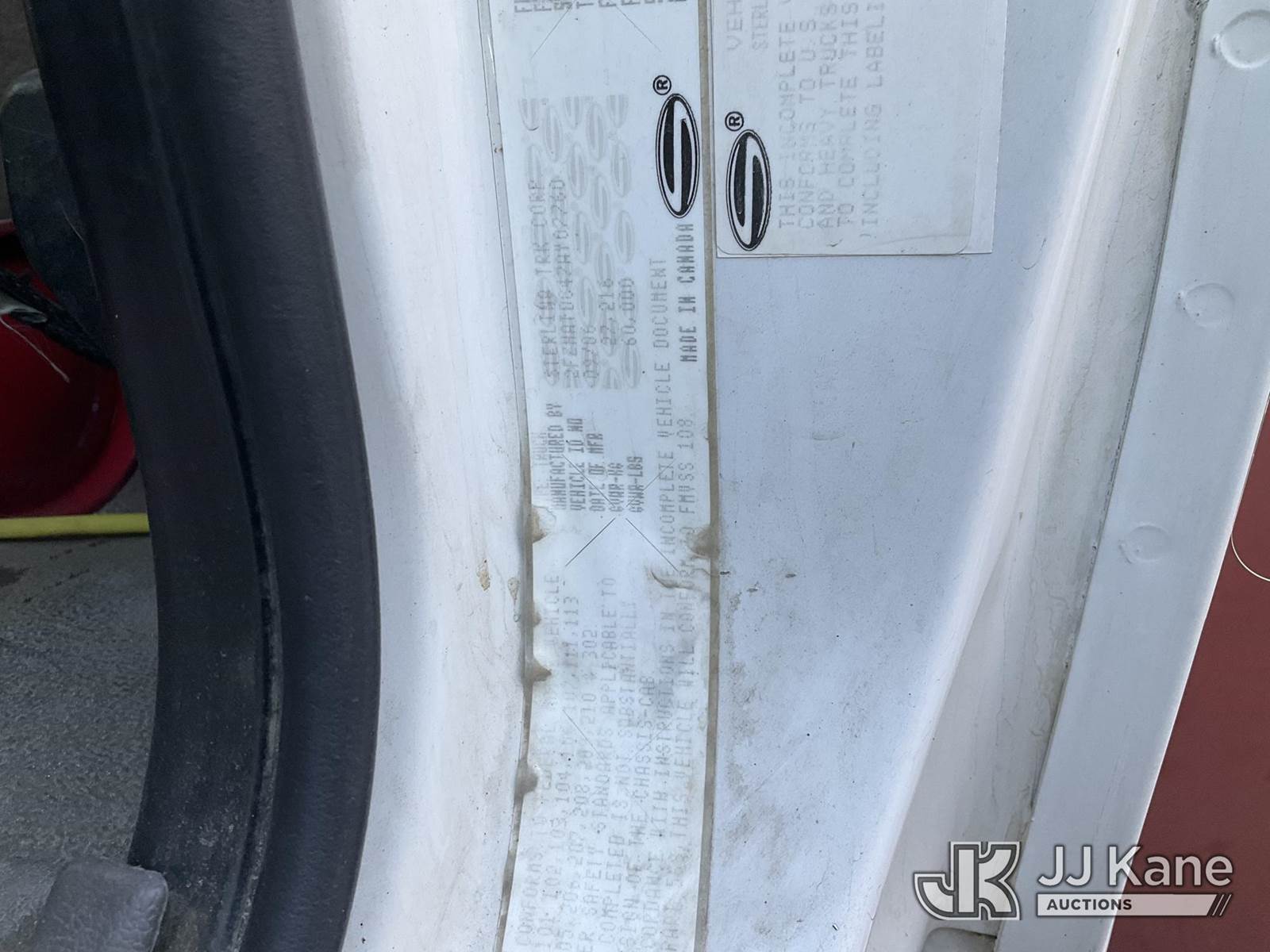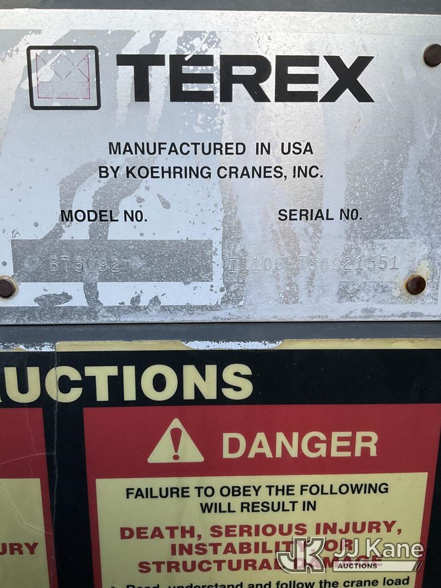 Terex BT-5092, 500,000 Lb Hydraulic Crane s/n I1106BT50921551, with anti two blocking system, 4 stage boom, 5 hyd outriggers,, mounted behind cab on 2007 Sterling LT7500 Flatbed/Utility Truck, s/n 2FZHATDC47AY07760, 7.2L L6 DIESEL 6X4, 8-spd + Lo & Lo-Lo, (35,413 miles) (Runs & Moves, Crane Operates) Subject to CARB Regs,CARB non Compliant,Cannot Operate on CA Roads/Highways until Compliant This is a Titled Item NOTE: This unit is being sold AS IS/WHERE IS via Timed Auction and is located in Jurupa Valley, CA. Inspection & preview days for this unit are the 2 business days prior to the first day of items closing for this auction, item is located at 4510 Muth Way Jurupa Valley, CA 92509 and hours of operations are 8a-4p. For pre-sale questions, please contact please contact Office Staff @ (310) 353-7140. Dealer License Number 45696. (Buyer is responsible for removal. Assistance by consignor or JJ Kane Auctions is not assured.)