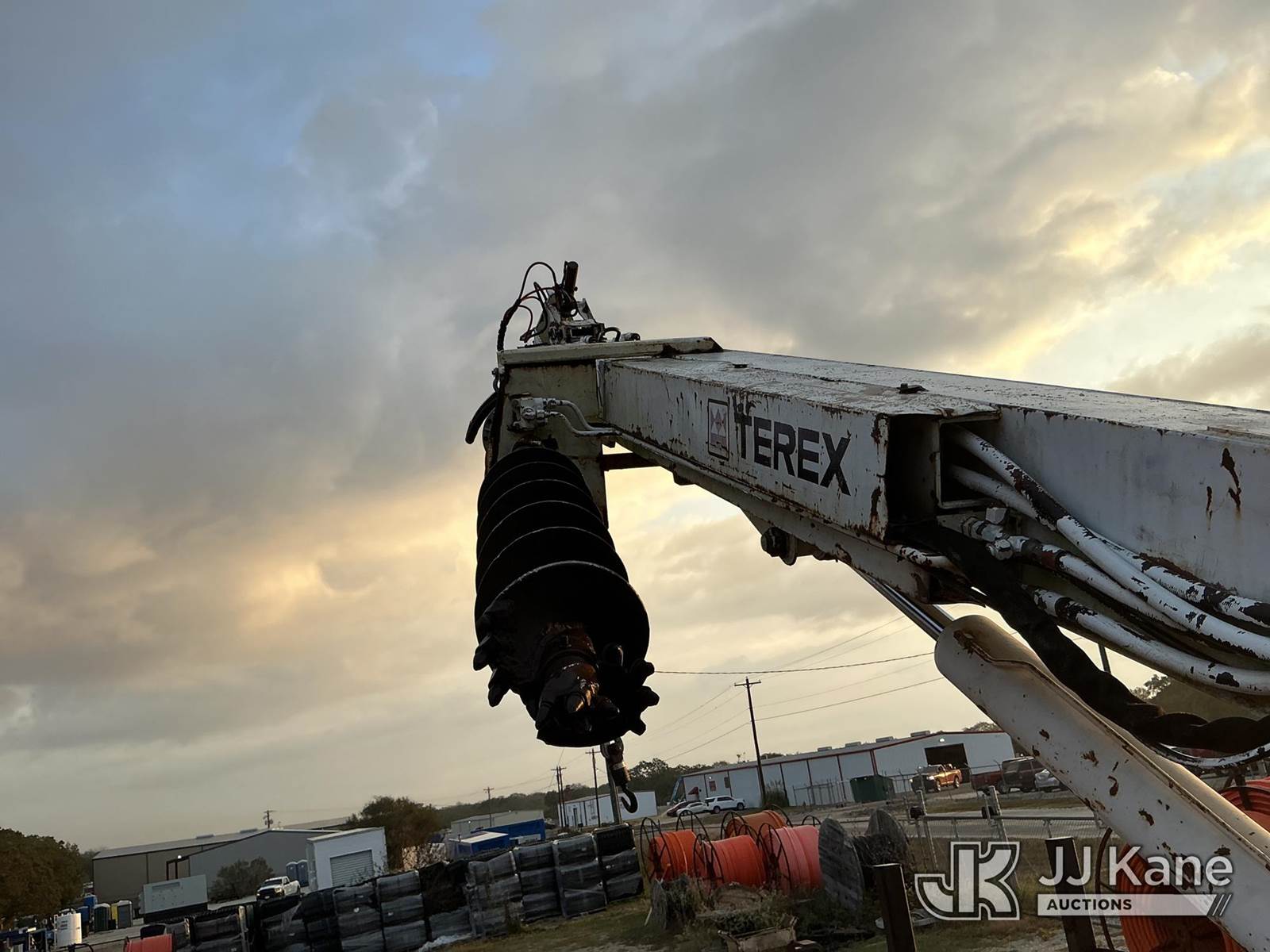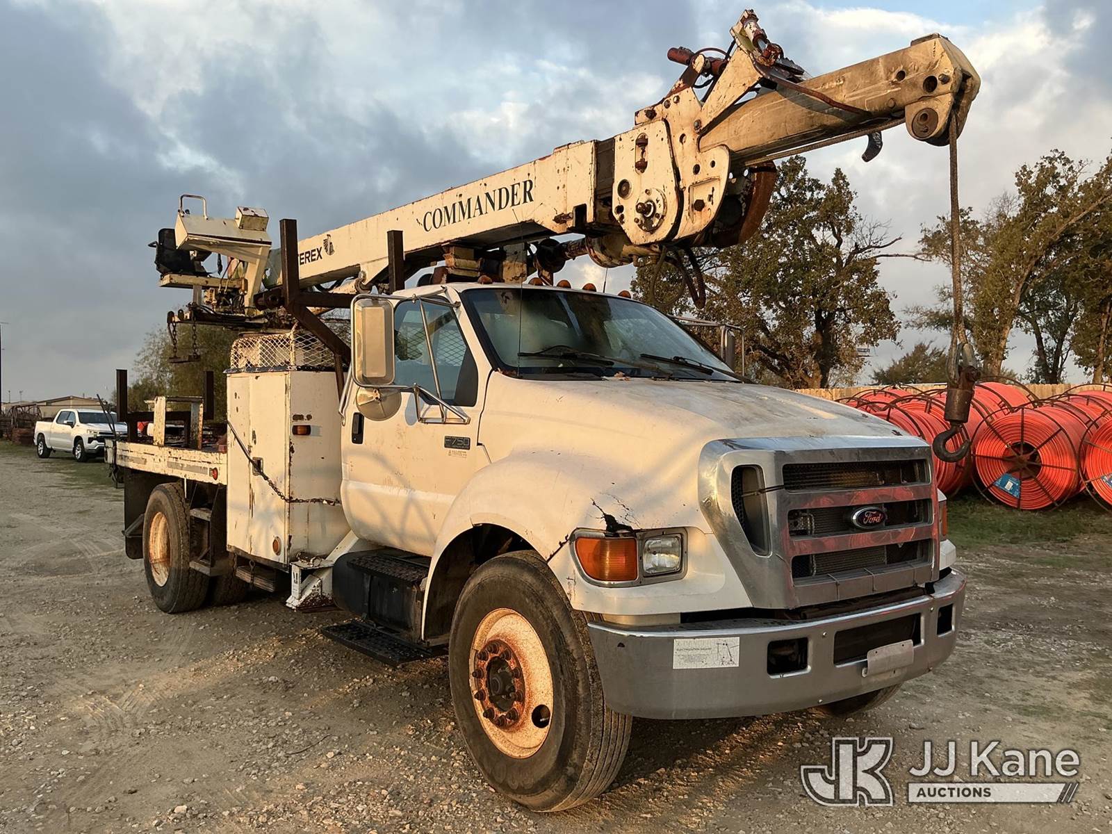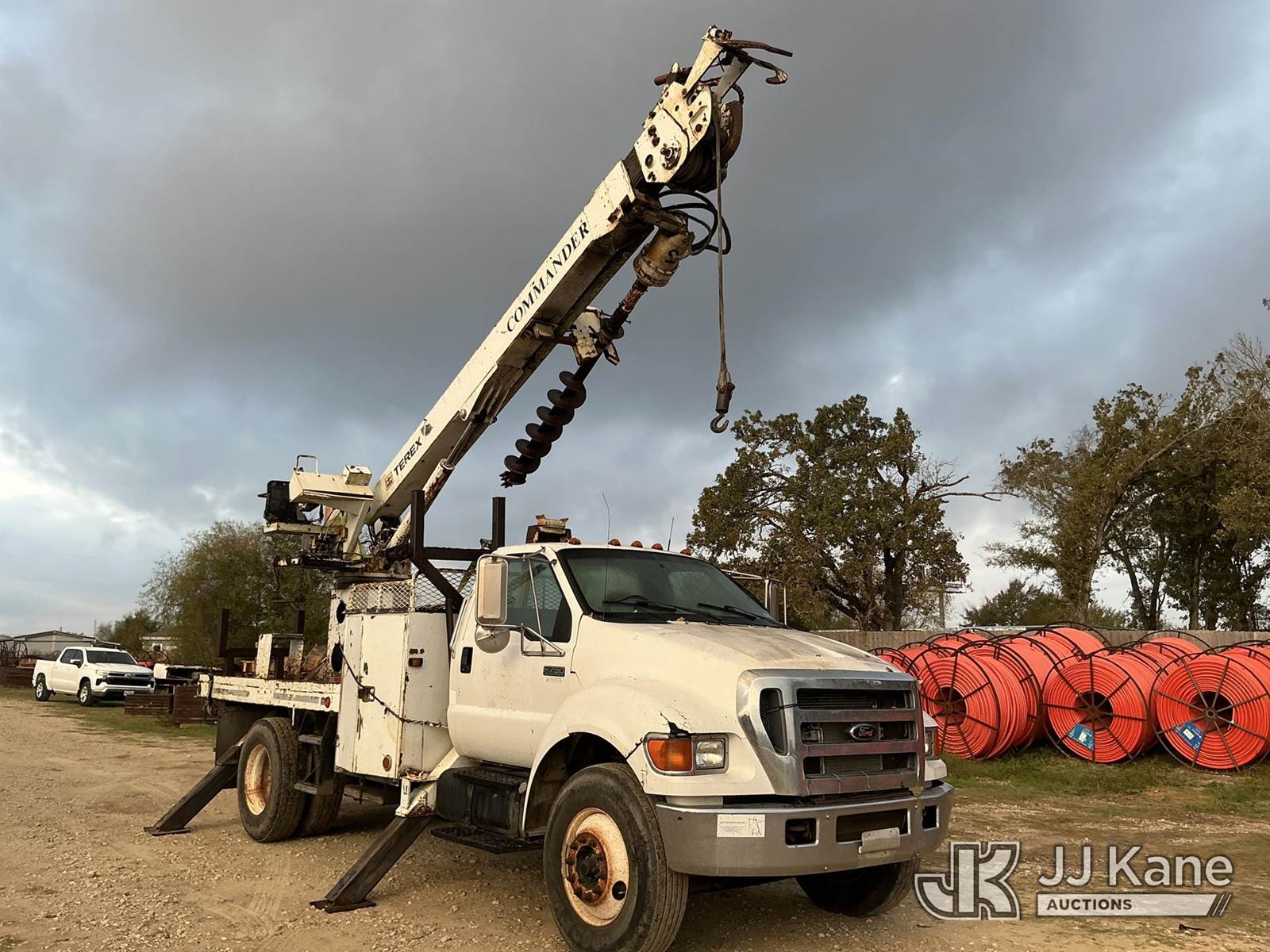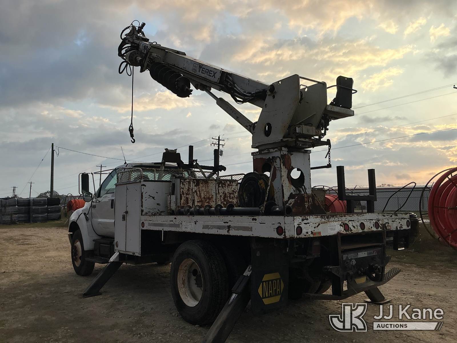 Terex L4045, 17,500 Lb Digger Derrick s/n 1990508928, with 45 ft sheave height, boom tip winch, 2 spd. digger, pole grabs, riding console,, rear mounted on 2007 Ford F-750 Regular Cab DRW Flatbed/Utility Truck, 7.2L L6 diesel Auto, 4X2, A/C, (261,318 miles) (Runs, Moves, & Upper Operates) (Jump To Start) (Seller States: Transmission Issues) This is a Titled Item NOTE: This unit is being sold AS IS/WHERE IS via Timed Auction and is located in Bryan, TX. Inspection & preview days for this unit are by appointment only; please contact us at contact@jjkane.com or 84-Go-JJKane for more details. (Missing manuals, See Auction Company for Manufacturers Information to obtain manuals) (Buyer is responsible for removal. Assistance by consignor or JJ Kane Auctioneers is not assured.)