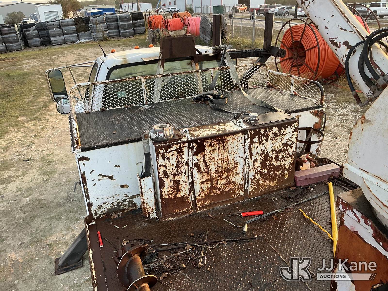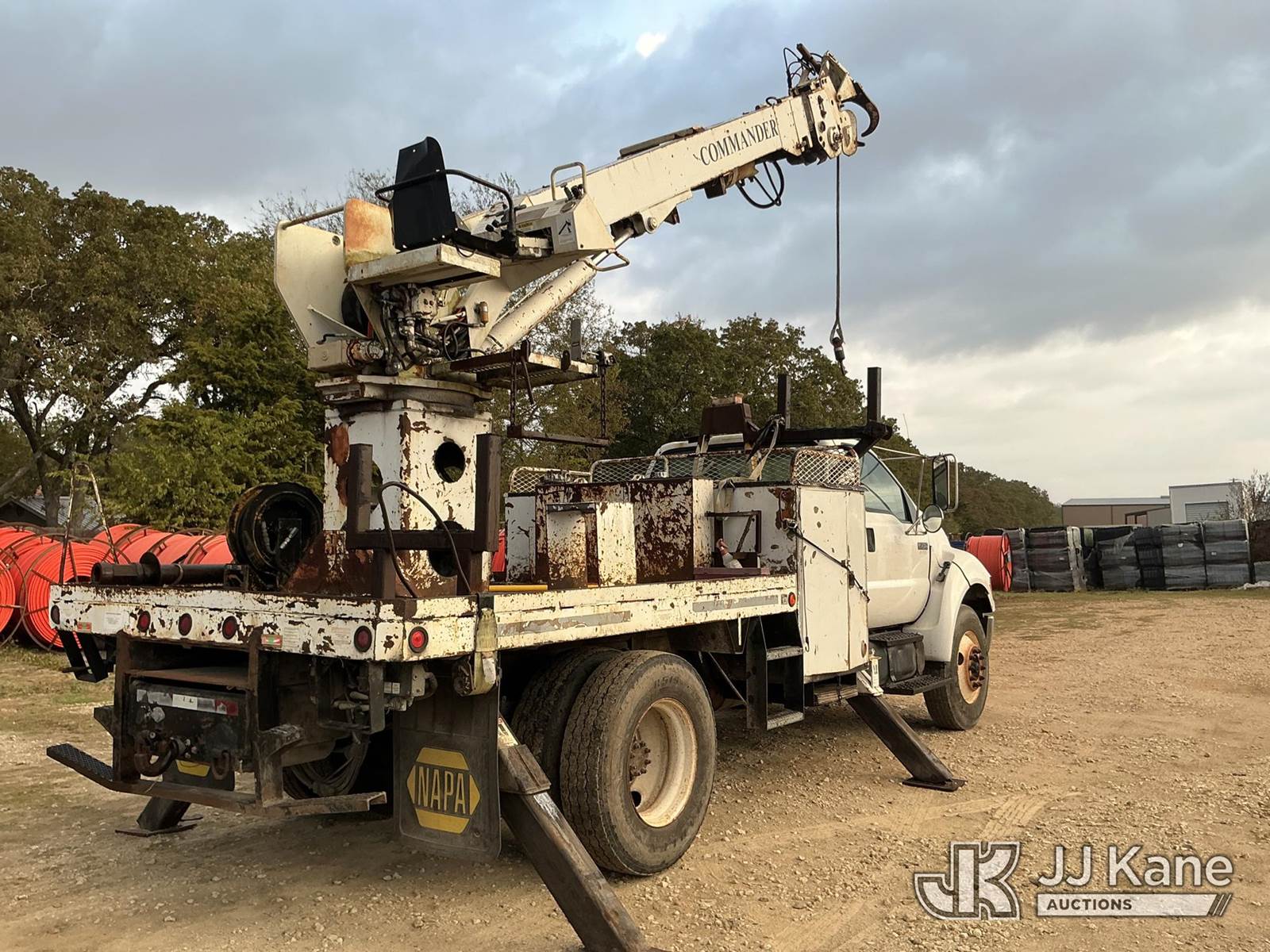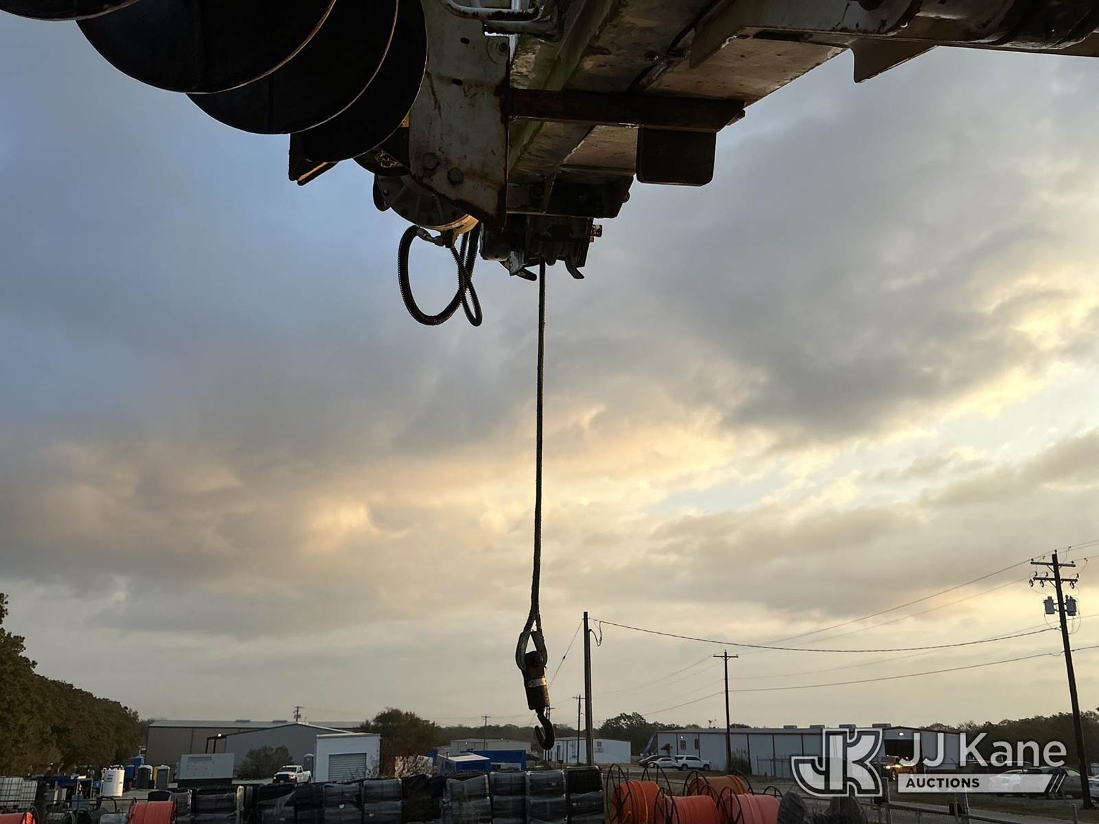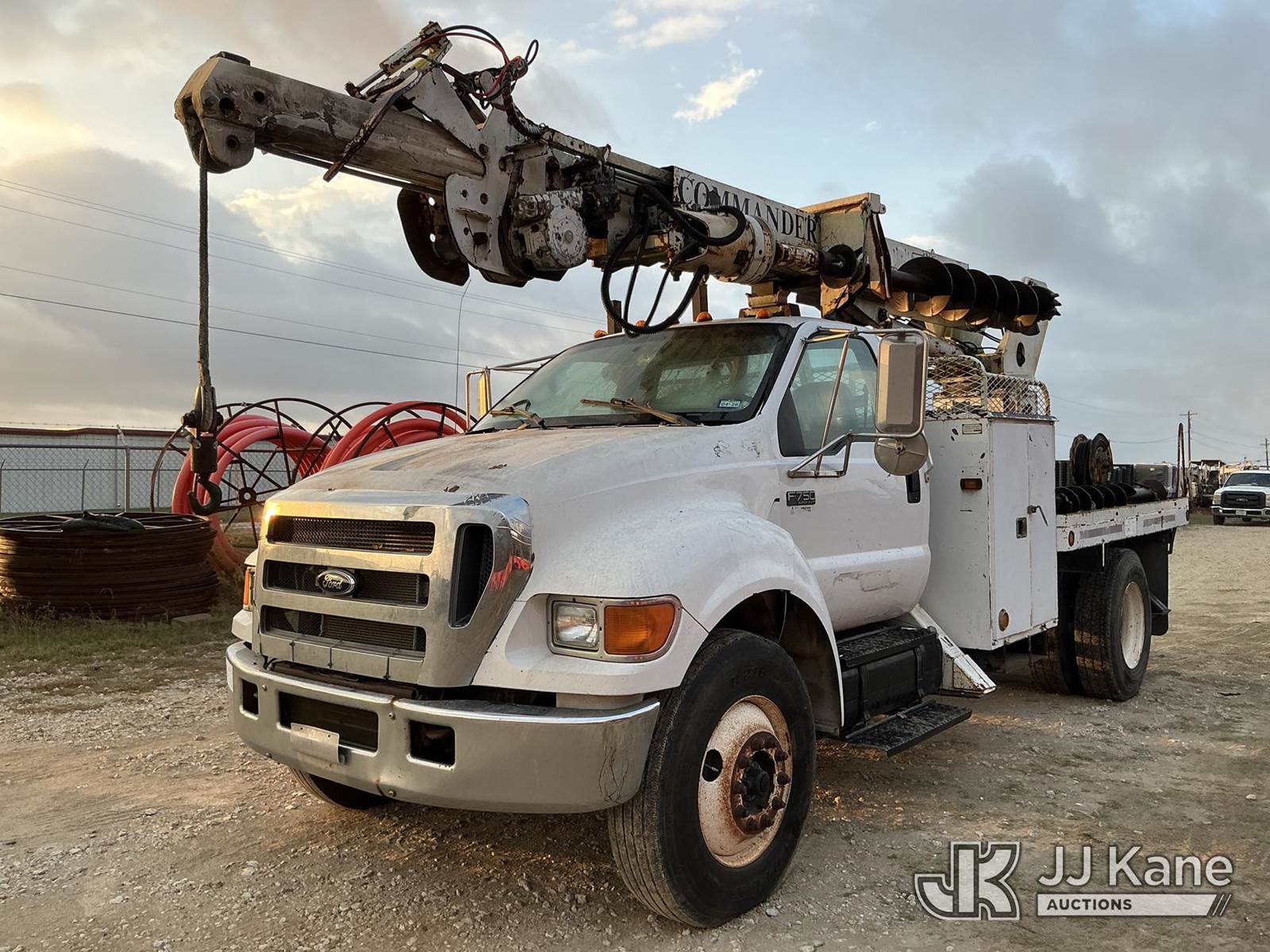Terex L4045, 17,500 Lb Digger Derrick s/n 1990508928, with 45 ft sheave height, boom tip winch, 2 spd. digger, pole grabs, riding console,, rear mounted on 2007 Ford F-750 Regular Cab DRW Flatbed/Utility Truck, 7.2L L6 diesel Auto, 4X2, A/C, (261,318 miles) (Runs, Moves, & Upper Operates) (Jump To Start) (Seller States: Transmission Issues) This is a Titled Item NOTE: This unit is being sold AS IS/WHERE IS via Timed Auction and is located in Bryan, TX. Inspection & preview days for this unit are by appointment only; please contact us at contact@jjkane.com or 84-Go-JJKane for more details. (Missing manuals, See Auction Company for Manufacturers Information to obtain manuals) (Buyer is responsible for removal. Assistance by consignor or JJ Kane Auctioneers is not assured.)