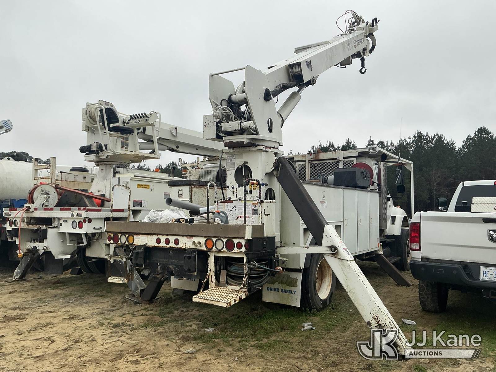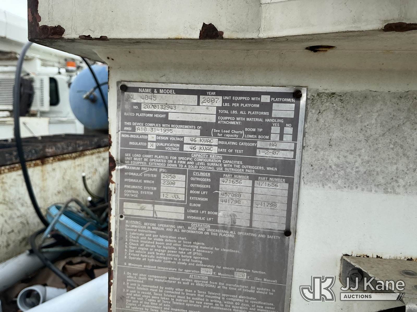 Terex/Telelect XL4045, Digger Derrick s/n 2070132943, with 45ft sheave height, three stage hydraulic boom, tip winch, upper controls, pole grabs, standing console, and four hydraulic outriggers, corner mounted on 2007 International 7400 Utility Truck, DT466 diesel, Auto, A/C, with front winch, (100,675 miles) (Runs, Moves, Upper Operates, Jump to Start, Lift Capacity Load Chart Missing) This is a Titled Item NOTE: This unit is being sold AS IS/WHERE IS via Timed Auction and is located in La Grange, NC. Inspection & preview days for this unit are by appointment only; please contact us at contact@jjkane.com or 84-Go-JJKane for more details. (Missing manuals, See Auction Company for Manufacturers Information to obtain manuals) (Buyer is responsible for removal. Assistance by consignor or JJ Kane Auctions is not assured.)
