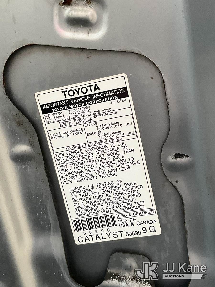 2007 Toyota Tundra 4x4 Crew-Cab Pickup Truck, 8-cyl gas, Auto, A/C, (221,275 miles) (Runs & Moves) (Loud Exhaust) This is a Titled Item NOTE: This unit is being sold AS IS/WHERE IS via Timed Auction and is located in South Beloit, IL. Inspection & preview days for this unit are the 2 business days prior to the first day of items closing for this auction, item is located at 14354 Dearborn Ave South Beloit, IL and hours of operations are 8a-4p. For pre-sale questions, please contact Derek Eklund at (608) 904-0618 or (derek.eklund@jjkane.com). (Buyer is responsible for removal. Assistance by consignor or JJ Kane Auctions is not assured.)