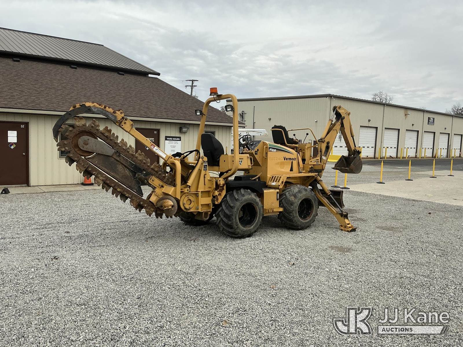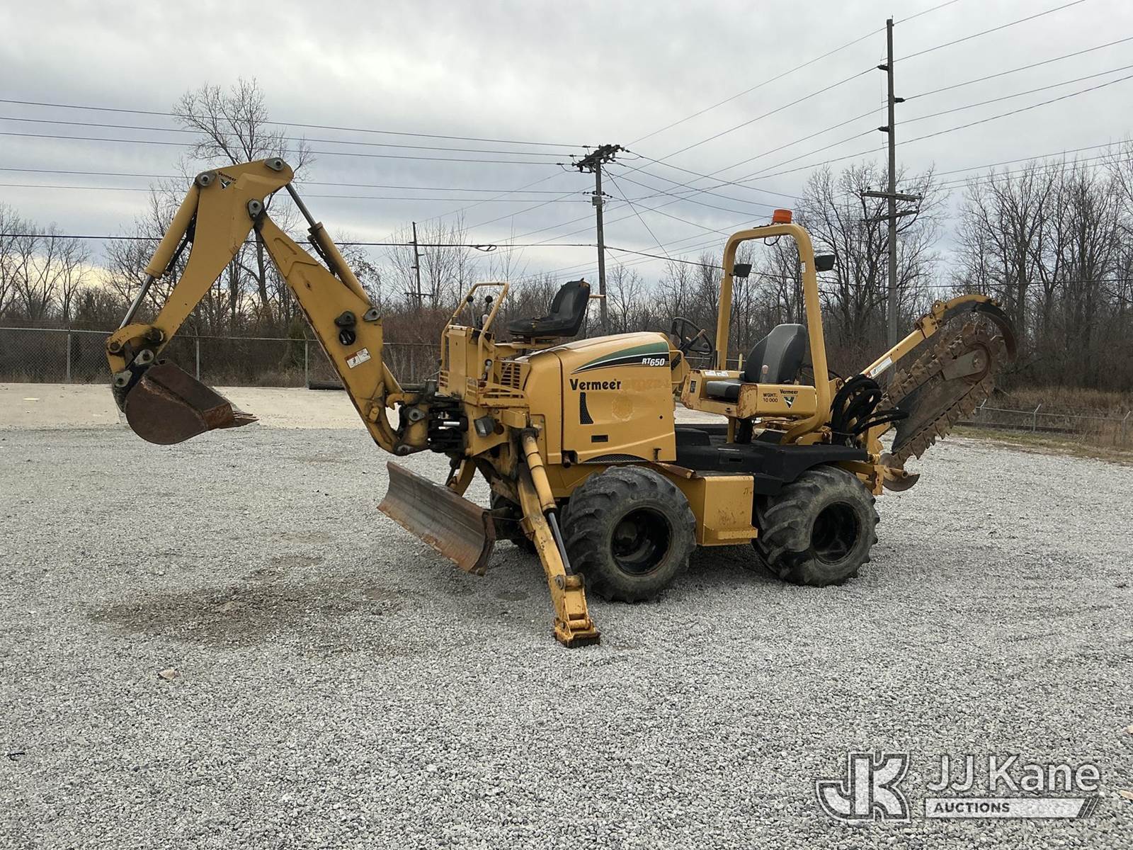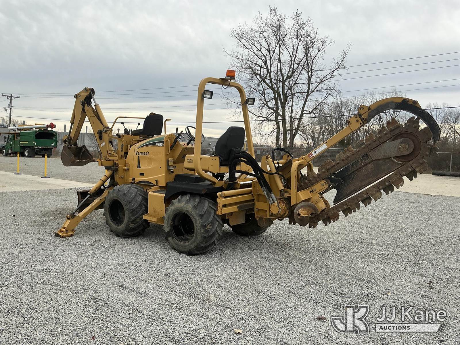 2007 Vermeer RT650 Rubber Tired Trencher, s/n 1VRZ0821271000548, Deutz diesel, Hydrostatic, with sliding trencher boom w/ C-cup chain, backhoe attachment, 6-way backfill blade & ROPS, (Runs, Moves & Operates) (Body Damage, Hydraulic Fluid Leak) (Reads 1,365 hours) NOTE: This unit is being sold AS IS/WHERE IS via Timed Auction and is located in Fort Wayne, IN. For more information & removal arrangements please contact Office Staff @ (260) 450-9822. Load out by appointment only, Buyer/Hauler must present copy of paid invoice upon arrival. Purchaser acknowledges ALL lots must be removed within (10) business days of Auction, or a storage fee may be incurred. For load out and pick up information, please reference the hauler sheet sent out after purchase. (Buyer is responsible for removal. Assistance by consignor or JJ Kane Auctioneers is not assured.)