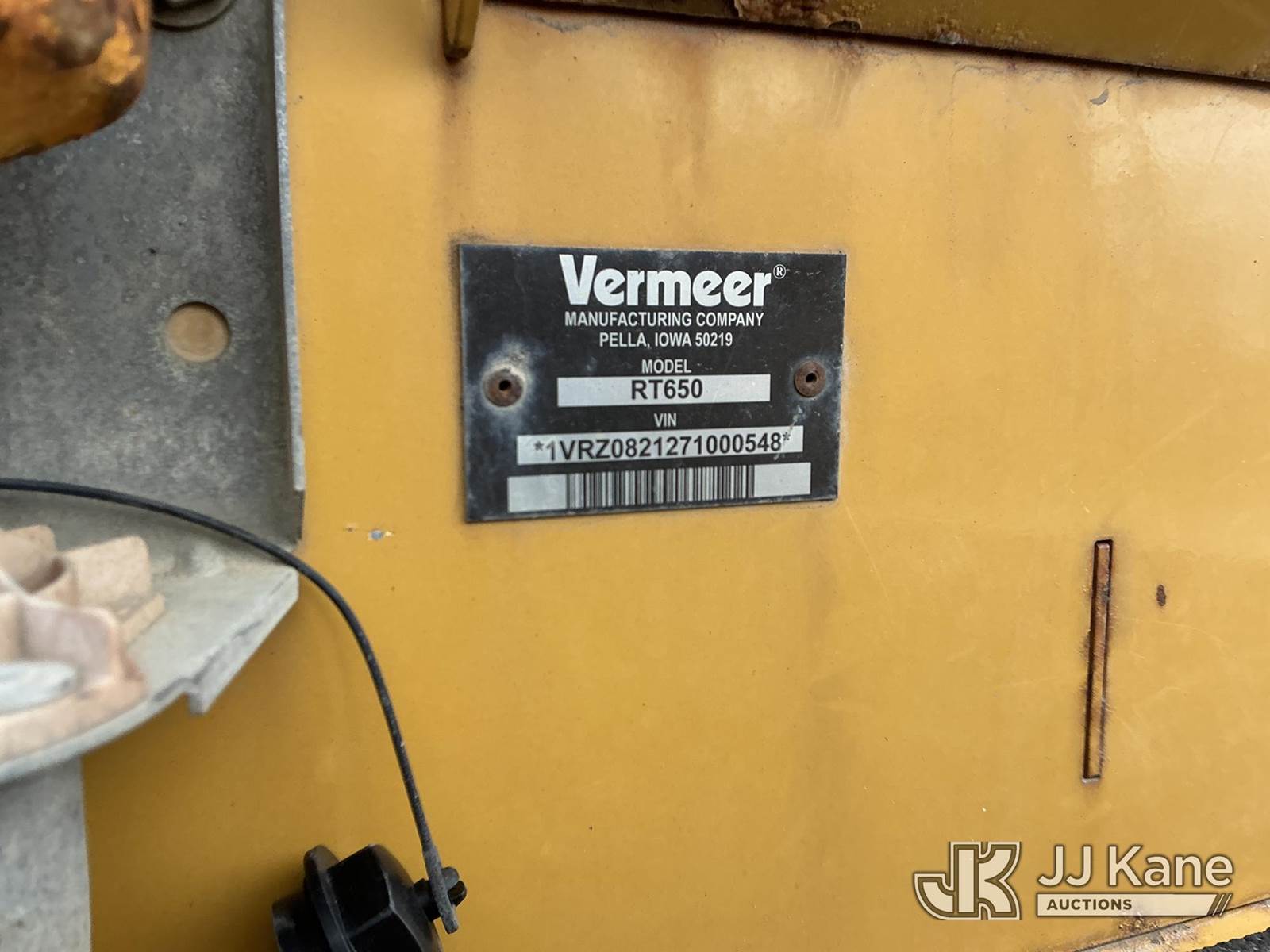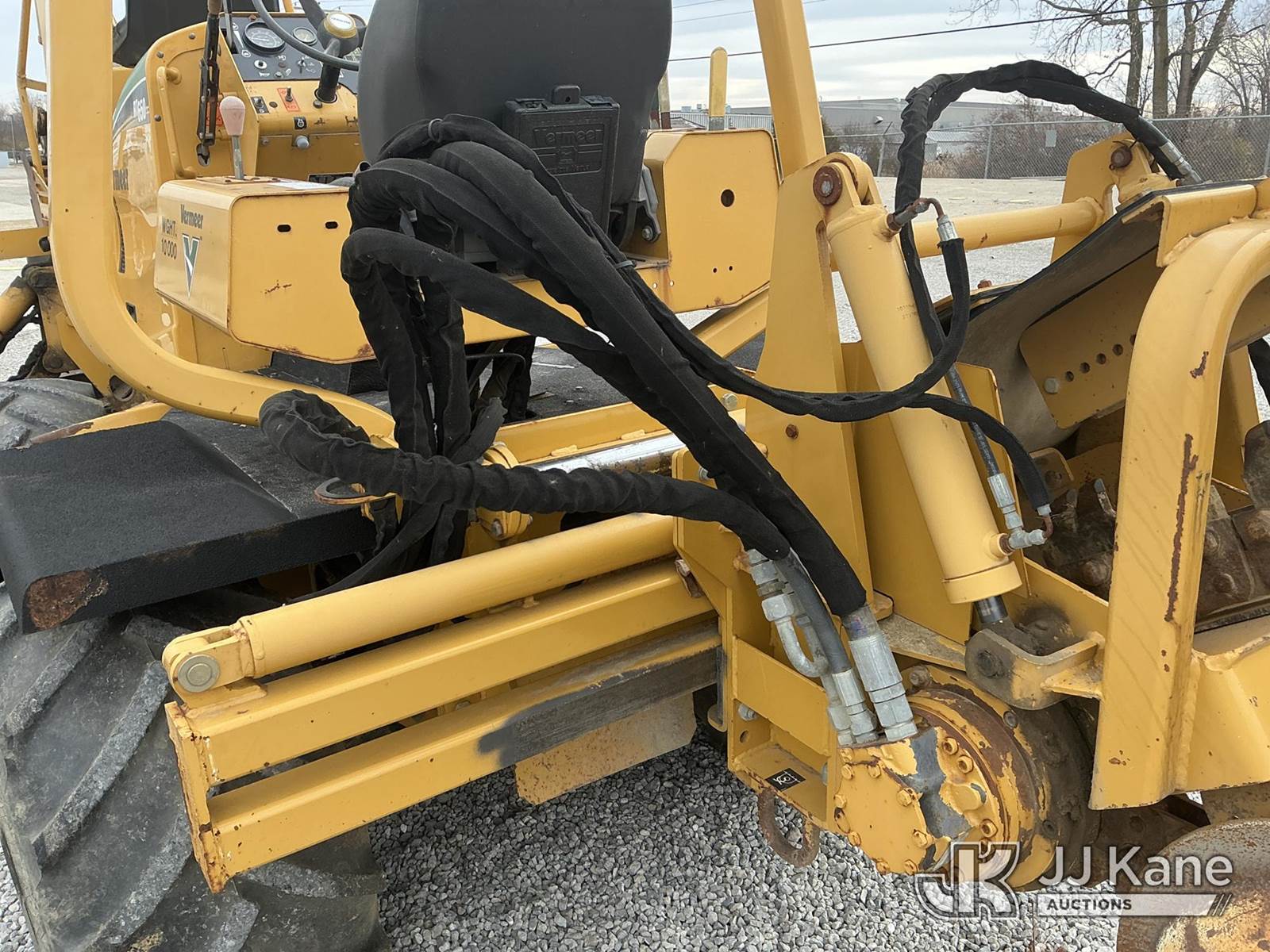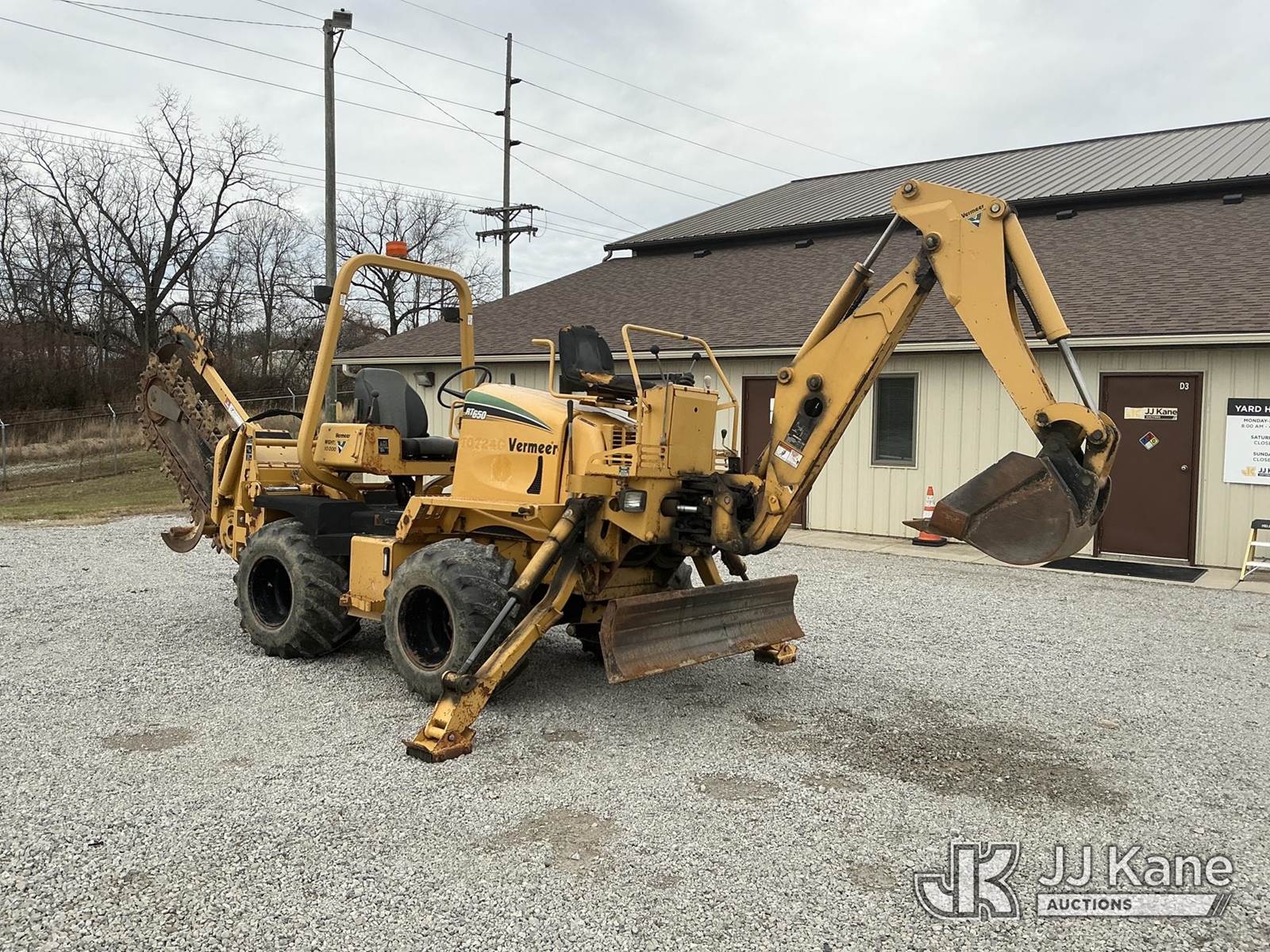 2007 Vermeer RT650 Rubber Tired Trencher, s/n 1VRZ0821271000548, Deutz diesel, Hydrostatic, with sliding trencher boom w/ C-cup chain, backhoe attachment, 6-way backfill blade & ROPS, (Runs, Moves & Operates) (Body Damage, Hydraulic Fluid Leak) (Reads 1,365 hours) NOTE: This unit is being sold AS IS/WHERE IS via Timed Auction and is located in Fort Wayne, IN. For more information & removal arrangements please contact Office Staff @ (260) 450-9822. Load out by appointment only, Buyer/Hauler must present copy of paid invoice upon arrival. Purchaser acknowledges ALL lots must be removed within (10) business days of Auction, or a storage fee may be incurred. For load out and pick up information, please reference the hauler sheet sent out after purchase. (Buyer is responsible for removal. Assistance by consignor or JJ Kane Auctioneers is not assured.)