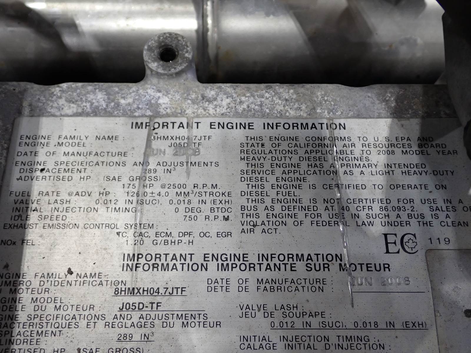 2008 Hino J05D-TF diesel engine, 175 HP at 2500 RPM rating, turbocharged, air to air intercooled, J05 series, EPA family # 8HMXH04.7JTF, complete as pictured . ENGINE TEST RAN CLEAN, 50 PSI OIL PRESSURE AT IDLE AND 70 LBS AT FULL THROTTLE, NO SMOKE OR BLOWBY OBSERVED DURING COLD TEST RUN. HARD TO FIND TRUCK ENGINE, SHOWING ONLY 110K MILES WHEN REMOVED -- DON'T MISS IT !!