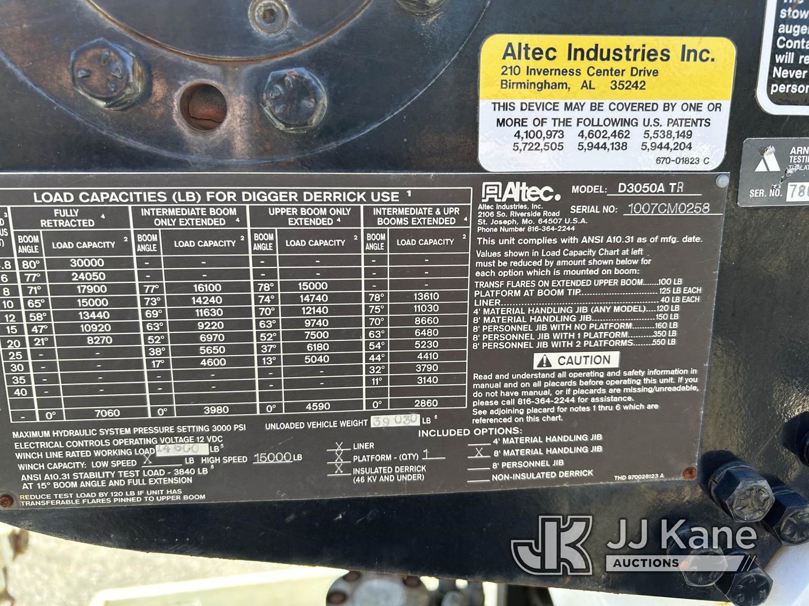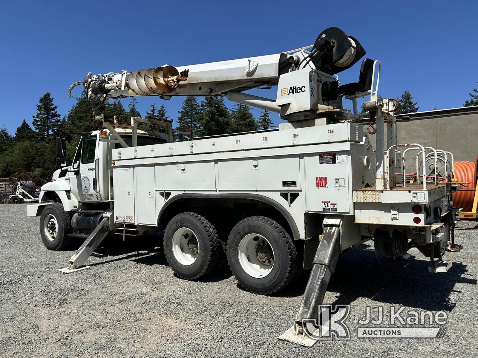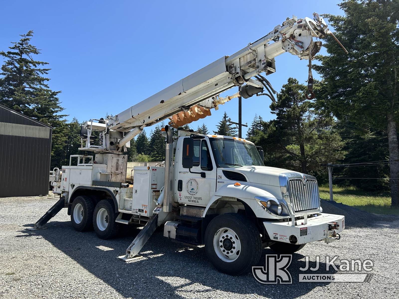 Altec D3050A-TR, 30,000 Lb Digger Derrick s/n 1007CM0258, with 50 ft sheave height, 3 sec hyd boom, 2 spd digger, heel winch, pole grabs, upper controls, riding console, and 4 hyd outriggers, rear mounted on 2008 International 7500 T/A Utility Truck, MaxxForce 9.3L diesel, 13-spd, A/C, (53,140 miles) (Runs, Moves & Upper Operates) (Reads 2,116 hours) This is a Titled Item NOTE: This unit is being sold AS IS/WHERE IS via Timed Auction and is located in Port Orford, OR. For pre-sale questions or concerns about the vehicle, to schedule an inspection or vehicle pick-up please contact Ry Hampton at 206-247-8928 or ry.hampton@jjkane.com. (Manuals provided in cab) (Buyer is responsible for removal. Assistance by consignor or JJ Kane Auctions is not assured.)