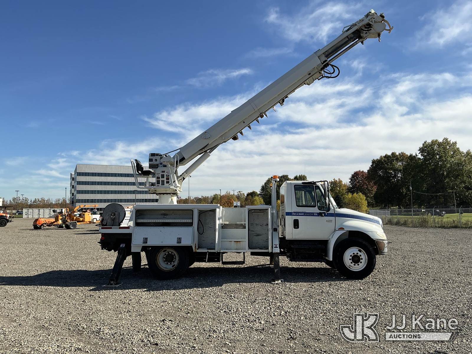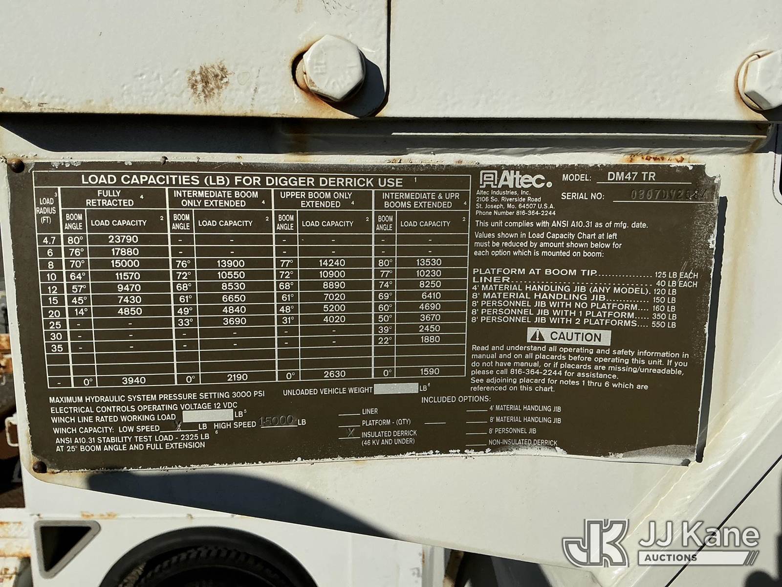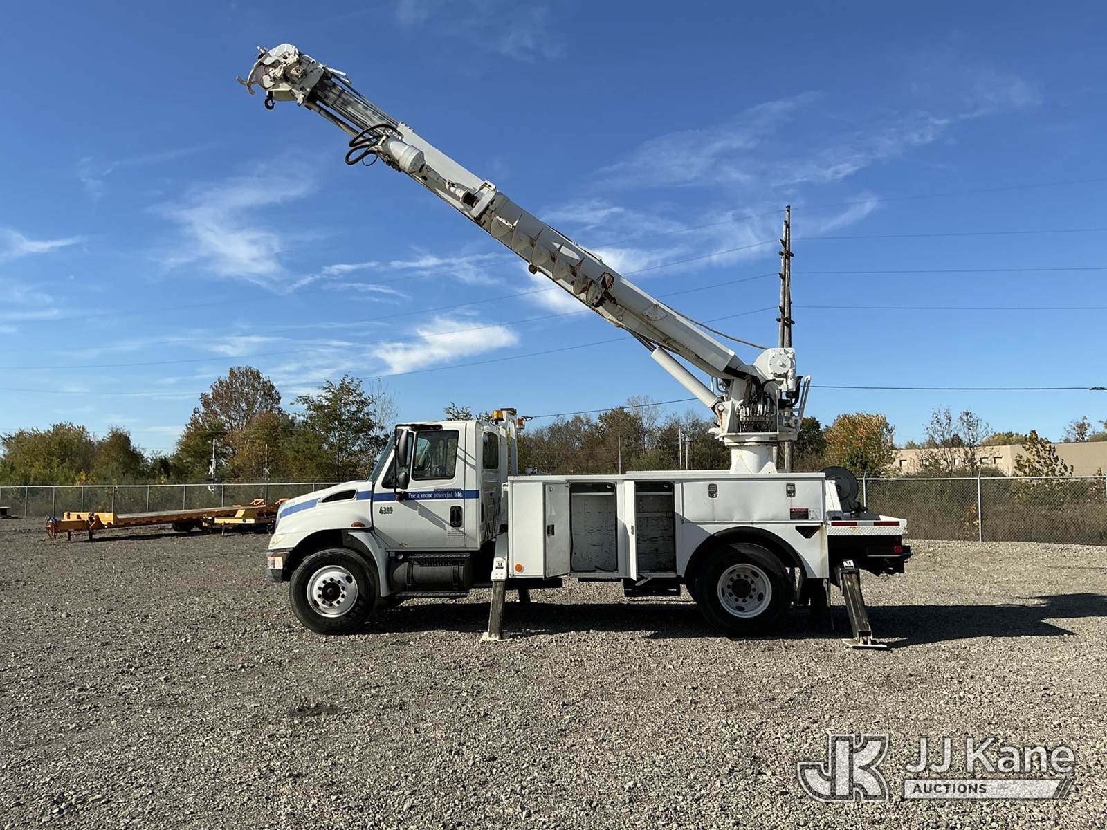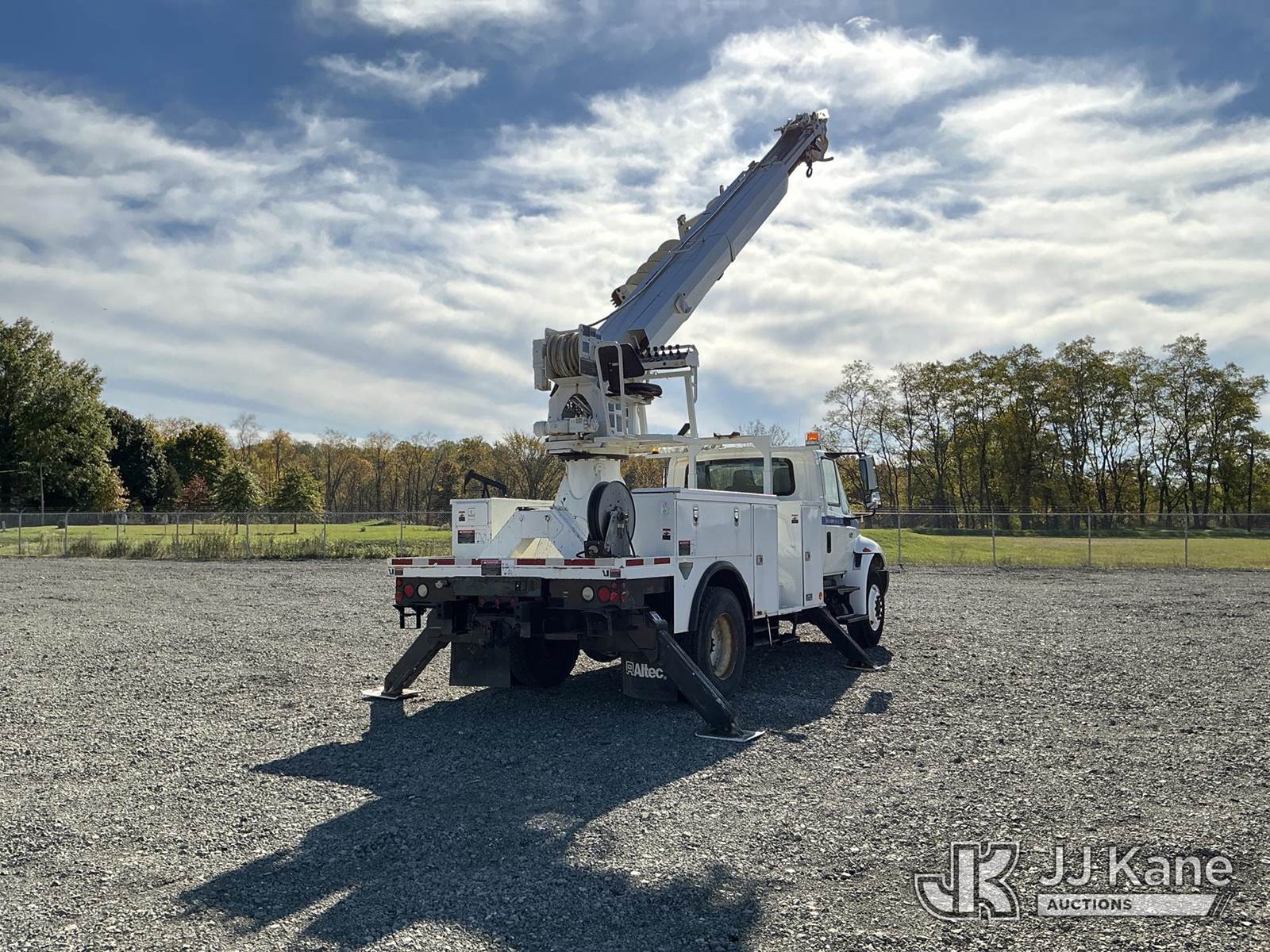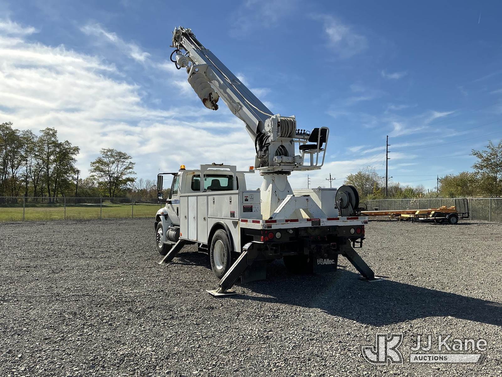 Altec DM47-TR, Digger Derrick s/n 0307DV2684, with 47 ft. sheave height, 3 section hyd boom, 2 spd digger, heel winch, pole guides, upper controls, riding console & 4 hyd outriggers, rear mounted on 2008 International 4300 Utility Truck, 7.6L L6 diesel, Auto, 4X2, A/C, (95,780 miles) (Runs & Moves, Upper Operates, Transmission Light On, ABS Light On, Hood Latch Missing, Rust Damage.) This is a Titled Item NOTE: This unit is being sold AS IS/WHERE IS via Timed Auction and is located in Louisville, OH. Inspection & preview days for this unit are the 2 business days prior to the first day of items closing for this auction, item is located at 3648 Beck Ave Louisville, OH 44641 and hours of operations are 8a-4p. For pre-sale questions, please contact Aaron Coleman @ (330) 495-4041 or aaron.coleman@jjkane.com. (Manuals provided in cab) (Buyer is responsible for removal. Assistance by consignor or JJ Kane Auctioneers is not assured.)