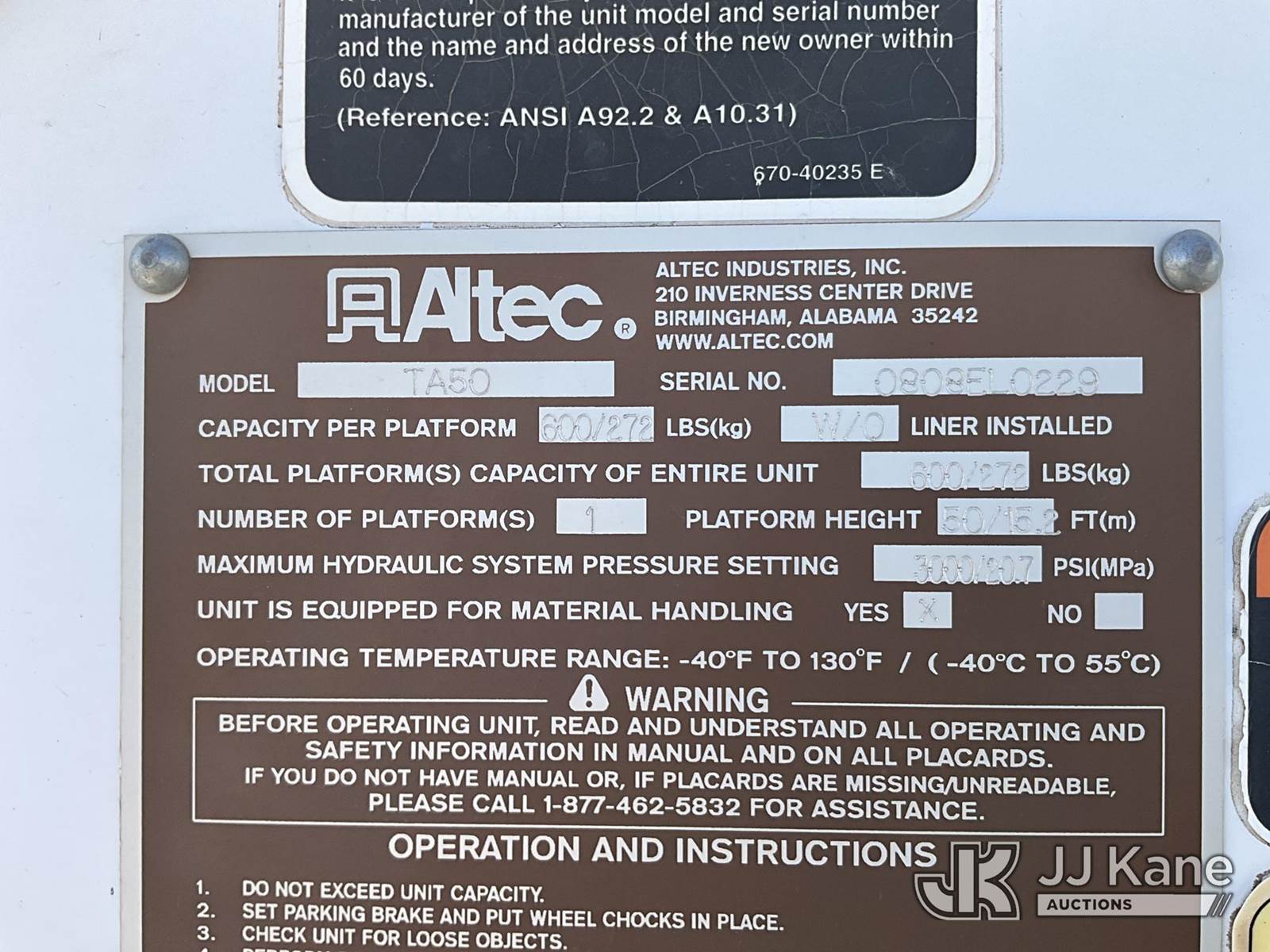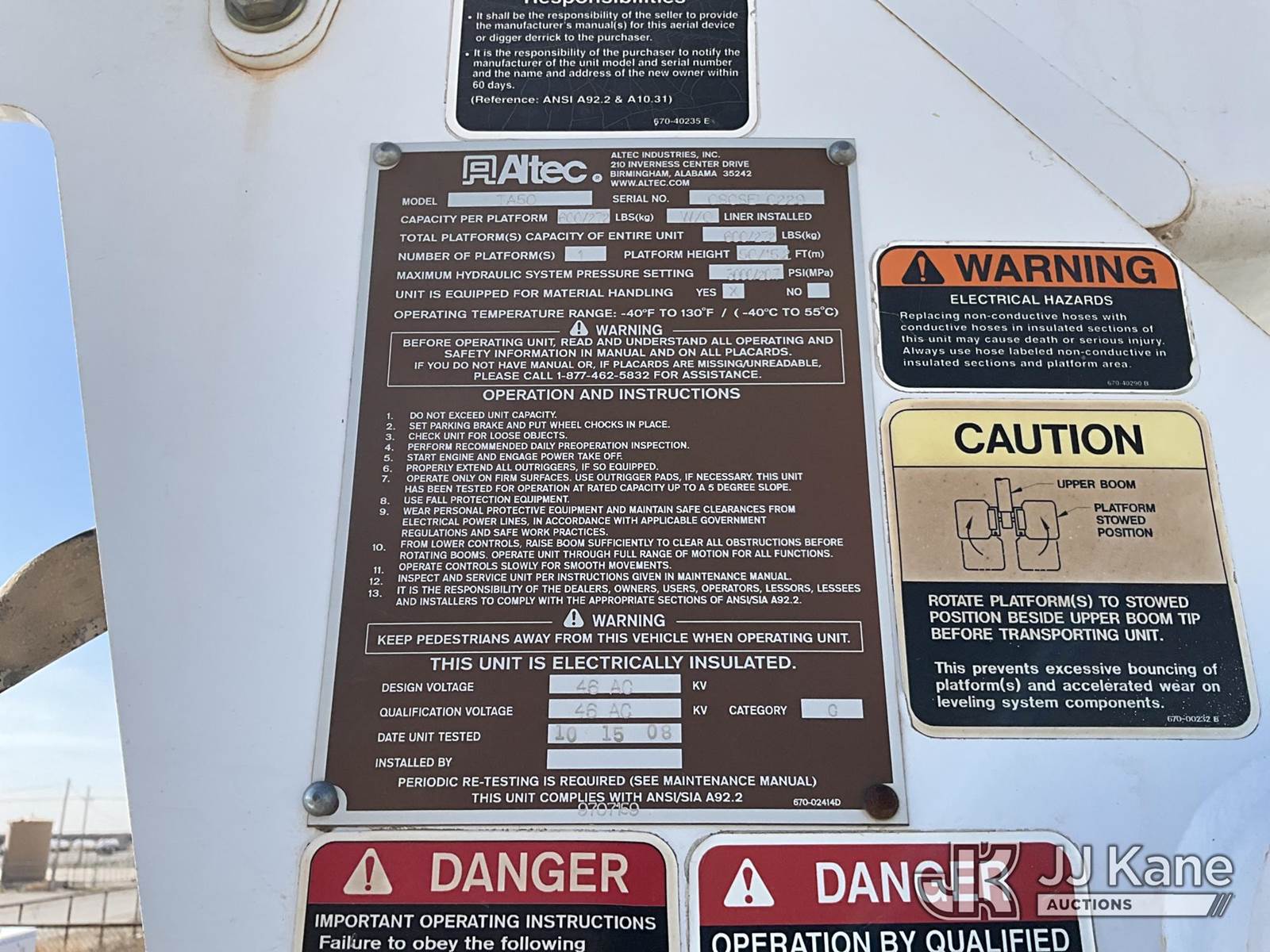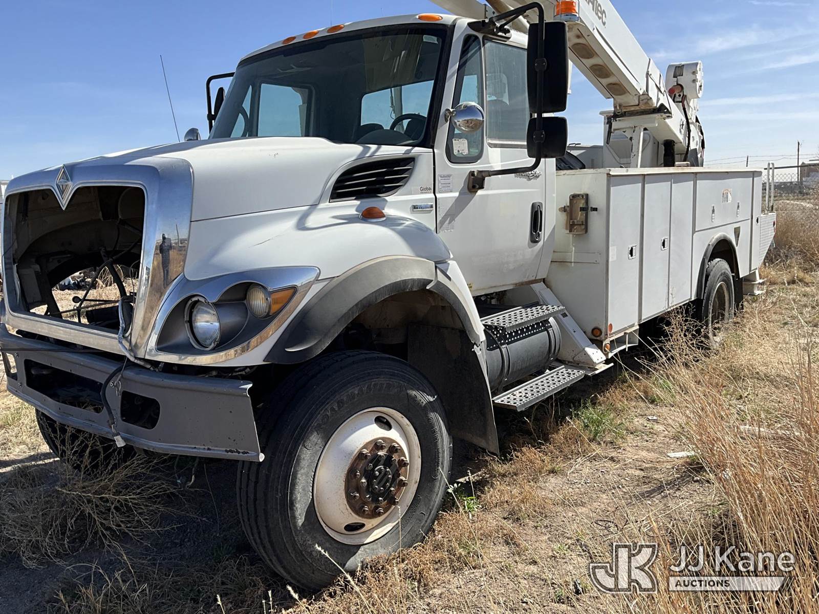 Altec TA50, 55 ft, Articulating & Telescopic Material Handling Bucket Truck s/n 0808EL0229, with two-man bucket, mounted behind cab on 2008 International 7300 Utility Truck, 7.6L diesel, 4X4, A/C, True Mileage Unknown (Not Running, Condition Unknown) (Seller States: Does Not Star/Run, Motor Disassembled, Needs Major Motor Work) This is a Titled Item NOTE: This unit is being sold AS IS/WHERE IS via Timed Auction and is located in Artesia, NM. For pre sale questions, please contact the JJ Kane Account Manager, EJ Brown, at (915) 341 2565. For load out and pick up information, please refer to the release form provided after purchase. (Missing manuals, See Auction Company for Manufacturers Information to obtain manuals) (Buyer is responsible for removal. Assistance by consignor or JJ Kane Auctions is not assured.)
