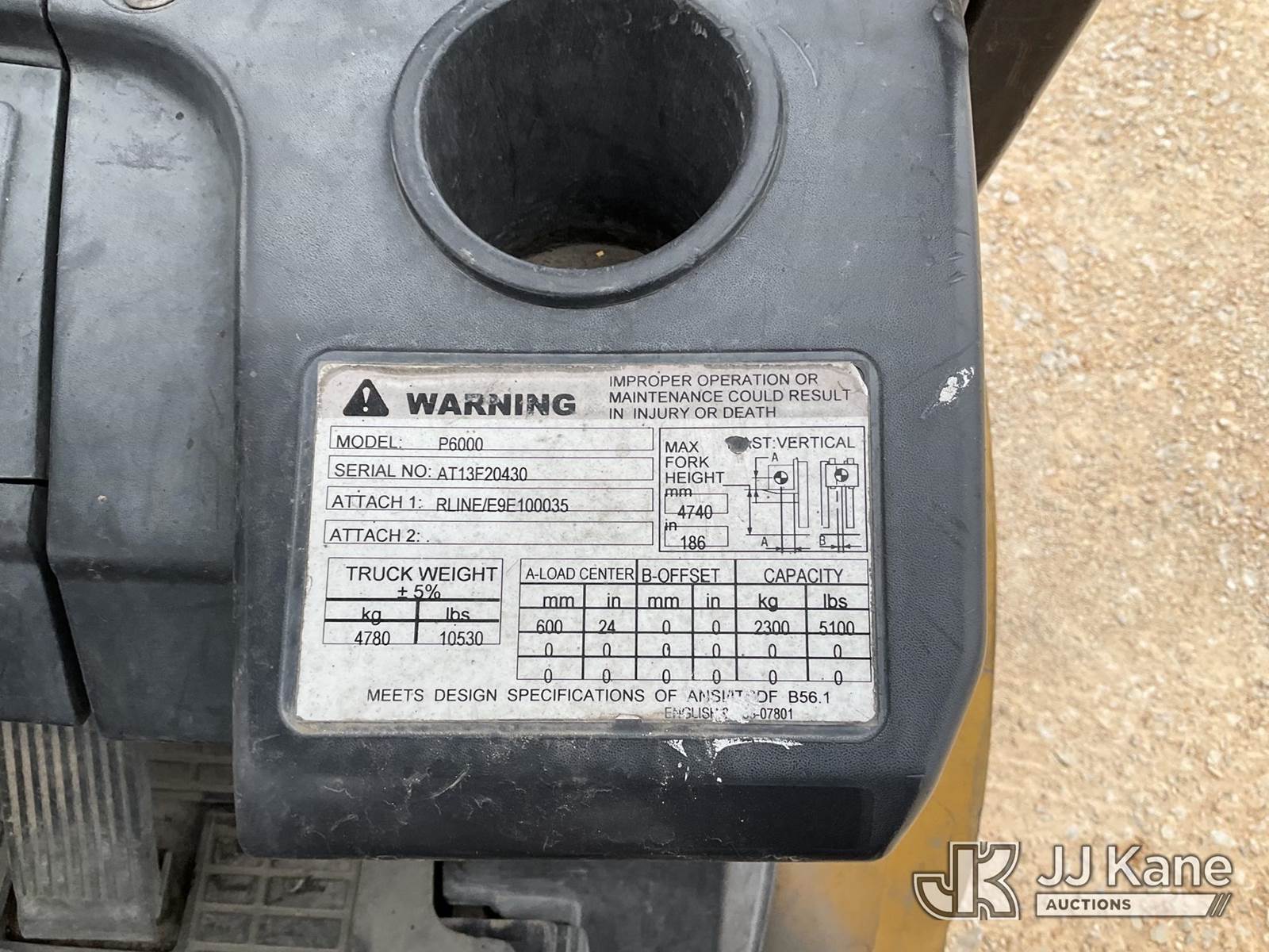 2008 Caterpillar P6000 Pneumatic Tired Forklift, s/n AT13F20430, 2.5L Shuttle, LPG, with 5100lbs capacity, 186in fork height, (Runs, Moves, & Operates) (Reads 9,936 hours) NOTE: This unit is being sold AS IS/WHERE IS via Timed Auction and is located in Marion, TX. Inspection & preview days for this unit are the 2 business days prior to the first day of items closing for this auction, item is located at 3292 S Santa Clara Rd Marion, TX 78124 and hours of operations are 8a-4p. For pre-sale questions, please contact Brian Jarrell @ 210-540-3147. (Buyer is responsible for removal. Assistance by consignor or JJ Kane Auctions is not assured.)