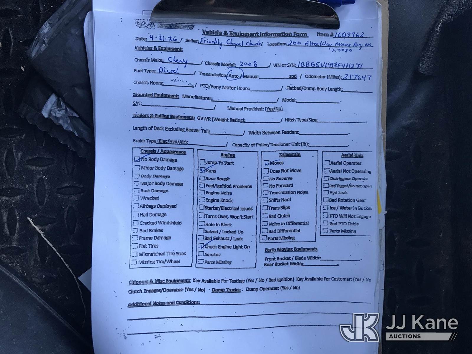 2008 Chevrolet C5500 Passenger Bus, 6.6L 4X2, DIESEL, Auto, A/C, (217,647 miles) ((Runs & Moves) (Check Engine Light On, ABS Light On)) This is a Titled Item NOTE: This unit is being sold AS IS/WHERE IS via Timed Auction and is located in Mount Airy, NC. Inspection & preview days for this unit are by appointment only; please contact us at contact@jjkane.com or 84-Go-JJKane for more details. (Buyer is responsible for removal. Assistance by consignor or JJ Kane Auctions is not assured.)
