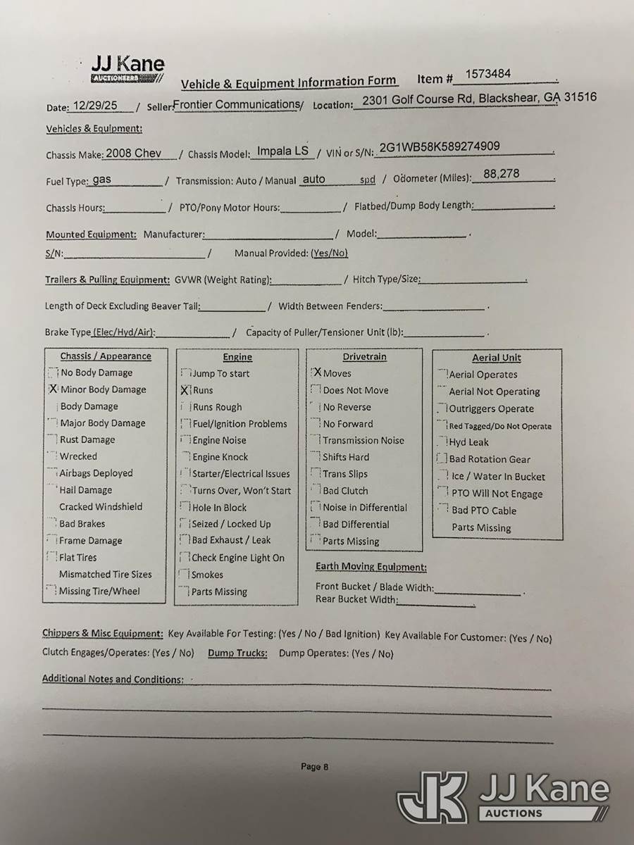 2008 Chevrolet Impala LS 4-Door Sedan, 3.5L V6 OHV 16V FFV gas, 4-Speed Automatic, FWD, A/C, (88,278 miles) (Runs & Moves) (Body/Paint Damage) This is a Titled Item NOTE: This unit is being sold AS IS/WHERE IS via Timed Auction and is located in Blackshear, GA. Inspection & preview days for this unit are by appointment only; please contact us at contact@jjkane.com or 84-Go-JJKane for more details. (Buyer is responsible for removal. Assistance by consignor or JJ Kane Auctions is not assured.)