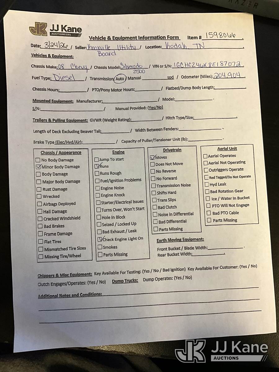 2008 Chevrolet Silverado 2500HD Pickup Truck, 6.6L diesel, RWD, 6-Speed Automatic, A/C, (204,904 miles) (Runs & Moves) (Check Engine Light On, Minor Body Damage) This is a Titled Item NOTE: This unit is being sold AS IS/WHERE IS via Timed Auction and is located in Kodak, TN. Inspection & preview days for this unit are by appointment only; please contact us at contact@jjkane.com or 84-Go-JJKane for more details. (Buyer is responsible for removal. Assistance by consignor or JJ Kane Auctions is not assured.)