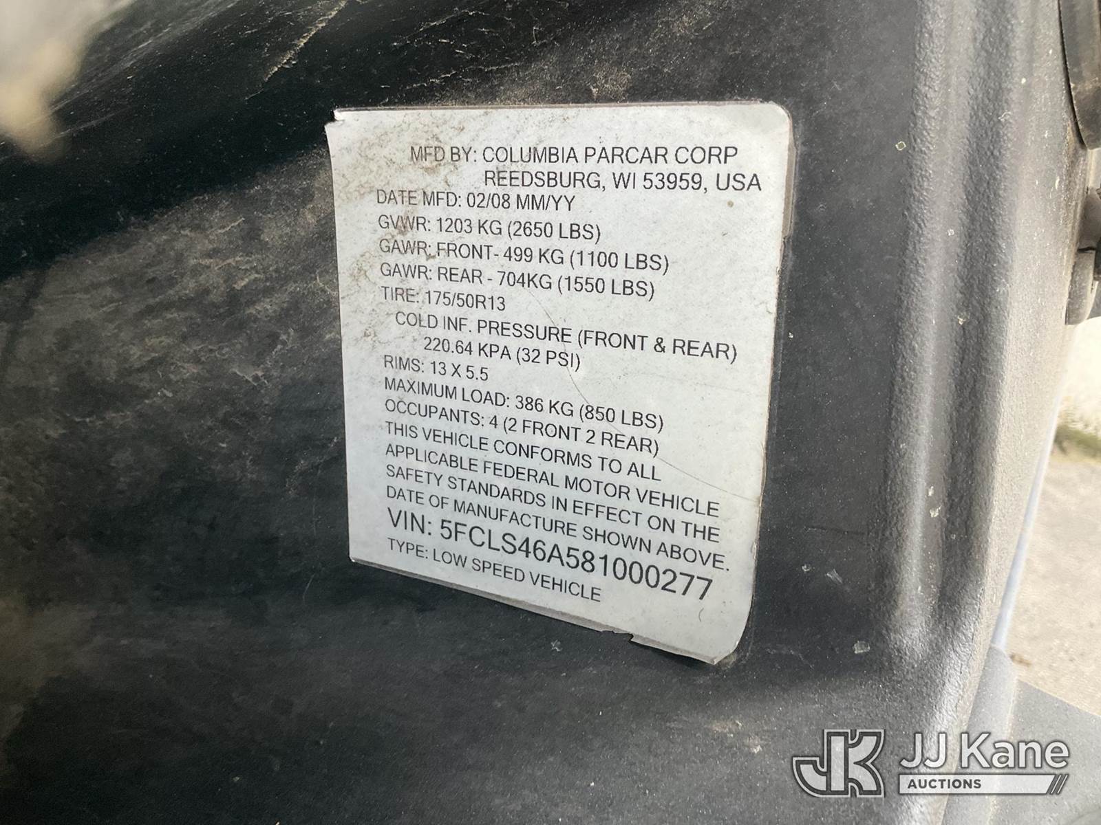 2008 Columbia Utility Cart, s/n 5FCLS46A581000277, (Not Running, Condition Unknown) (No Key) (Reads 5,878 hours) (Bidding Restricted to Licensed Vehicle Dealers Only), This is a Titled Item NOTE: This unit is being sold AS IS/WHERE IS via Timed Auction and is located in Jurupa Valley, CA. Inspection & preview days for this unit are the 2 business days prior to the first day of items closing for this auction, item is located at 4510 Muth Way Jurupa Valley, CA 92509 and hours of operations are 8a-4p. For pre-sale questions, please contact please contact Office Staff @ (310) 353-7140. Dealer License Number 45696. (Buyer is responsible for removal. Assistance by consignor or JJ Kane Auctions is not assured.)