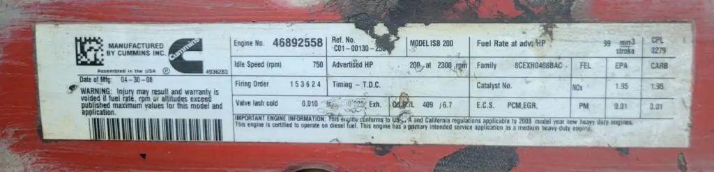 ISB, 6.7L, CM2150; 200 HP; S/N 46892558; CPL 279; DOM 2008