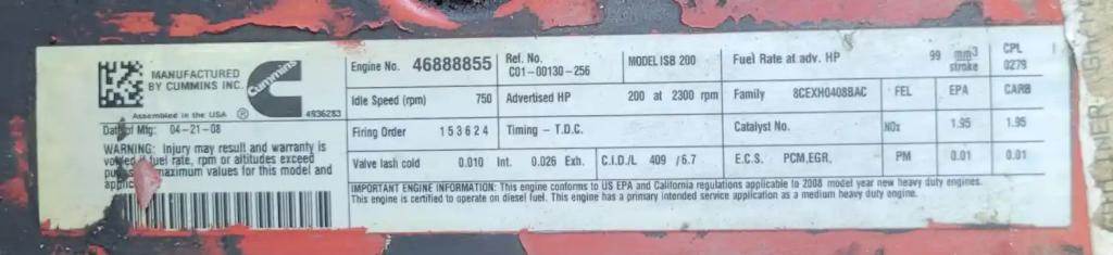 ISB, 6.7L, CM2150; 200 HP; S/N 46888855; CPL 0279; DOM 2008
