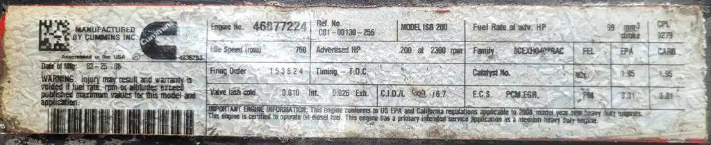 ISB, 6.7L, CM2150; 200 HP; S/N 46877224; CPL 0279; DOM 2008
