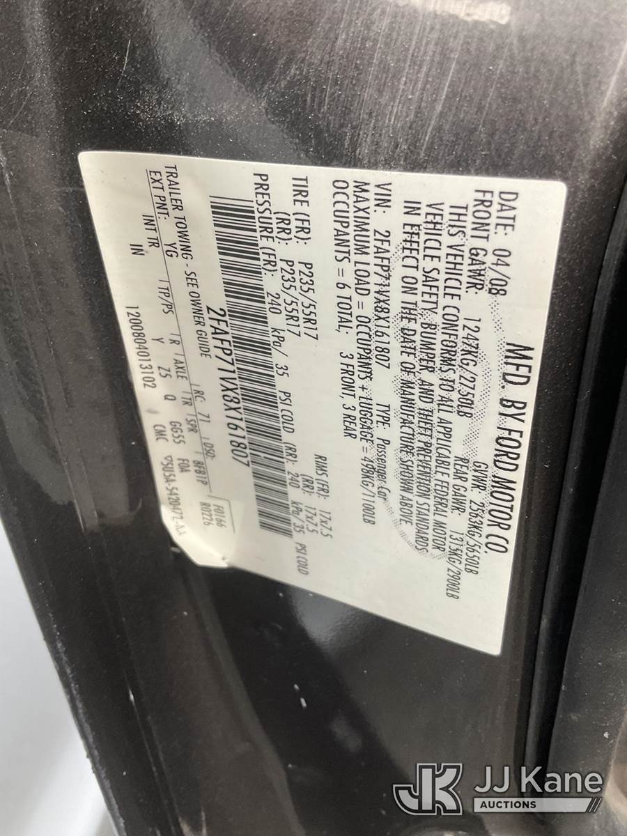 2008 Ford Crown Victoria Police Interceptor 4-Door Sedan, s/n 2FAFP71VX8X161807, 8-cyl gas, 4-Speed Automatic, True Mileage Unknown (Not Running, Condition Unknown) (Engine Turns Over, Missing Computer, Missing Headlights, Engine Light On) (Bidding Restricted to Licensed Vehicle Dealers Only), This is a Titled Item NOTE: This unit is being sold AS IS/WHERE IS via Timed Auction and is located in Jurupa Valley, CA. Inspection & preview days for this unit are the 2 business days prior to the first day of items closing for this auction, item is located at 4510 Muth Way Jurupa Valley, CA 92509 and hours of operations are 8a-4p. For pre-sale questions, please contact please contact Office Staff @ (310) 353-7140. Dealer License Number 45696. (Buyer is responsible for removal. Assistance by consignor or JJ Kane Auctions is not assured.)