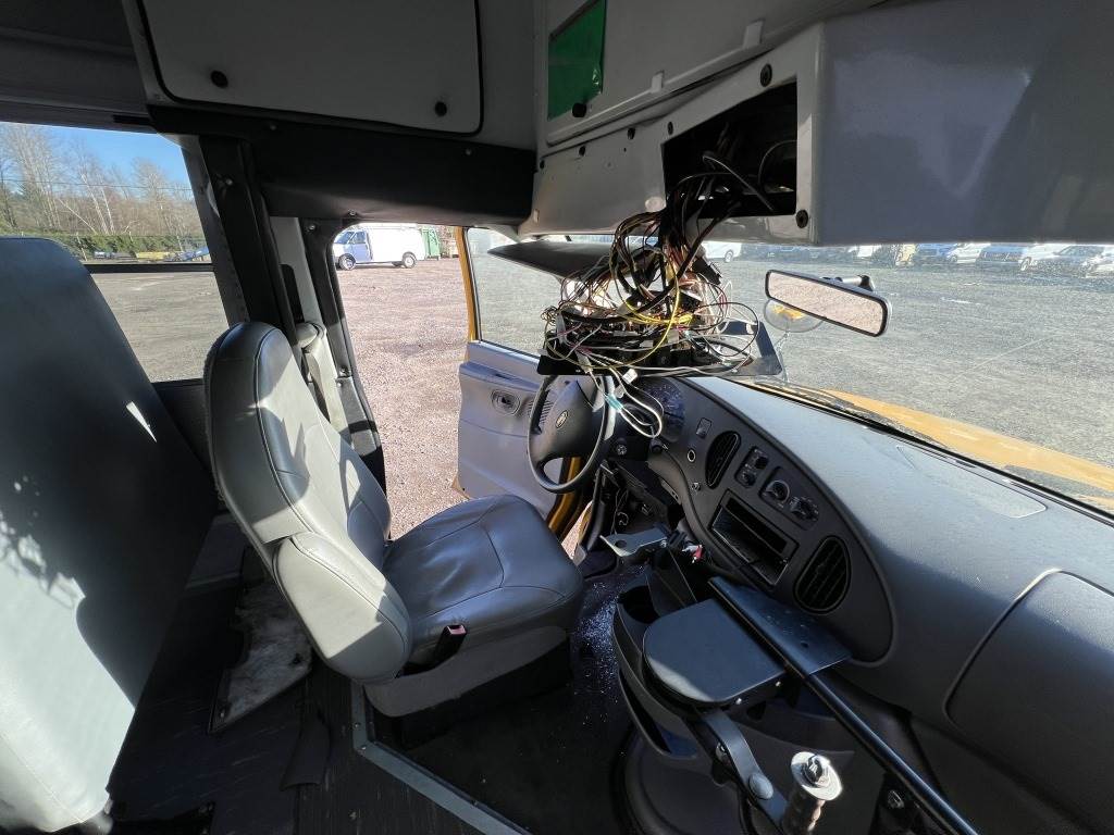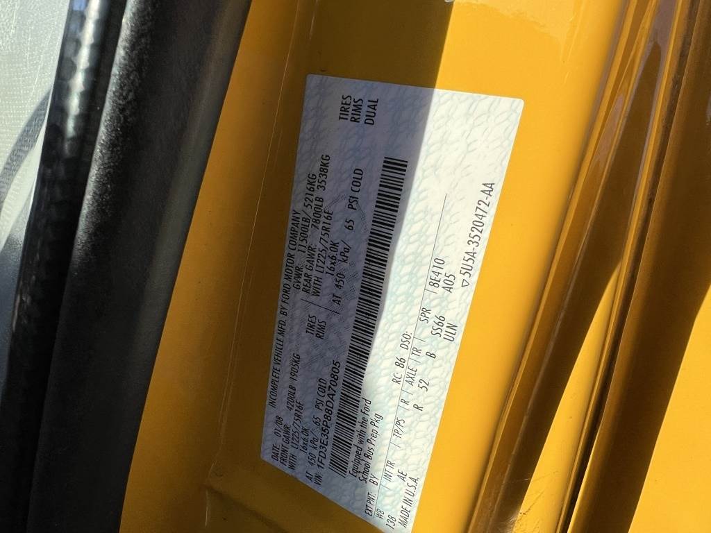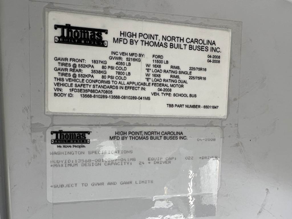 Location: Washougal WA ***City Government Surplus*** VIN: 1FD3E35P88DA70805 Engine: 6.0L 8cyl Diesel Transmission: Automatic *Non-operational - cannot verify mileage, no key, no ignition, bent driveshaft* Thomas Built bus body, A/C, spring suspension, spring suspension, LT225/75R16 tires.